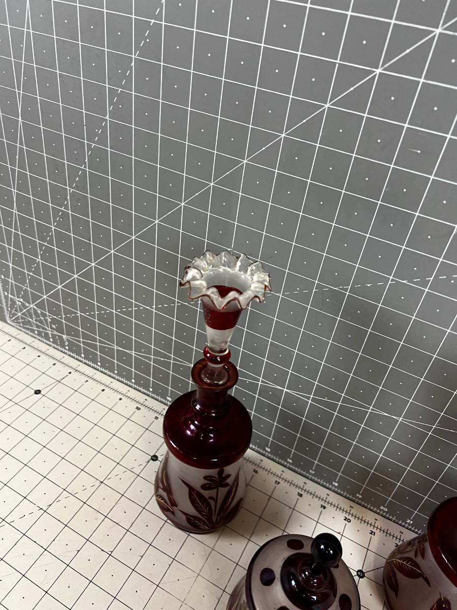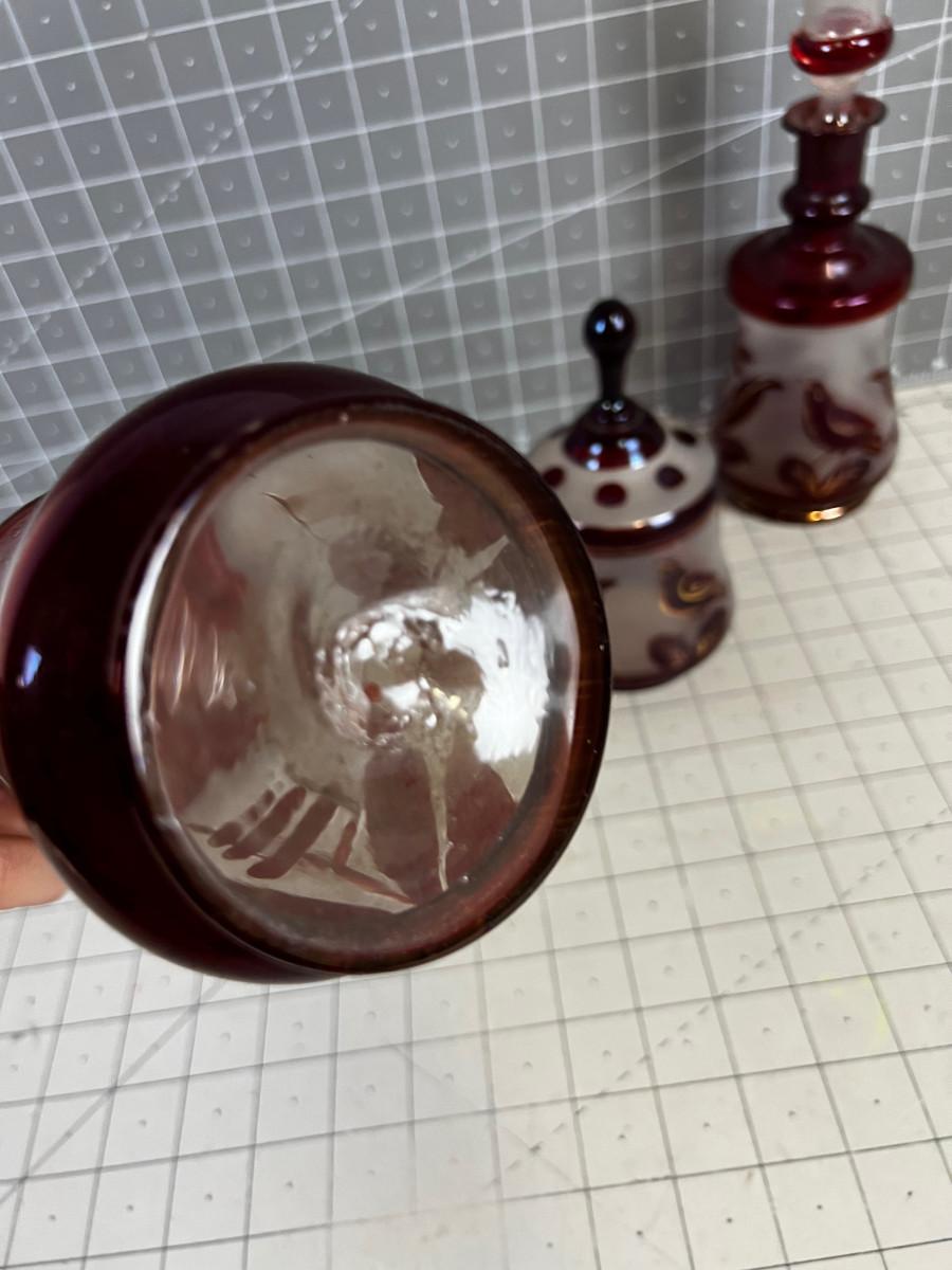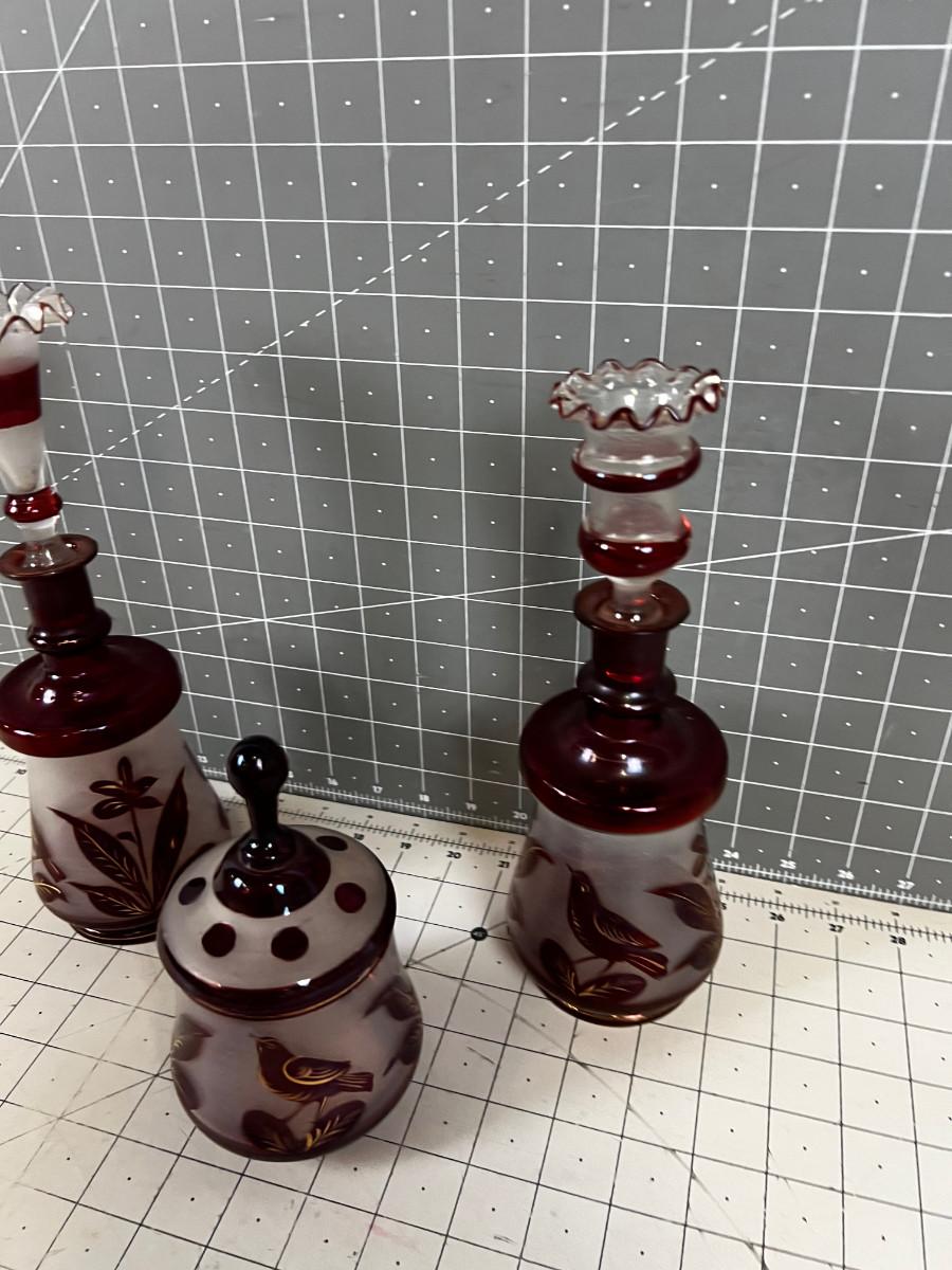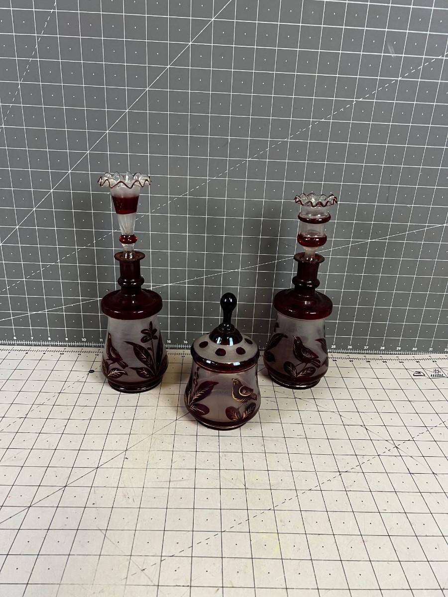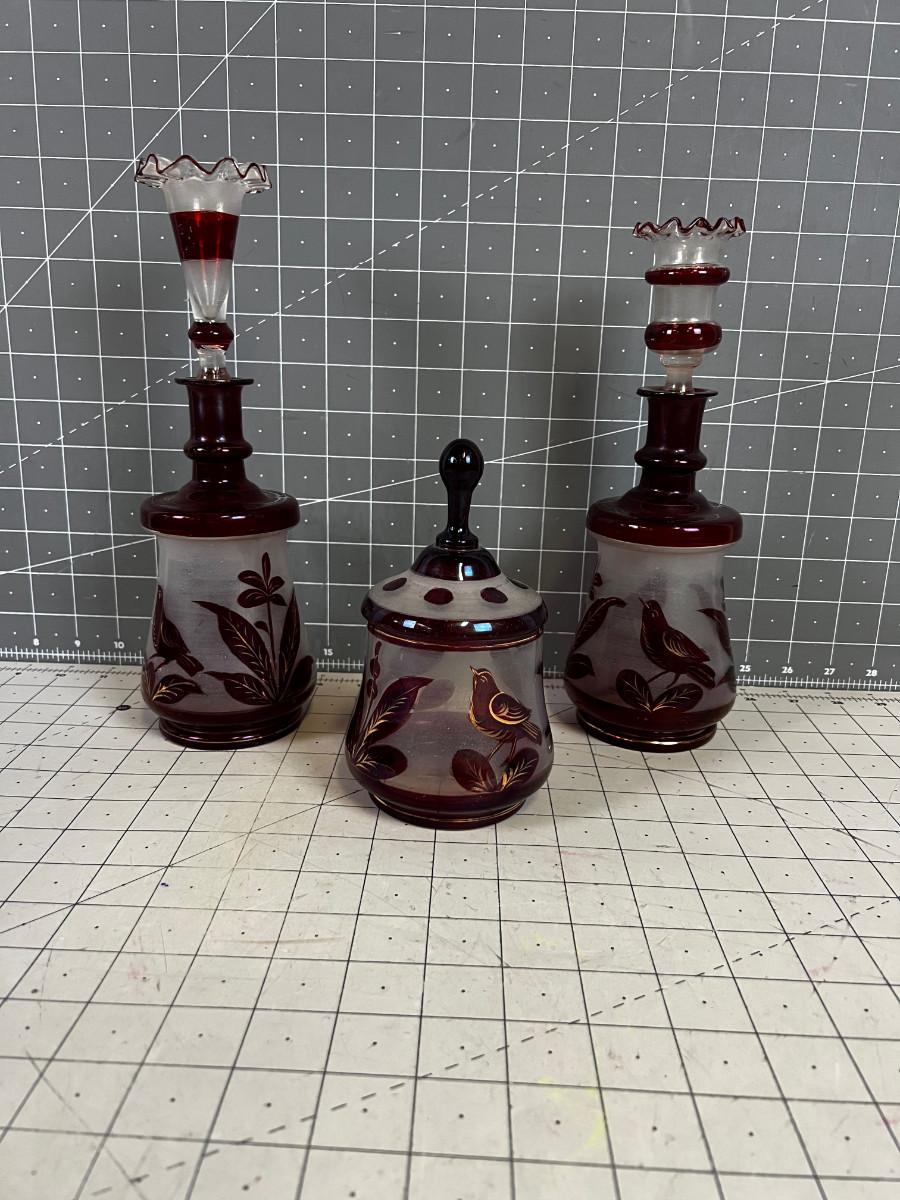 Czechoslovakian 3 Piece Ruby Red Glass Dressing Set: Bird Design