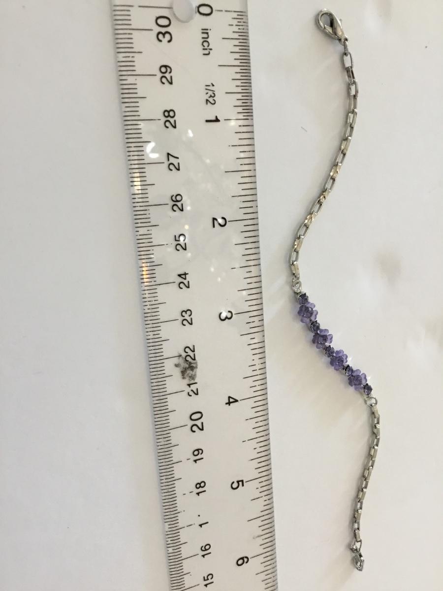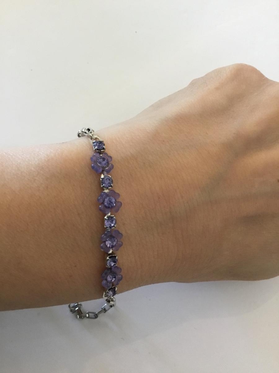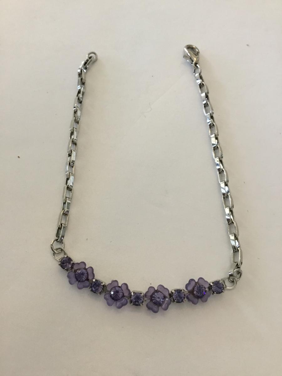Dainty silver toner, purple flower, rhinestone bracelet