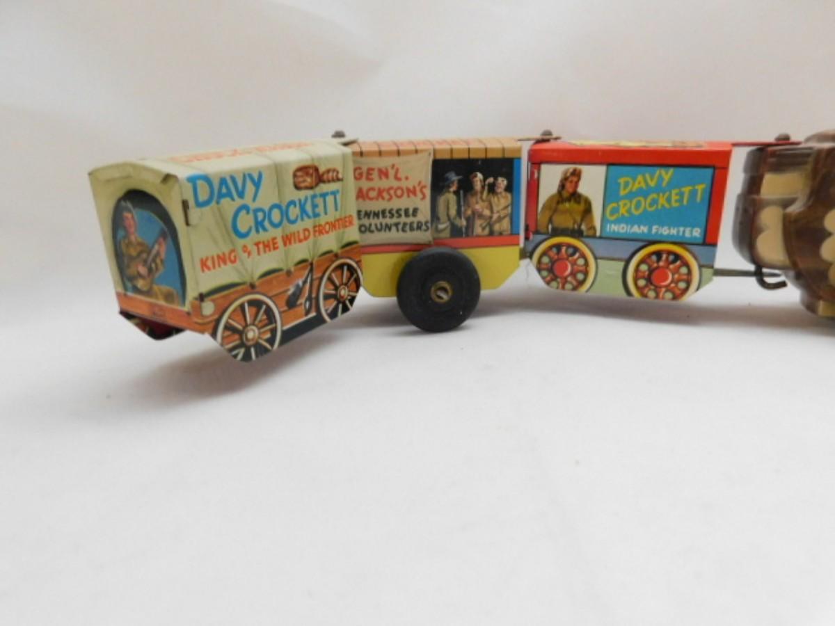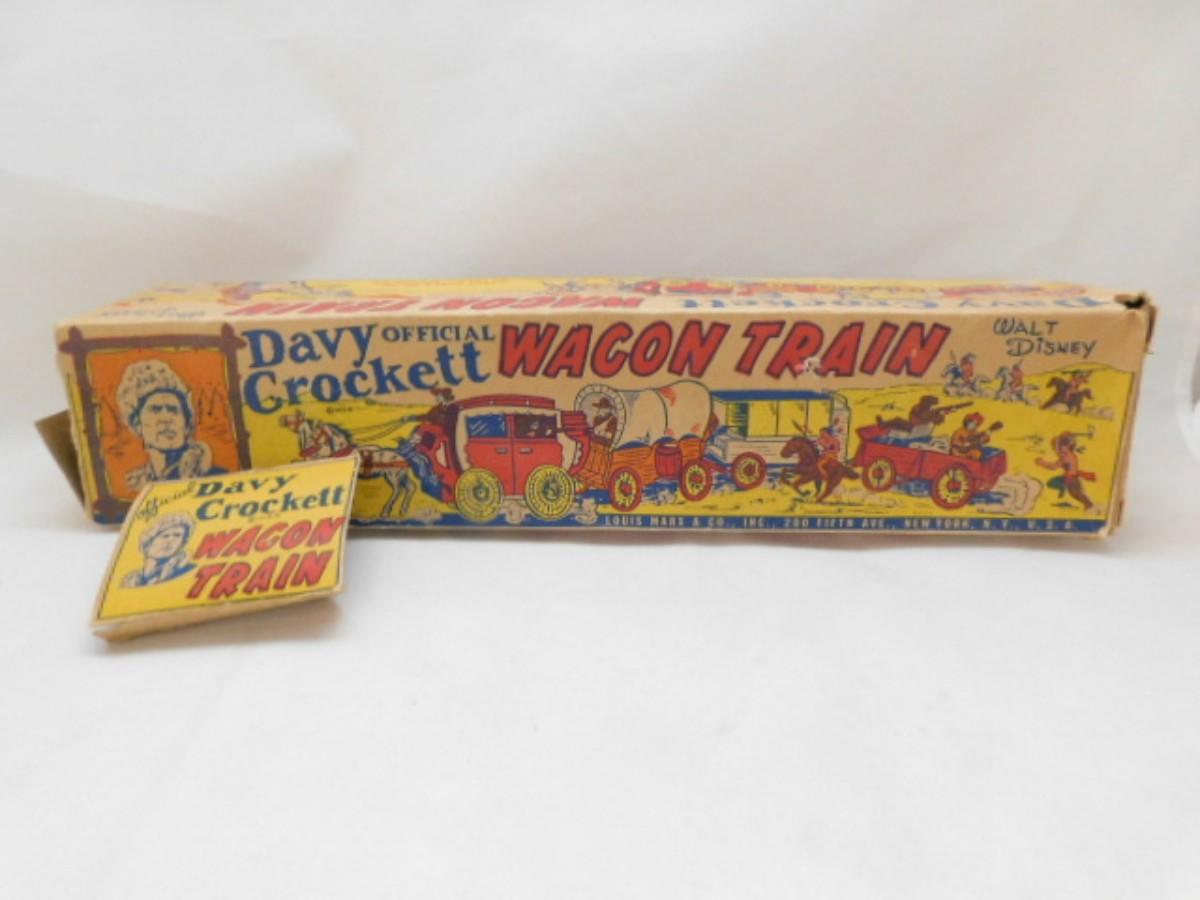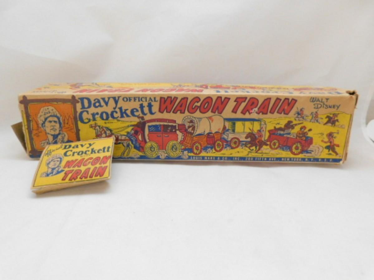 Vintage 1950's Marx Wind-Up Disney Davey Crockett Wagon Train Mechanical Toy with Original Box. Box has good color but flap is torn as shown. Toy appears to be in working condition.