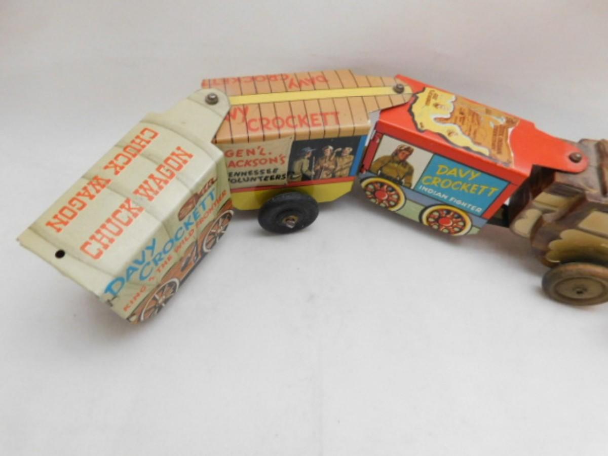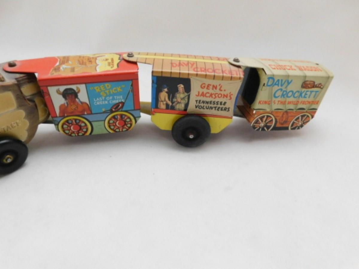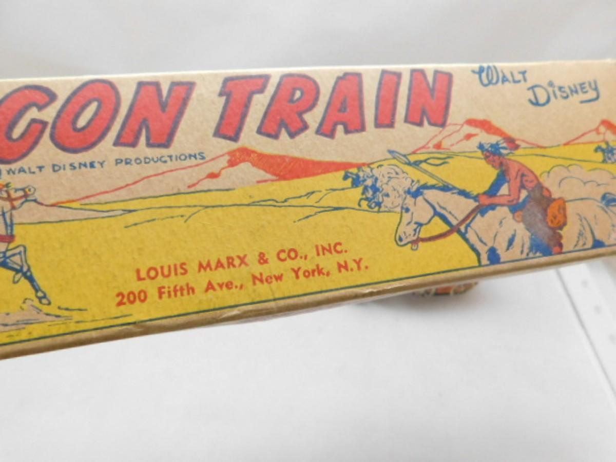 Vintage 1950's Marx Wind-Up Disney Davey Crockett Wagon Train Mechanical Toy with Original Box. Box has good color but flap is torn as shown. Toy appears to be in working condition.