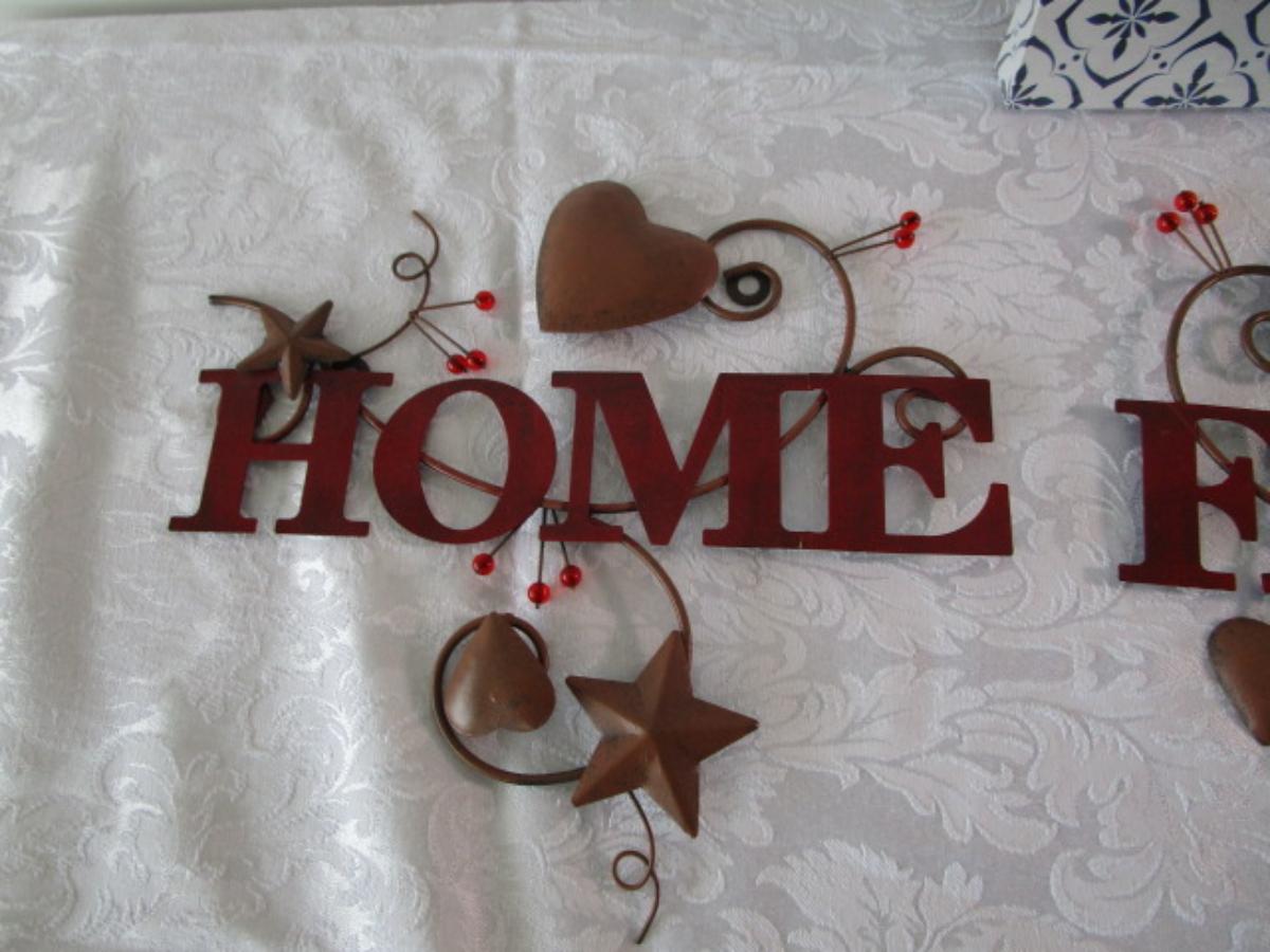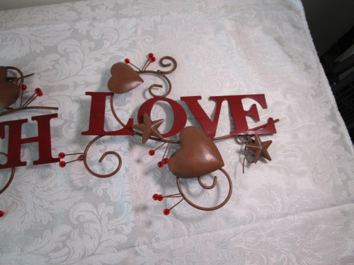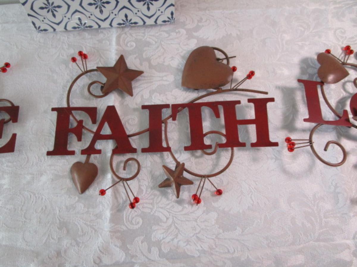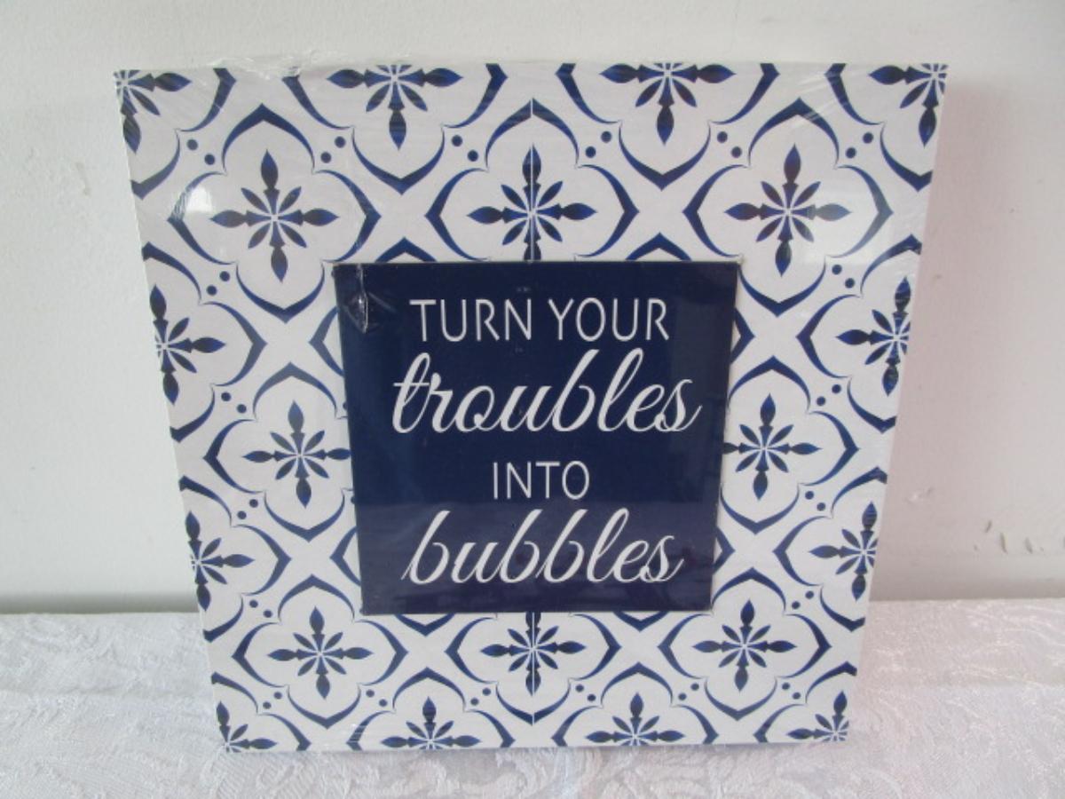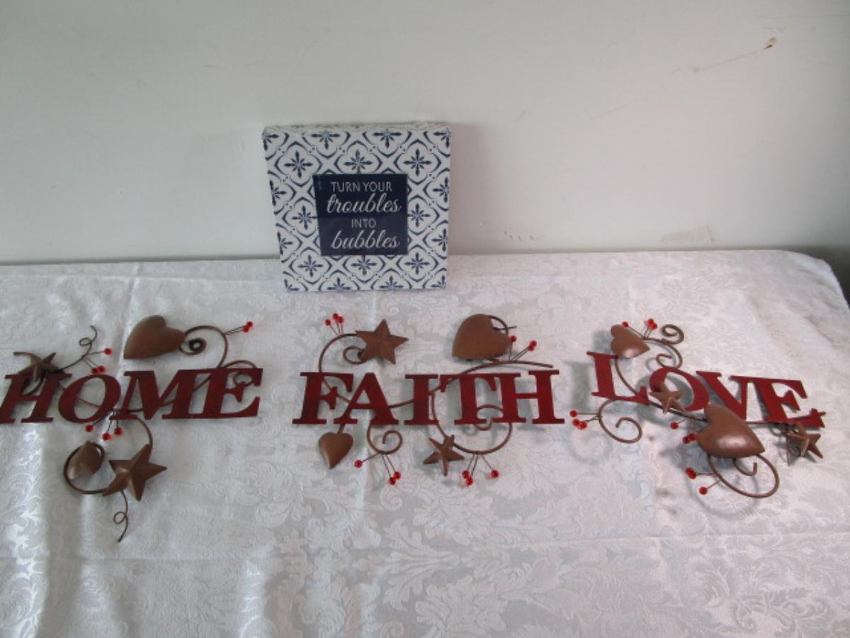 1 sign has "Turn Your Troubles Into Bubbles" 8" x8", 3 metal signs with "Love, Faith, Home" 11-1/2" x 9"
