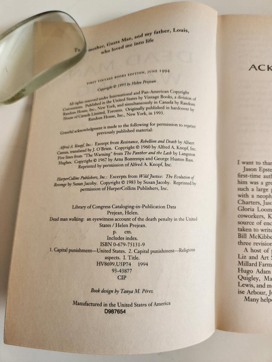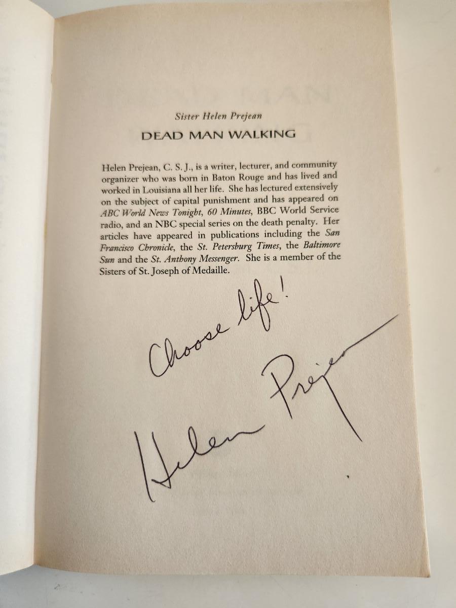 This auction lot is for a copy of the book Dead Man Walking by Helen Prejean - Autographed by the author. This is the paperback Vintage/Random House edition of 1994. This book was made into a movie starring Susan Sarandon and Sean Penn. The book is in very good condition with the pages showing the yellowing of the pages from shelf age.