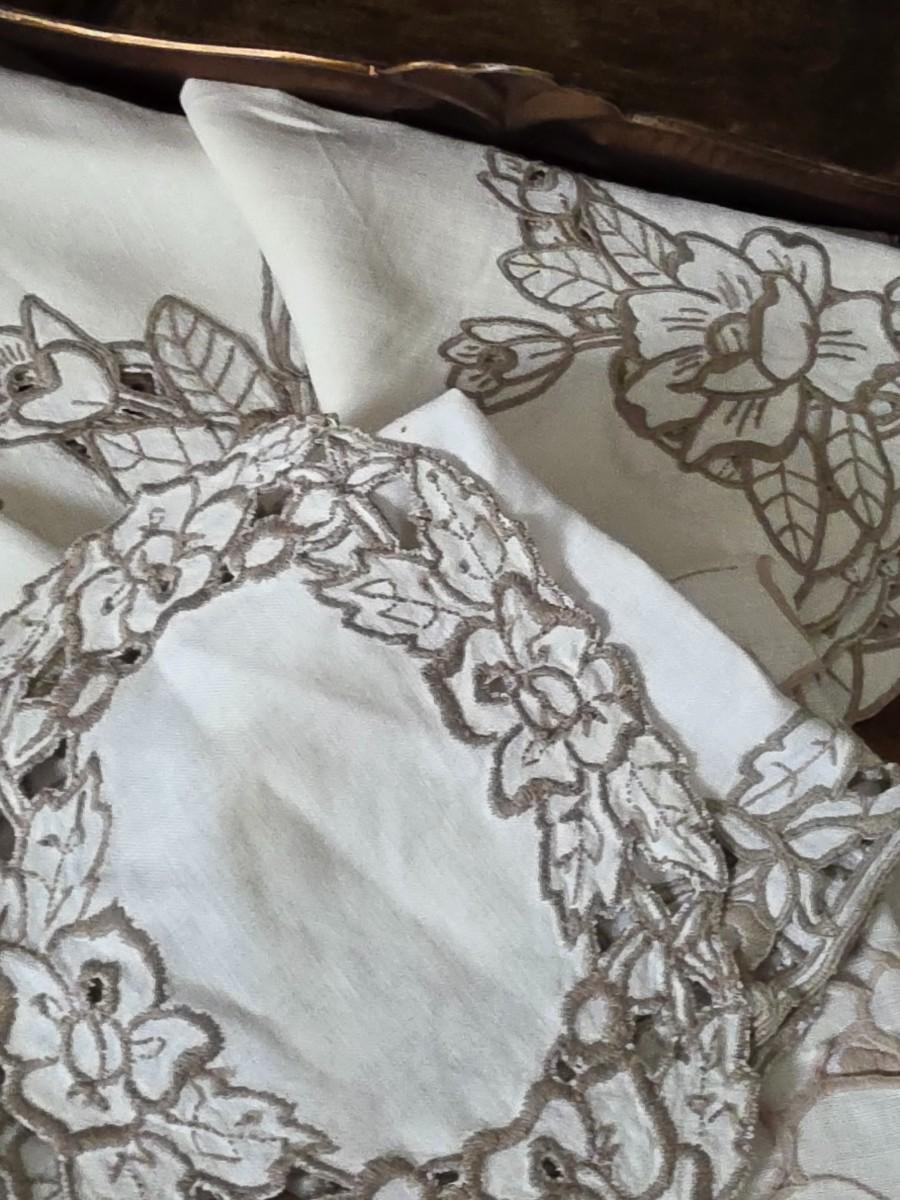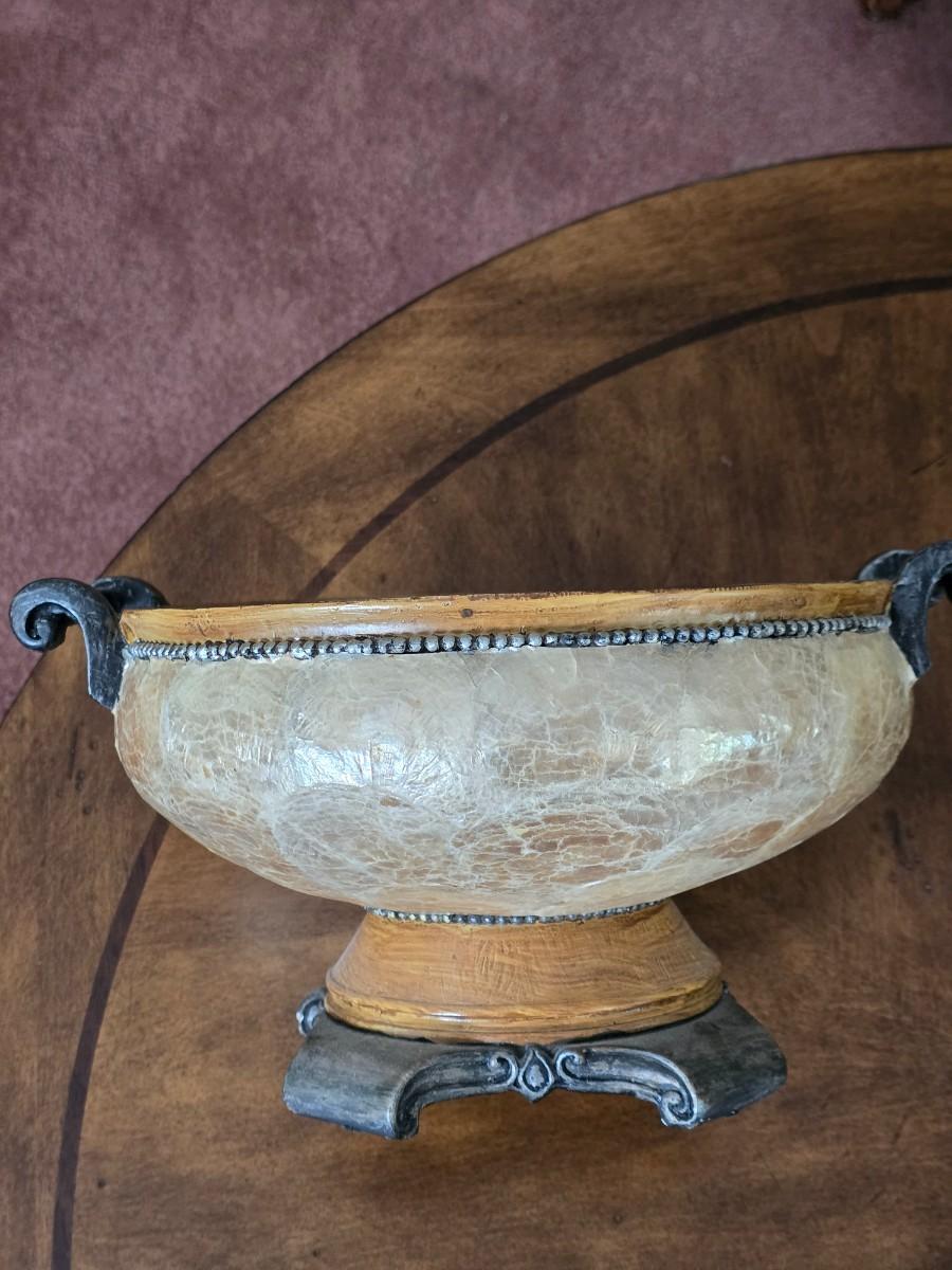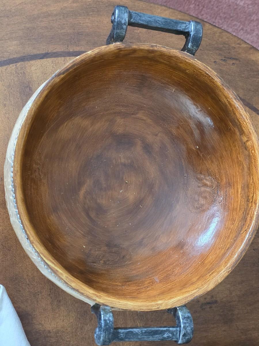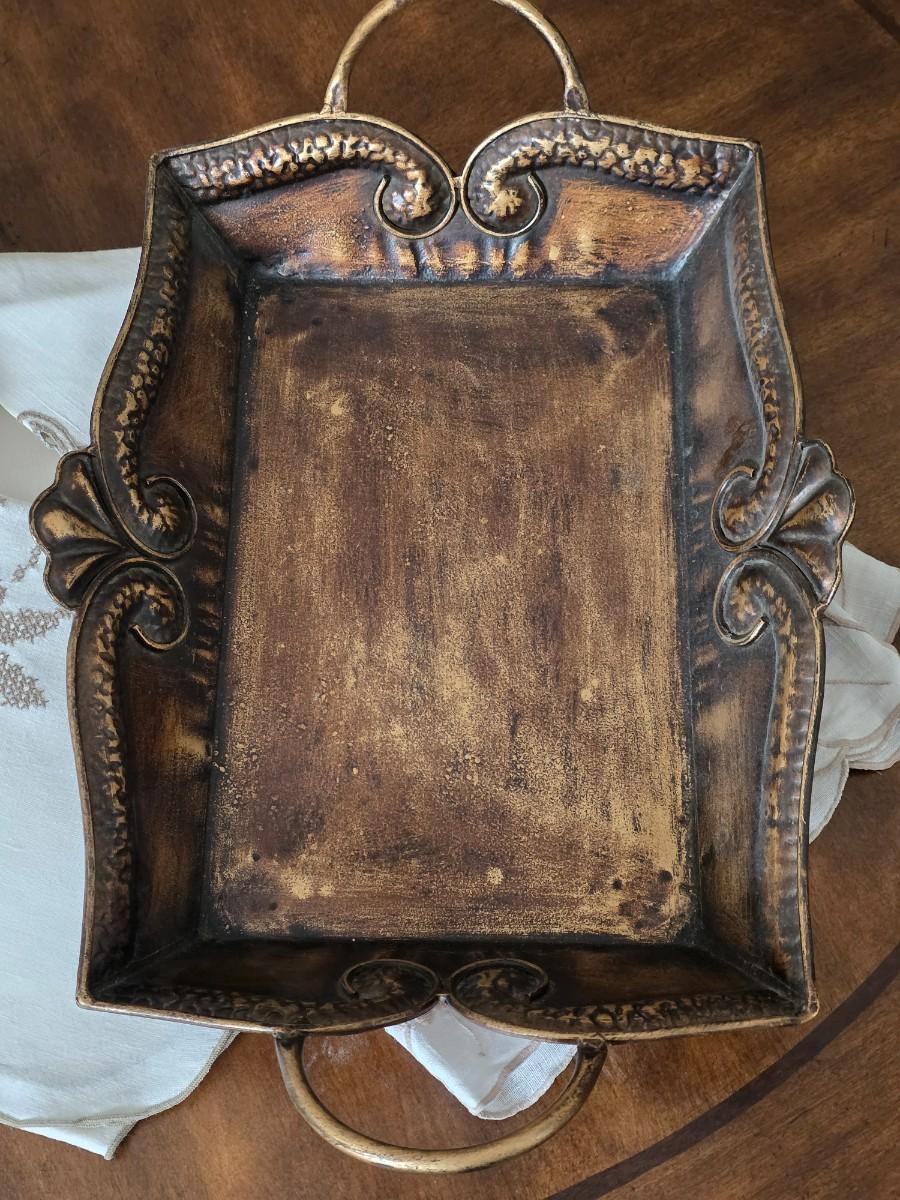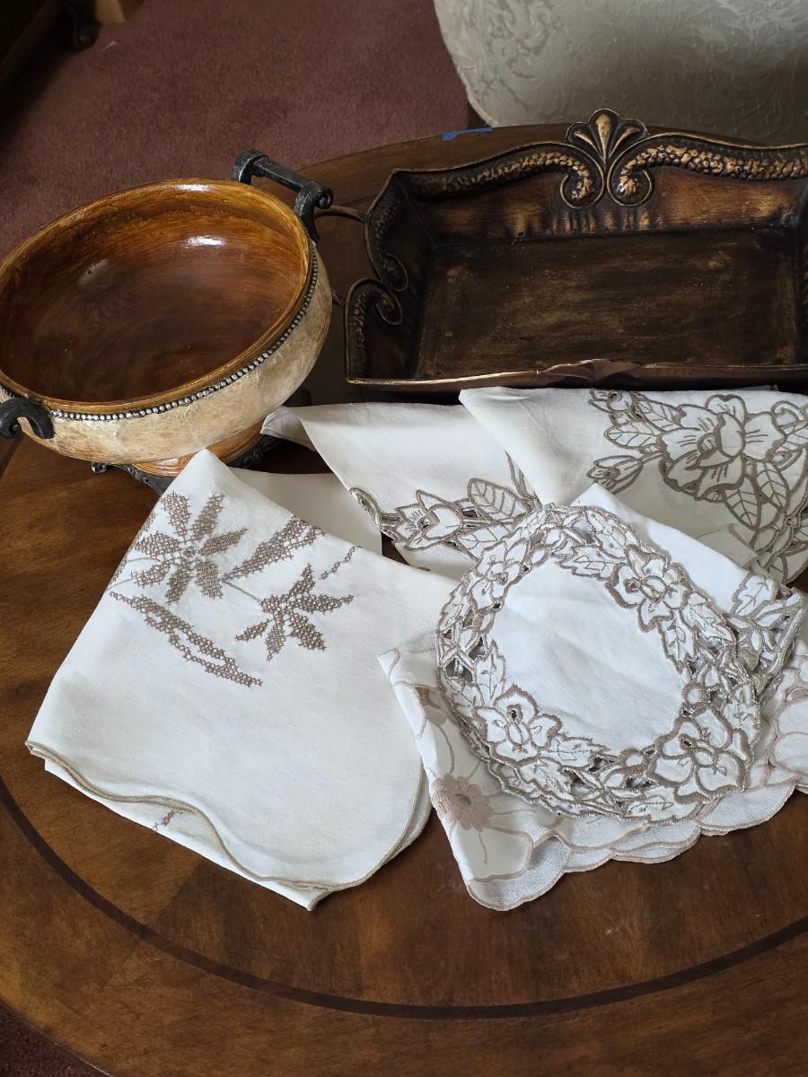 Two great decor pieces, large handled bowl and metal tray. Beautiful handmade linen and other linen.