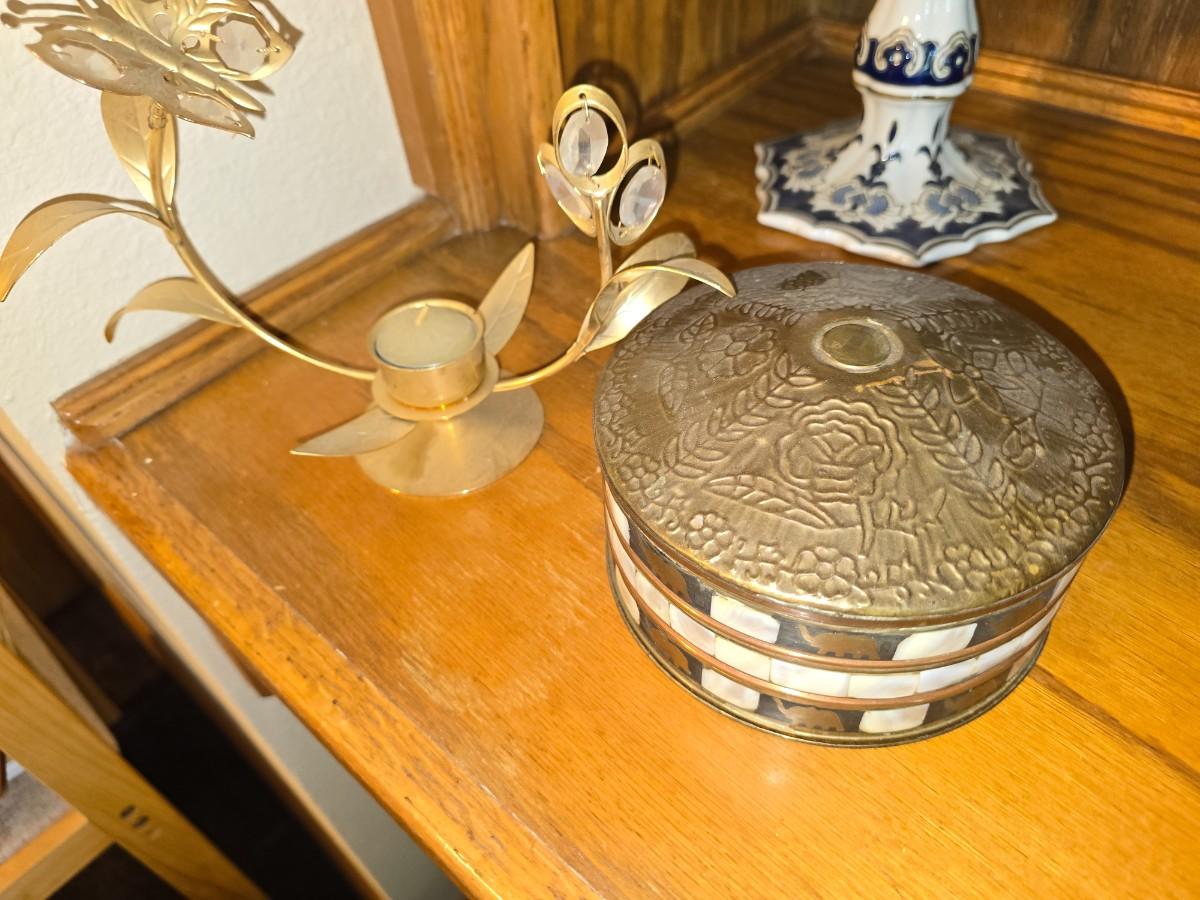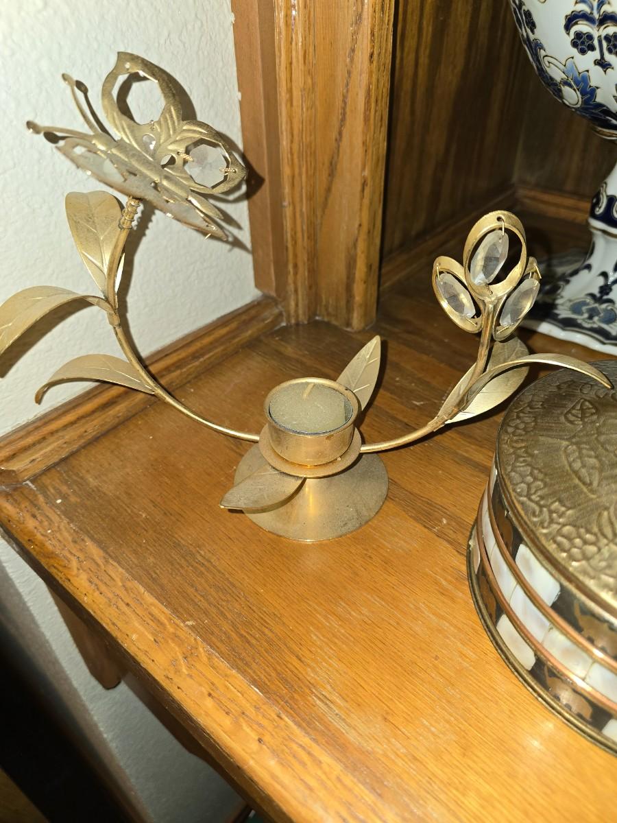 Butterfly candle holder 9 inches wide and 7 tall. Tin is 6 inches diameter.