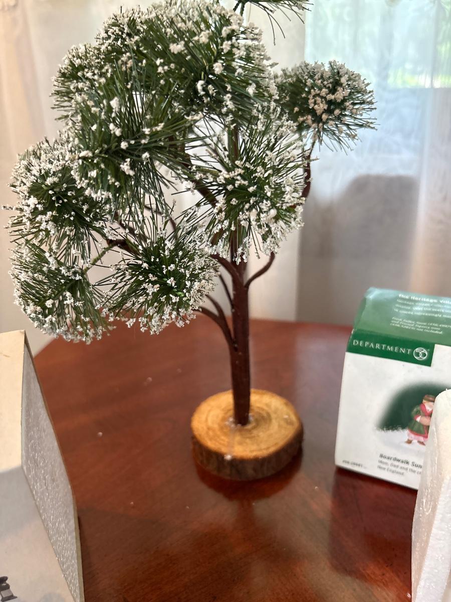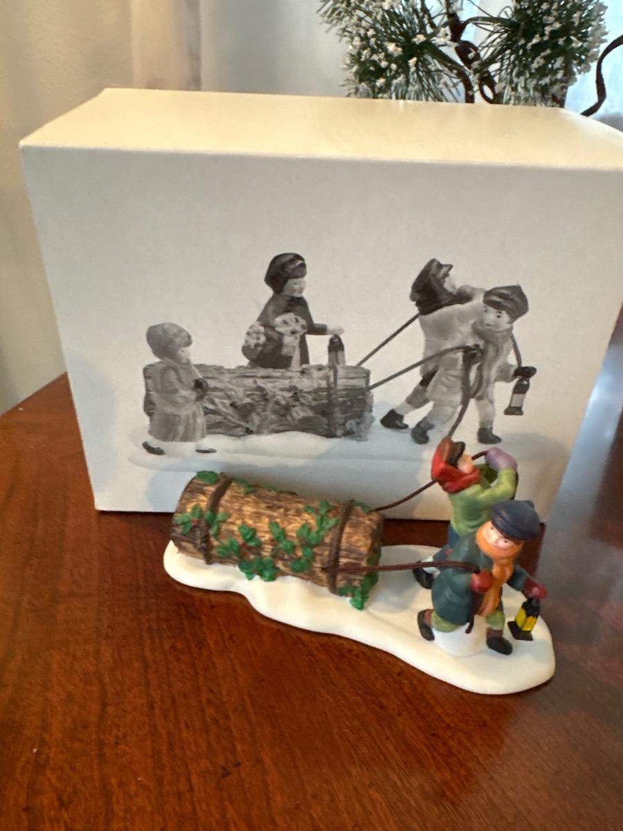 Department 56 figurines, and mailbox in original packaging. Includes four trees.