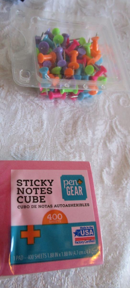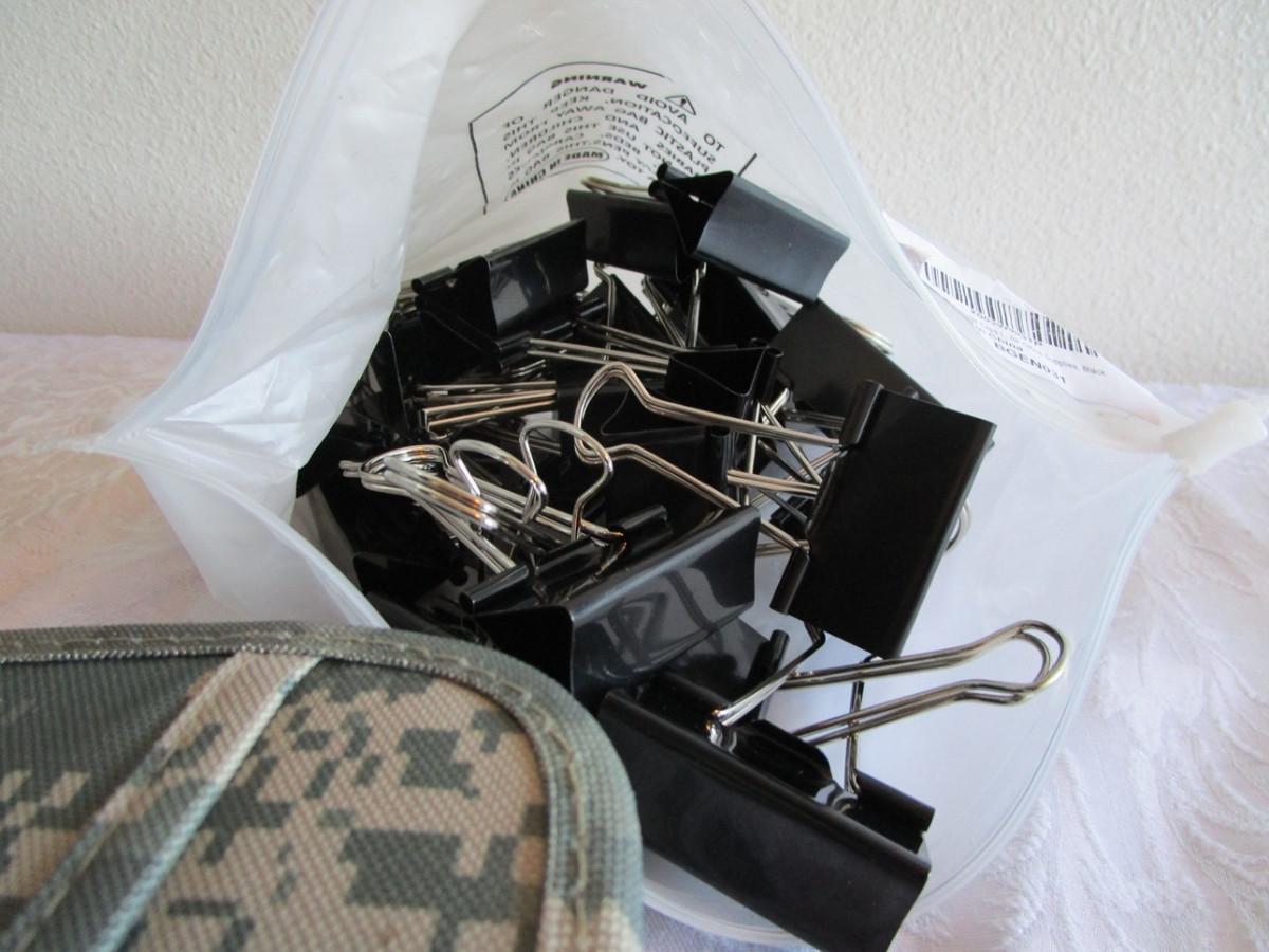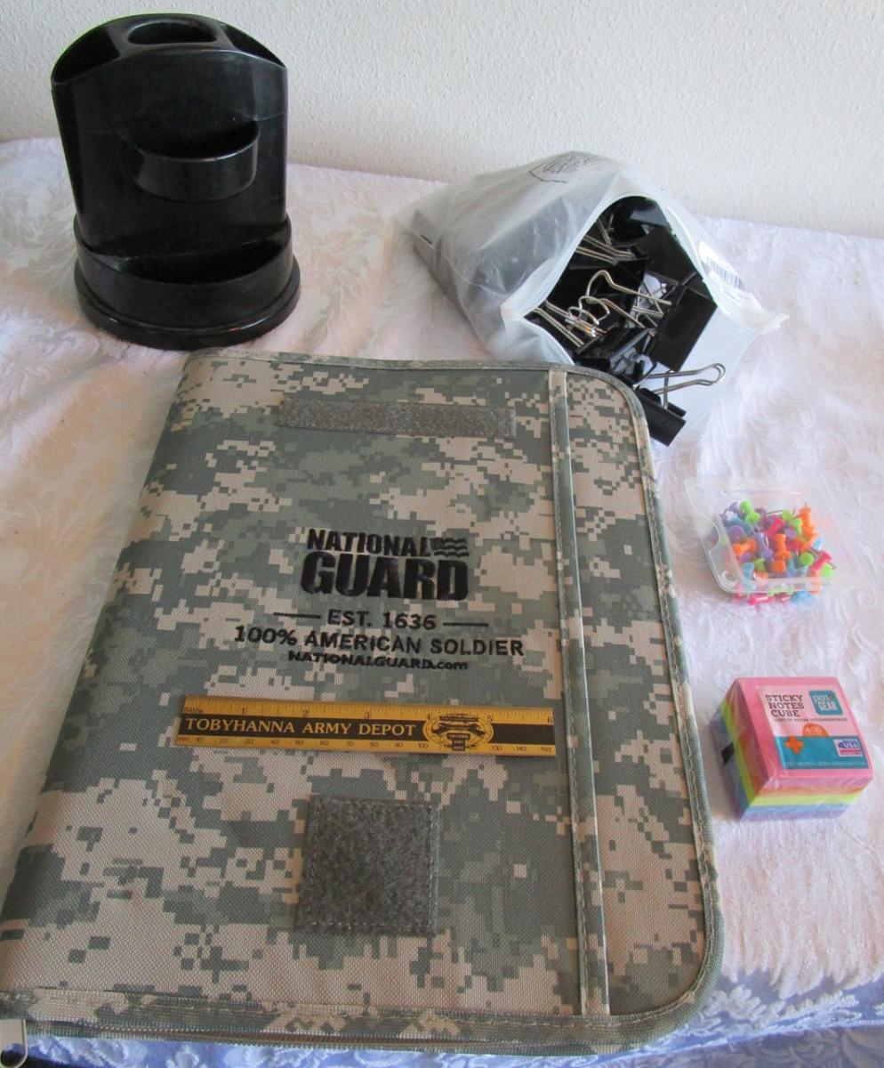 Desk organizer caddy (rotates), zippered portfolio organizer, large binder clips, push pins, 6" ruler