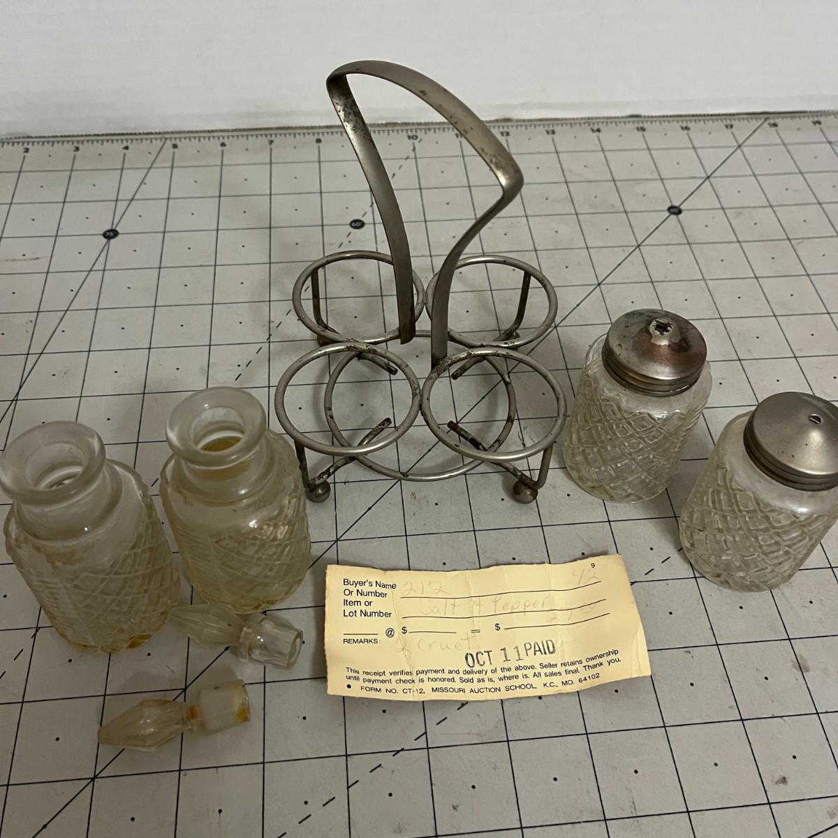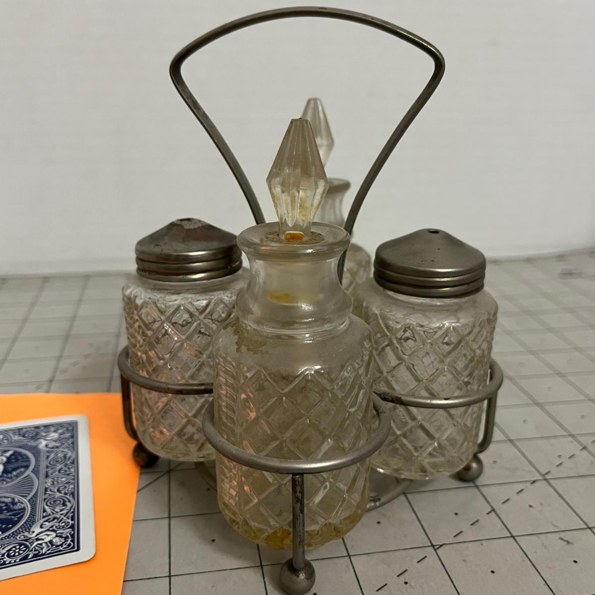 Diamond-Cut Glass Cruet Set with Metal Caddy