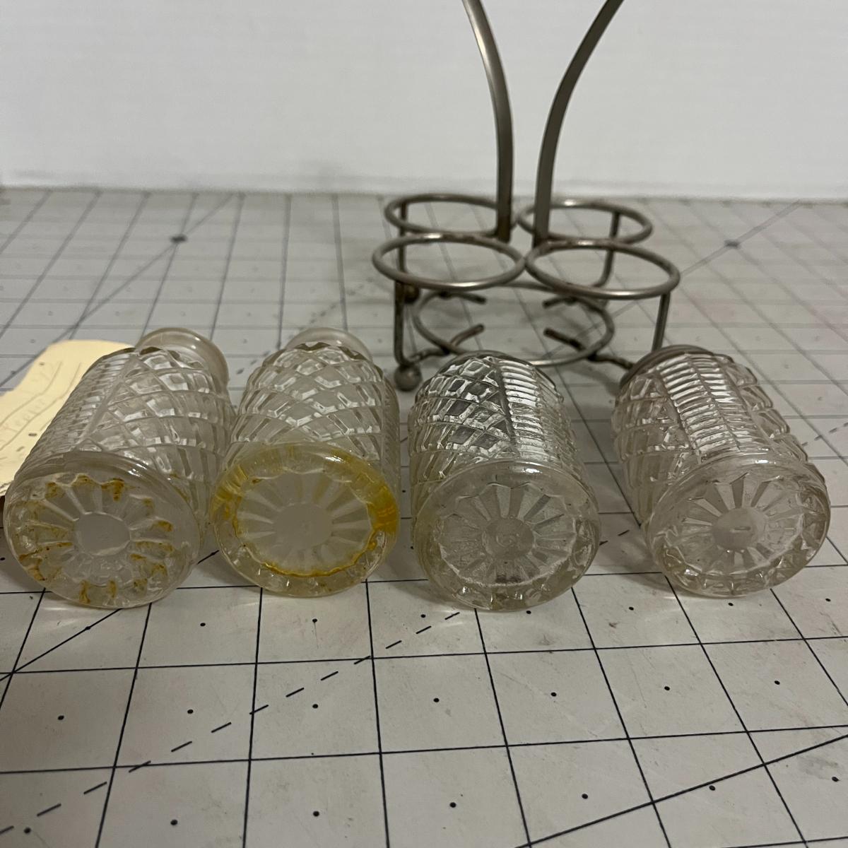 Includes 4 matching glass bottles with stoppers and shaker tops in a handled caddy; perfect for table service