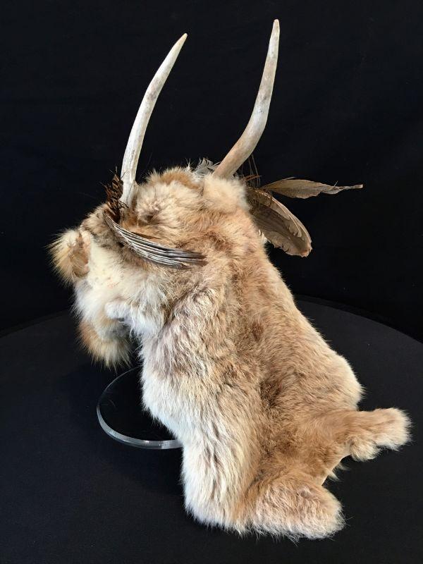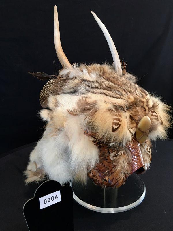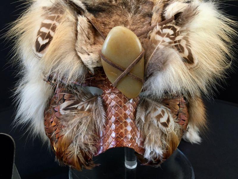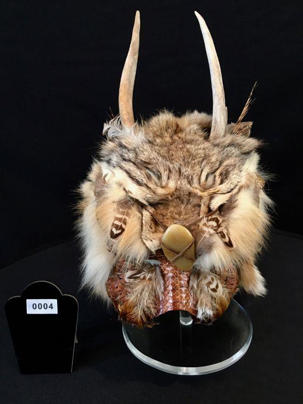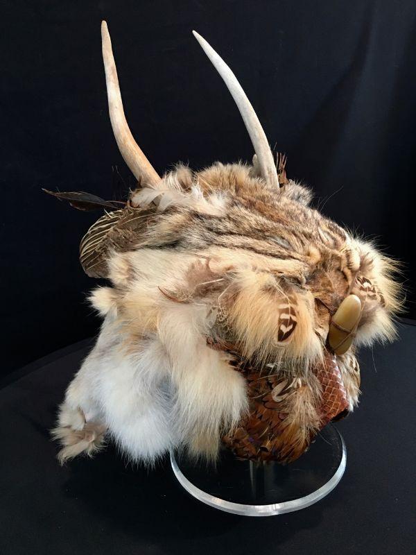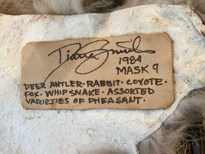 Hand made Spirit Mask on lucite stand, signed by the artist Diana Smith 1984. Materials are deer, antler, rabbit, coyote, fox, whipsnake, and pheasant feathers. Gallery prices range at $1,400 - $1,600. Item #04