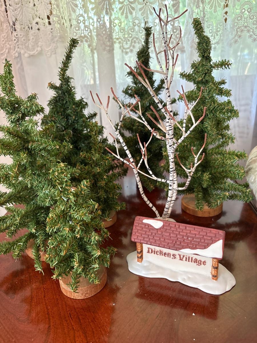 Dickens Village Department 56 sign. And assortment of green trees and Department 56 tree.
