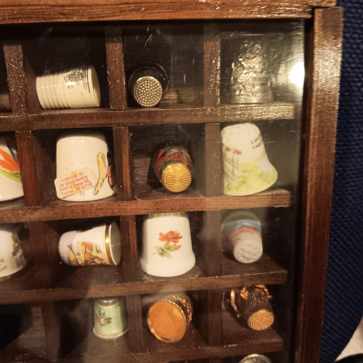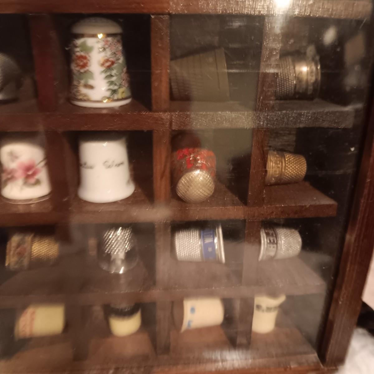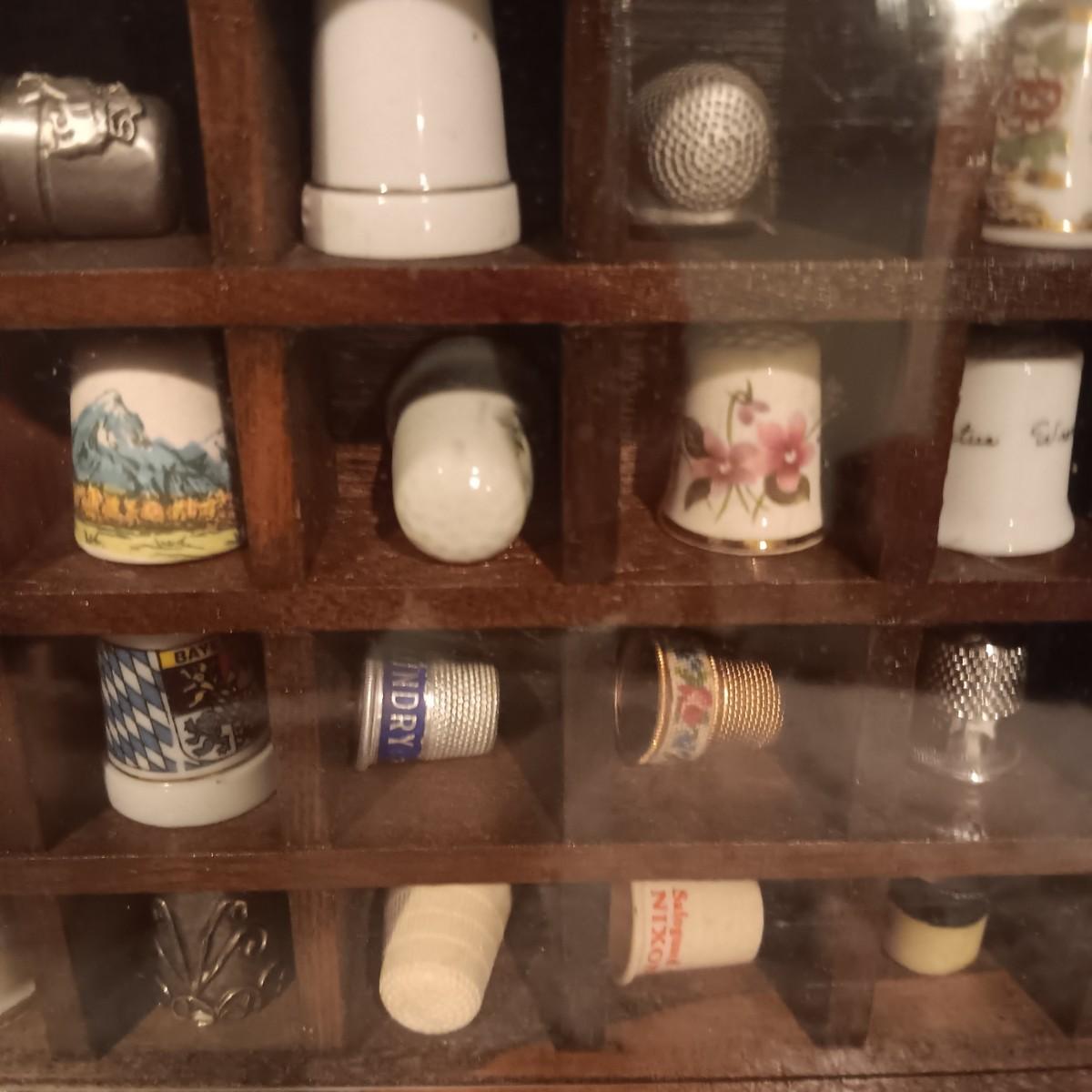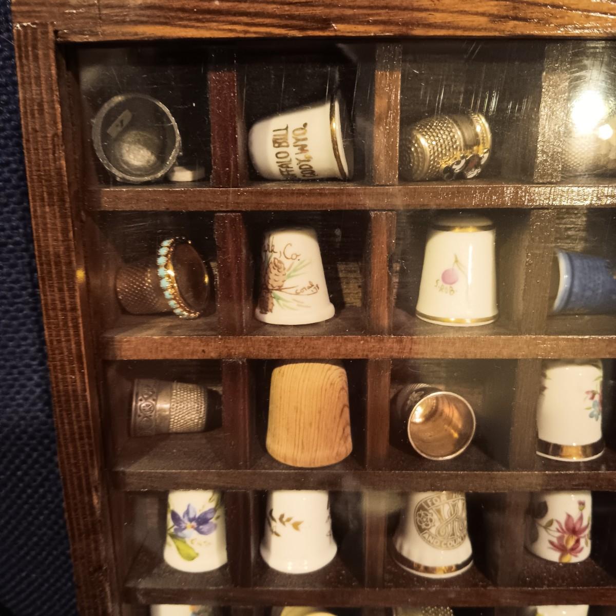 DISPLAY CASE FULL OF SEWING THIMBLES