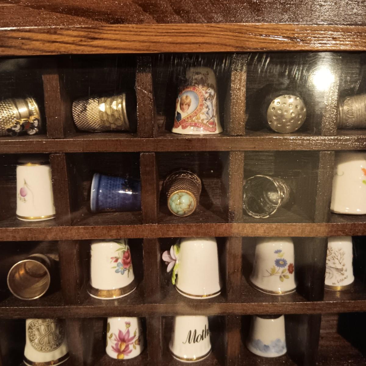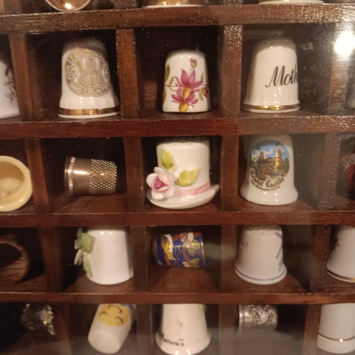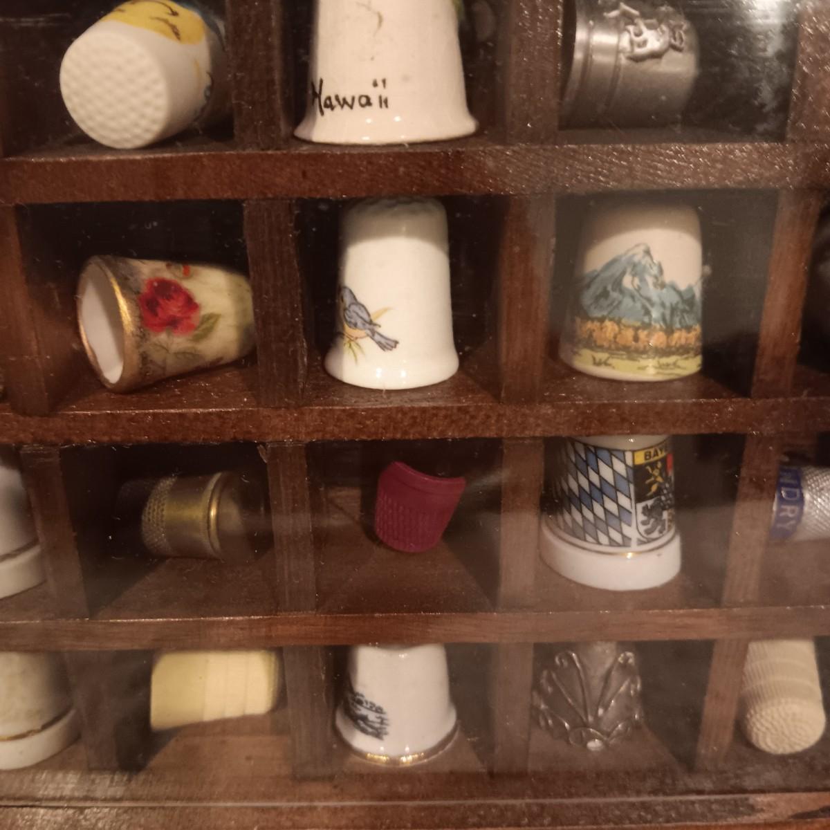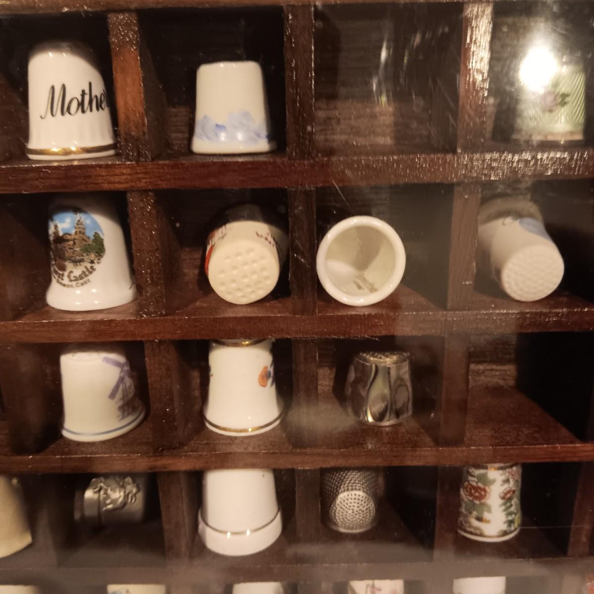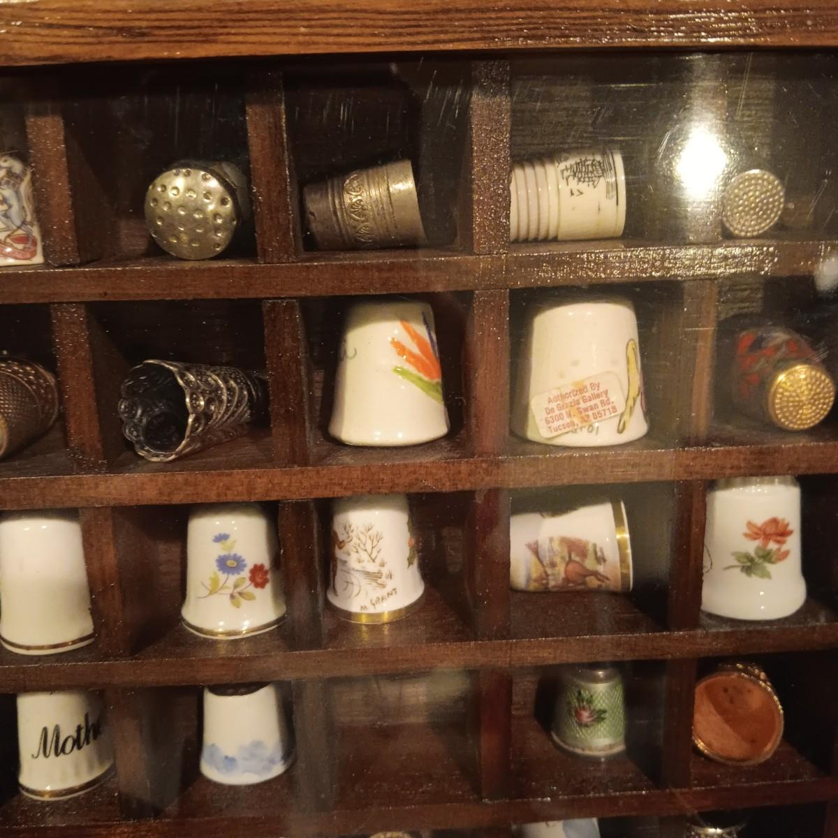 DISPLAY CASE FULL OF SEWING THIMBLES