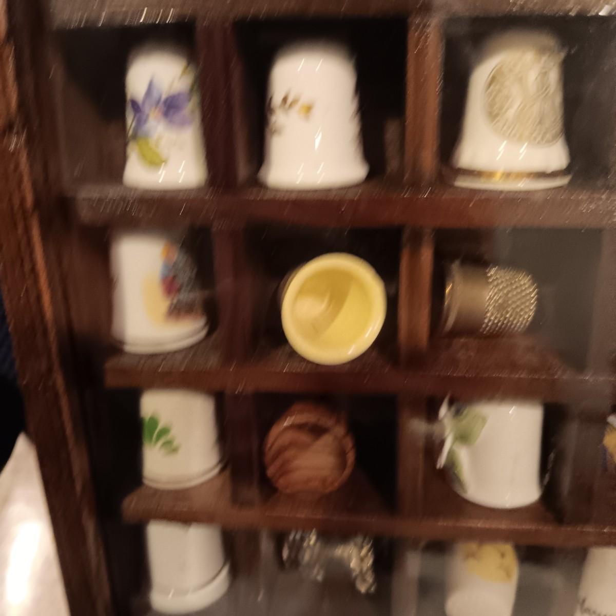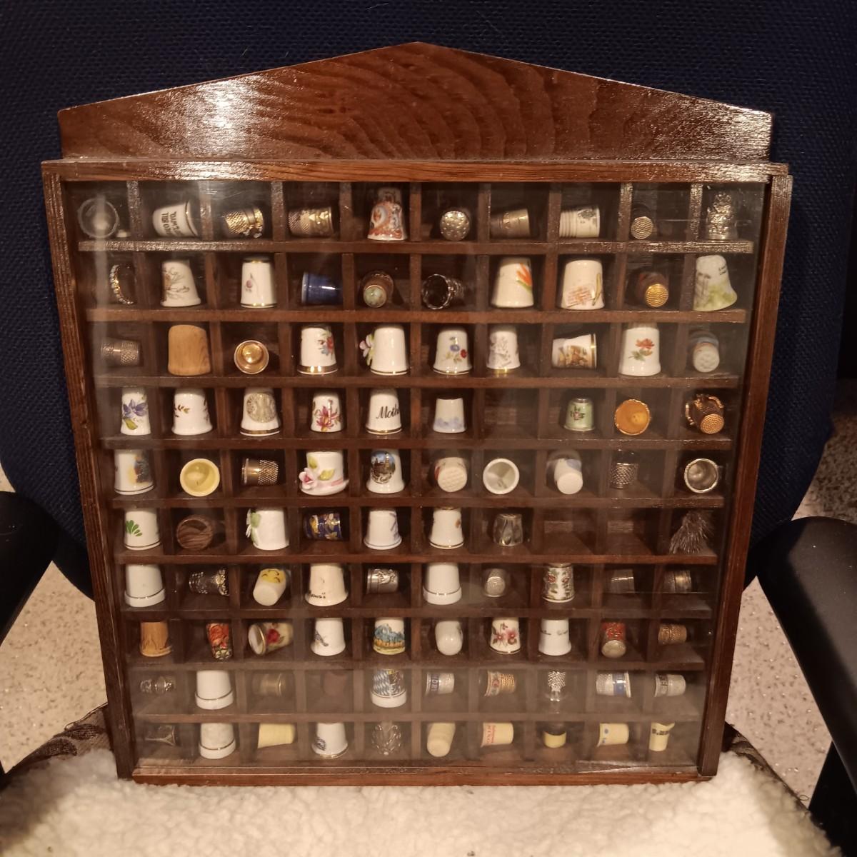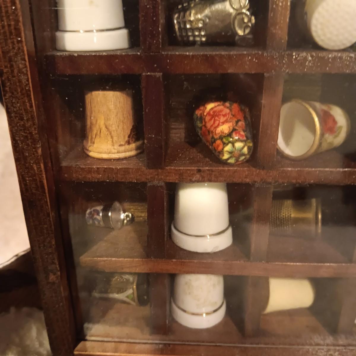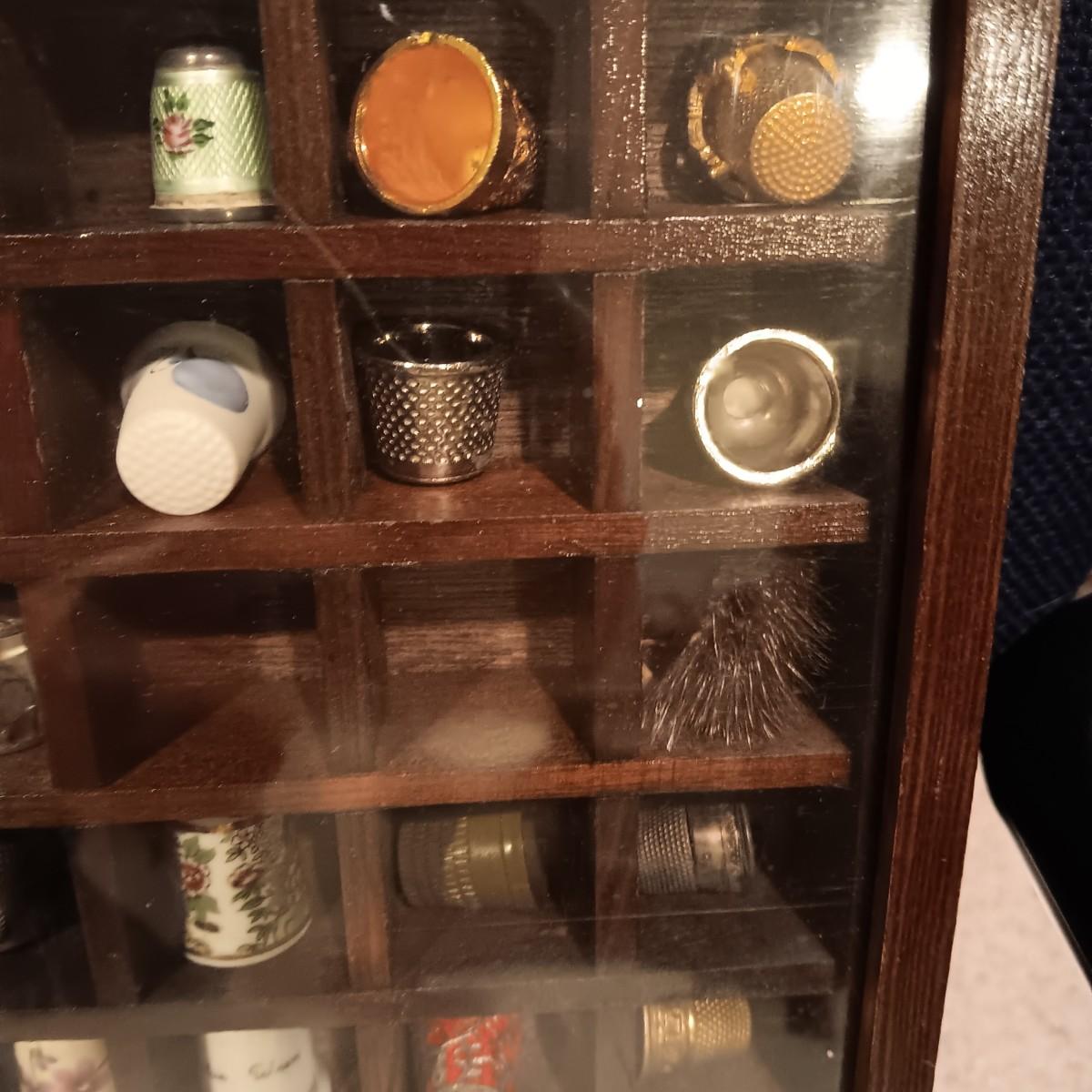 DISPLAY CASE FULL OF SEWING THIMBLES