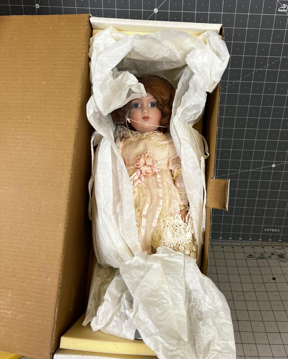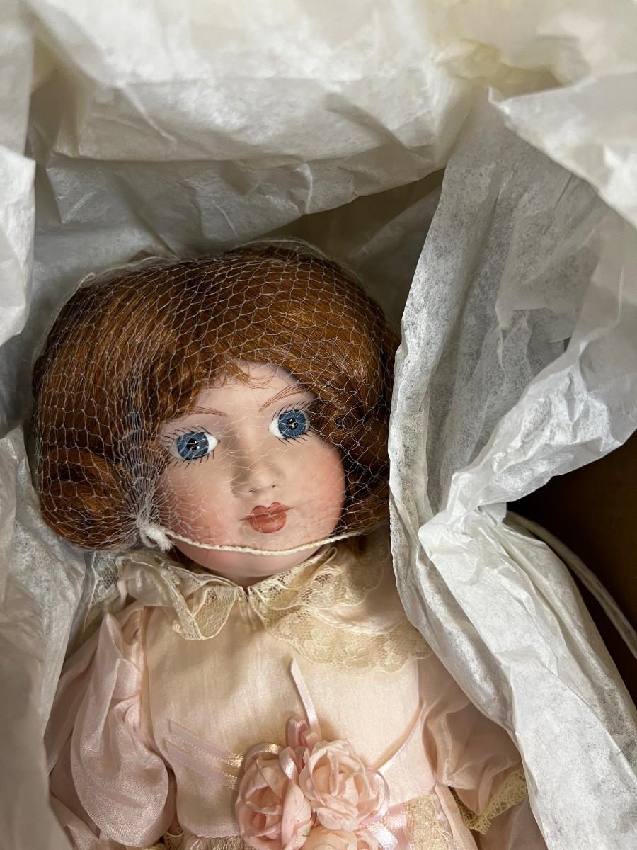 New in Original Box. Victorian Porcelain Strawberry Blond Doll NEW old Stock.