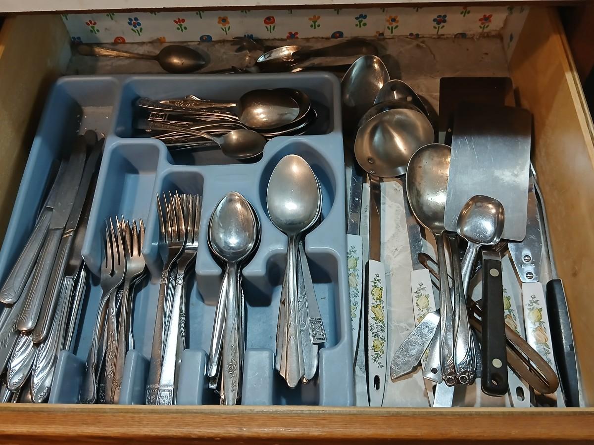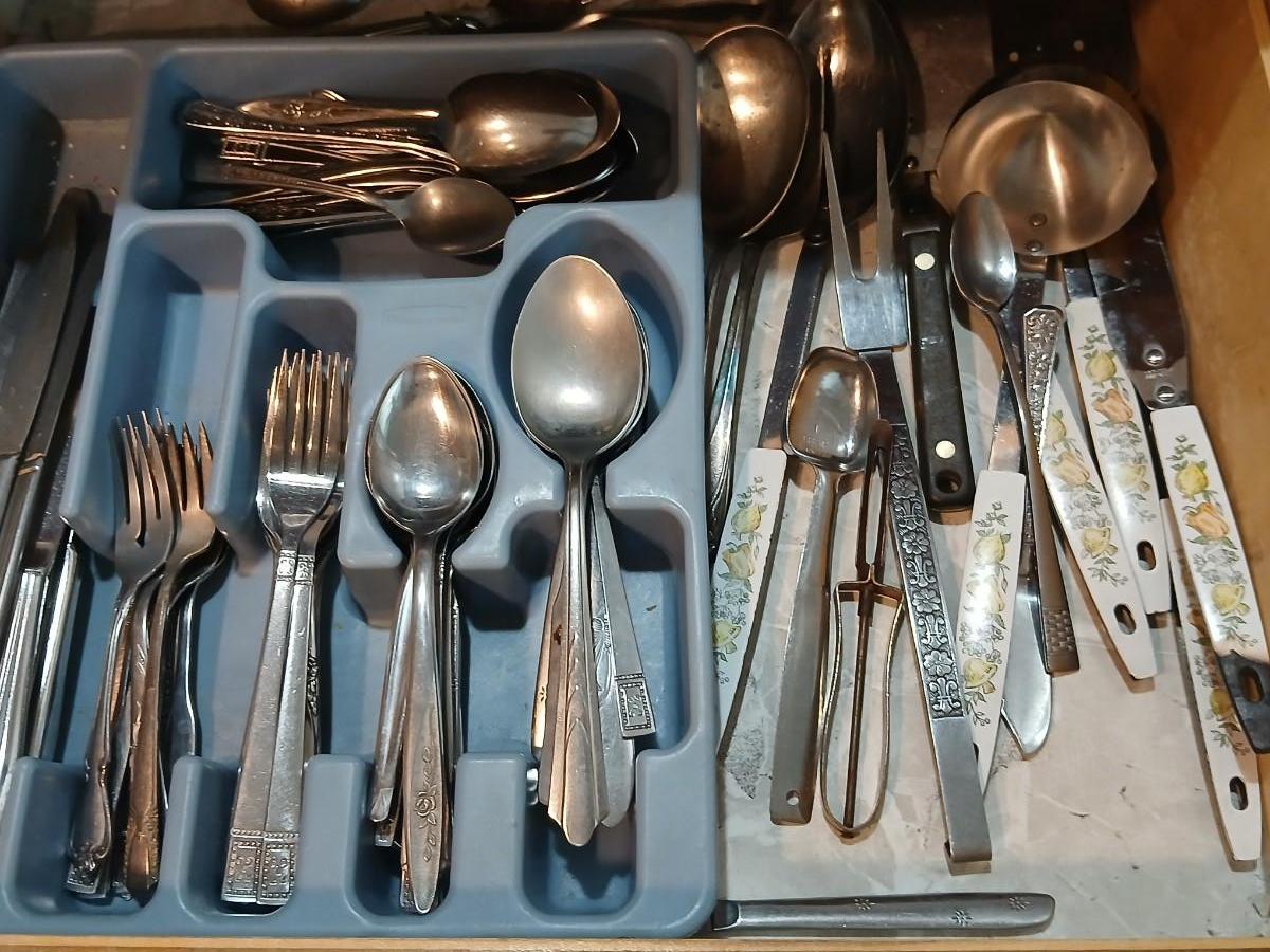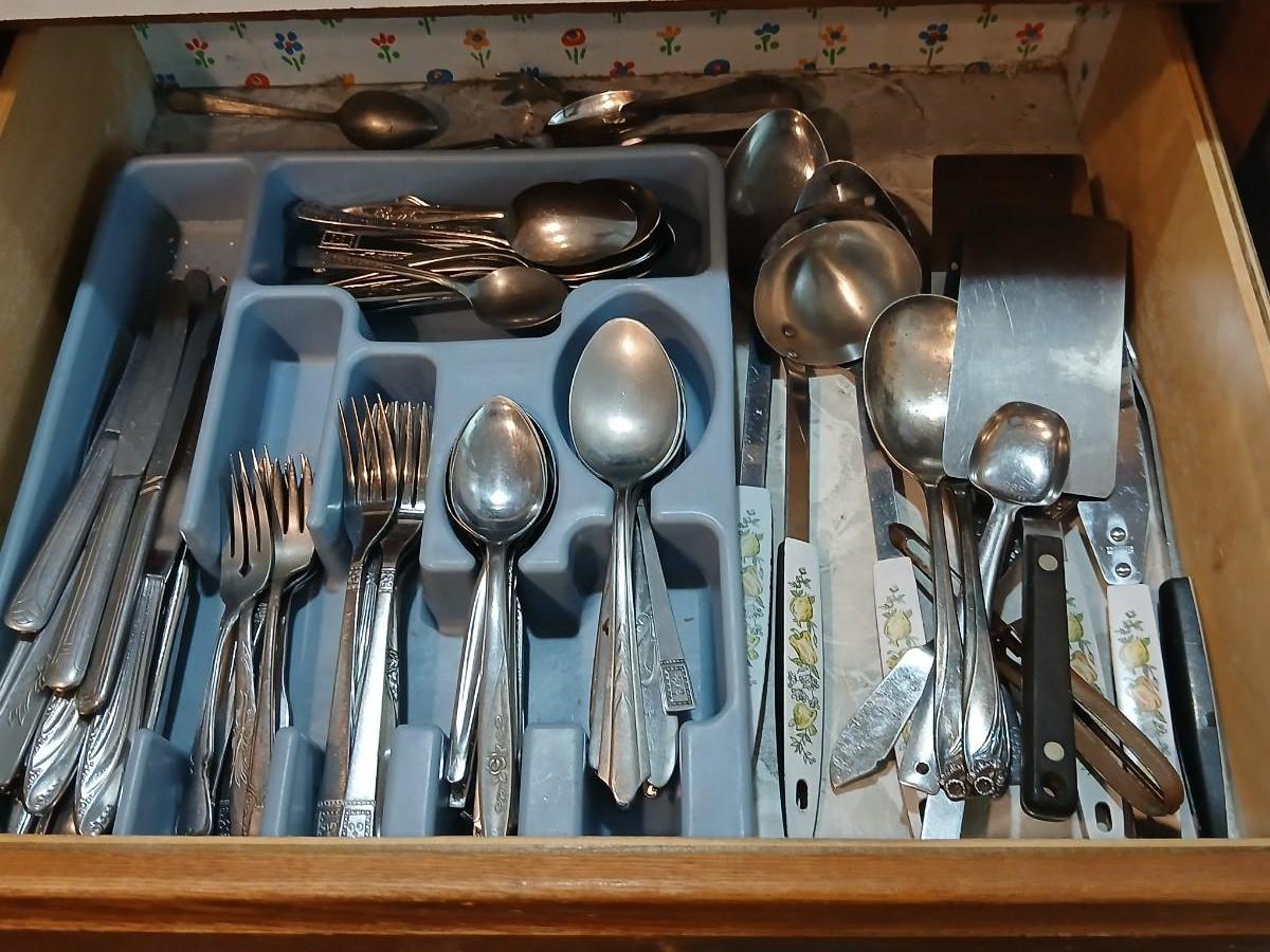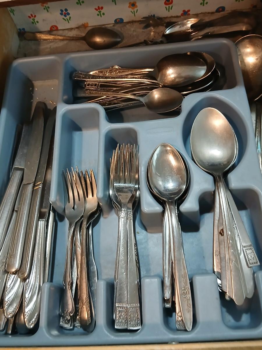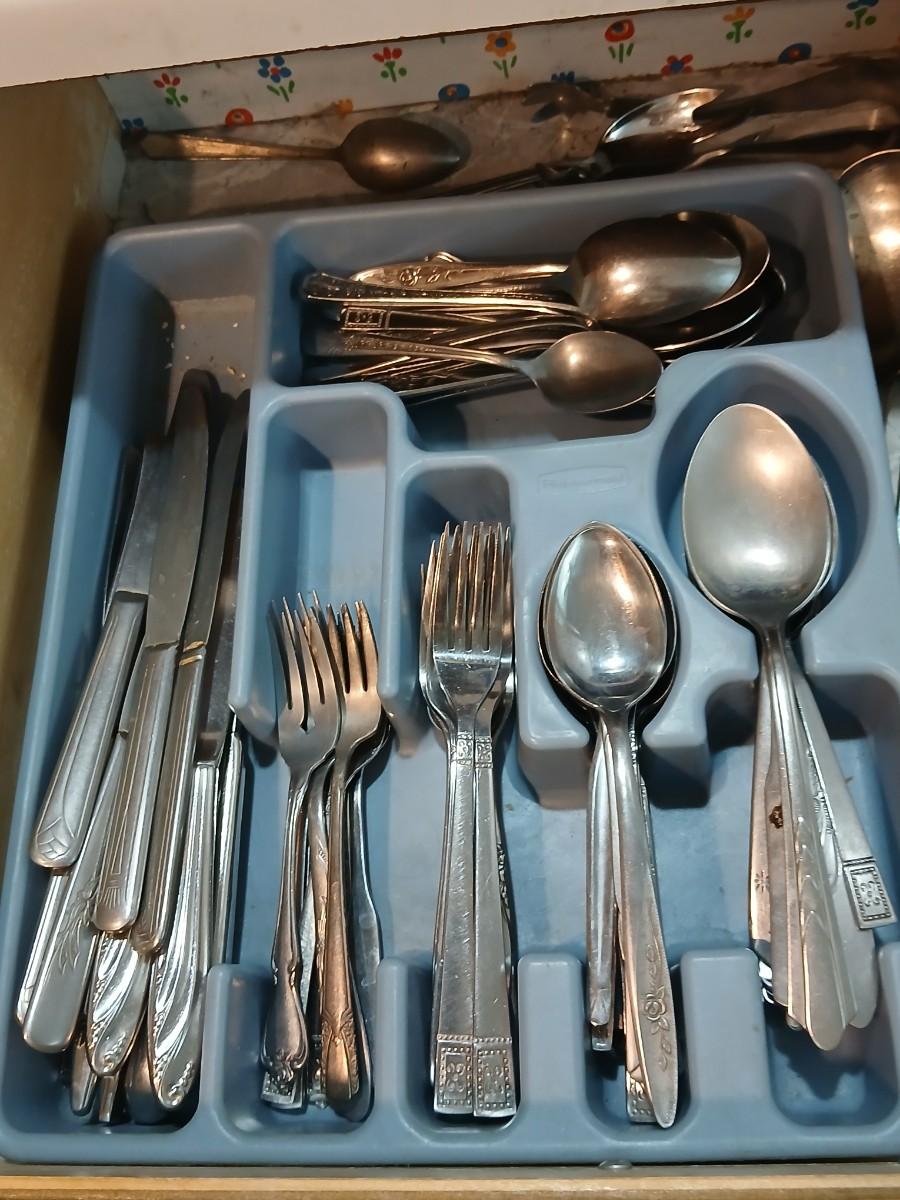 Drawer organizer full of assorted mis-matched flatware and a nice utensil set