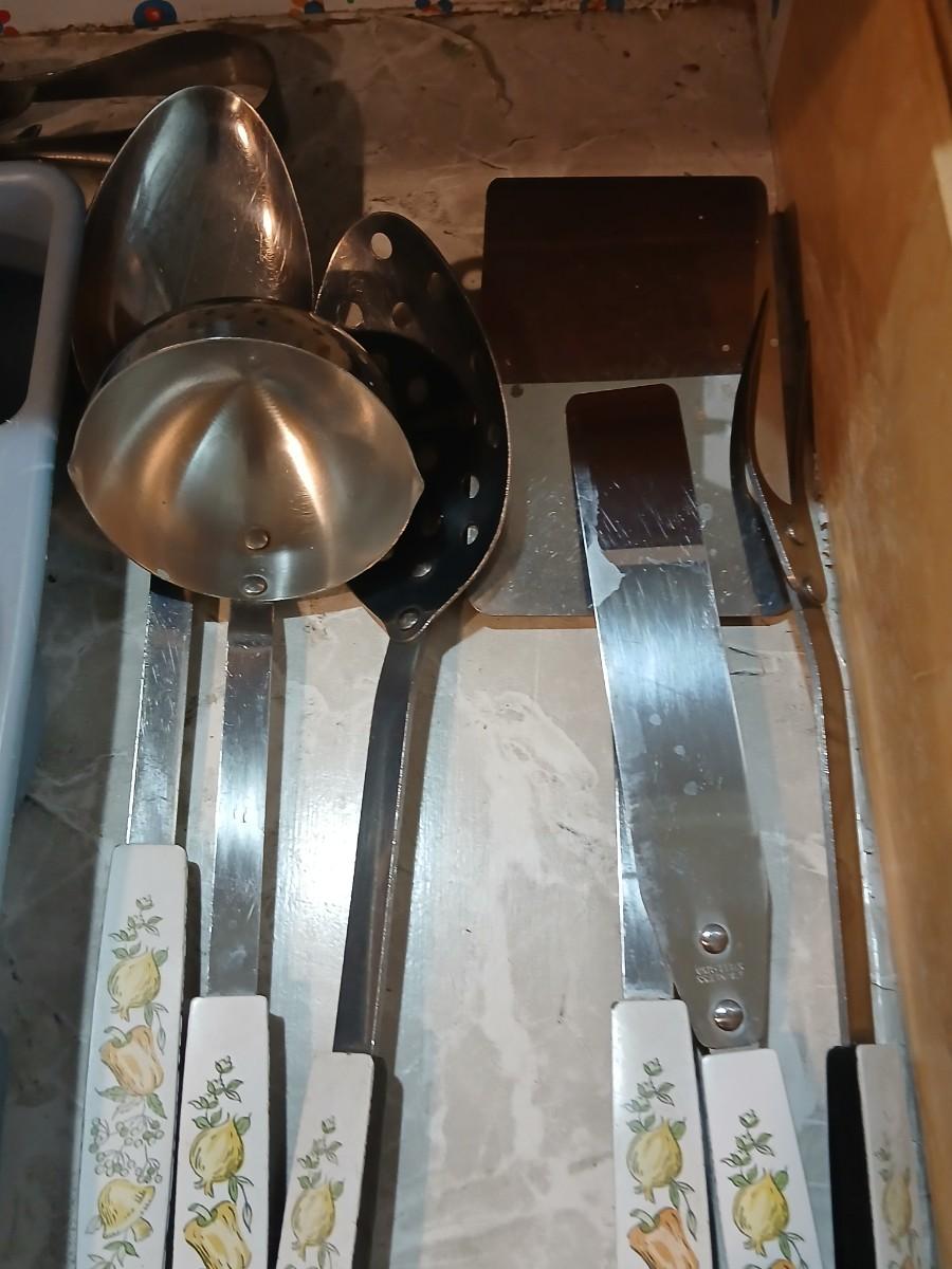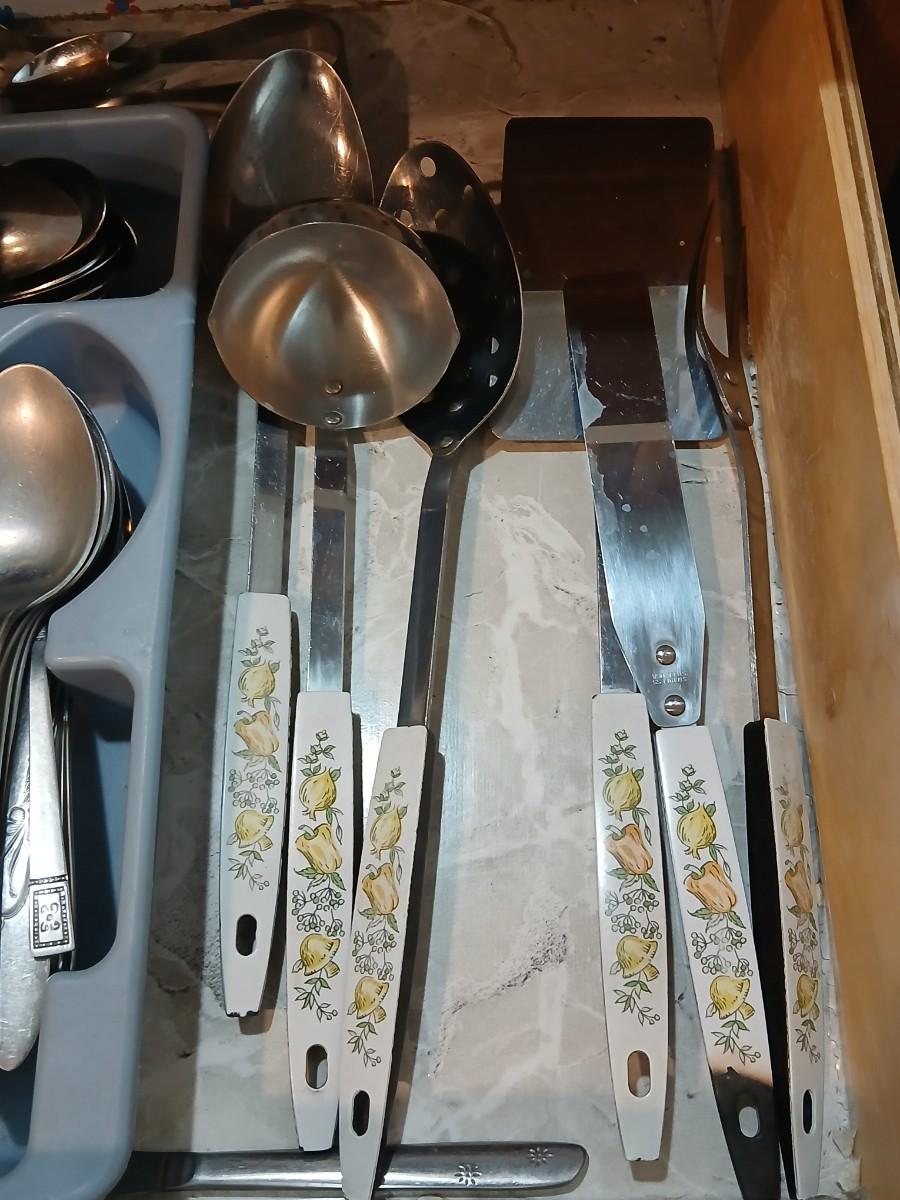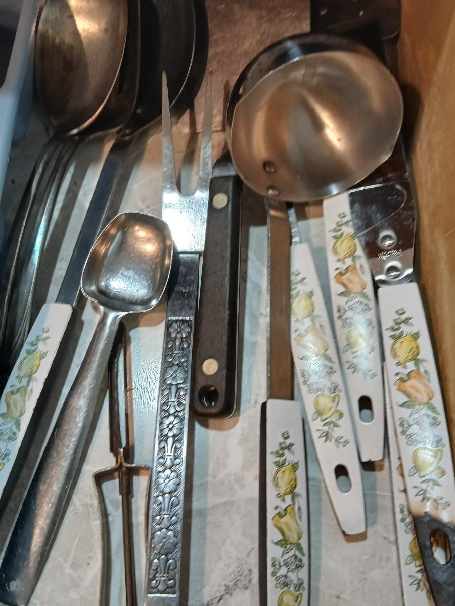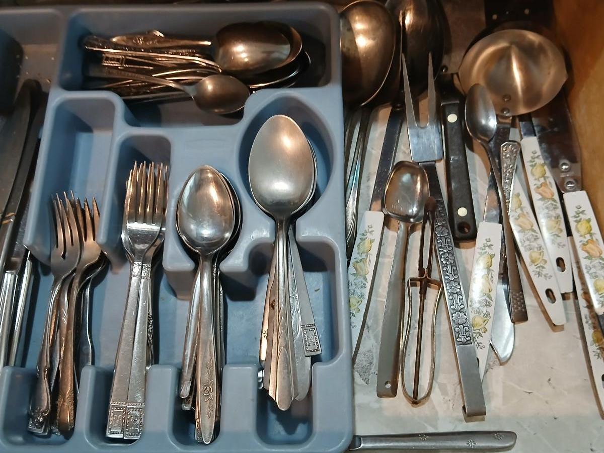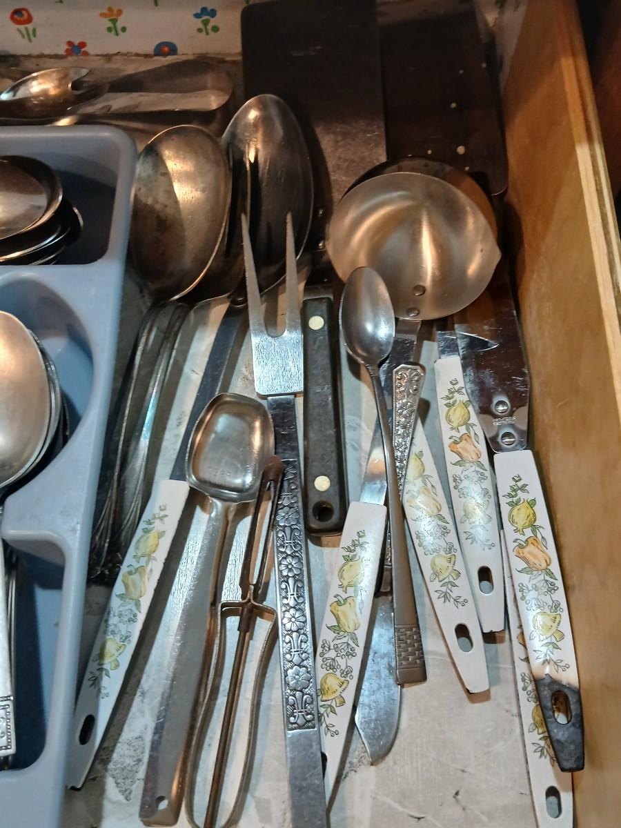 Drawer organizer full of assorted mis-matched flatware and a nice utensil set