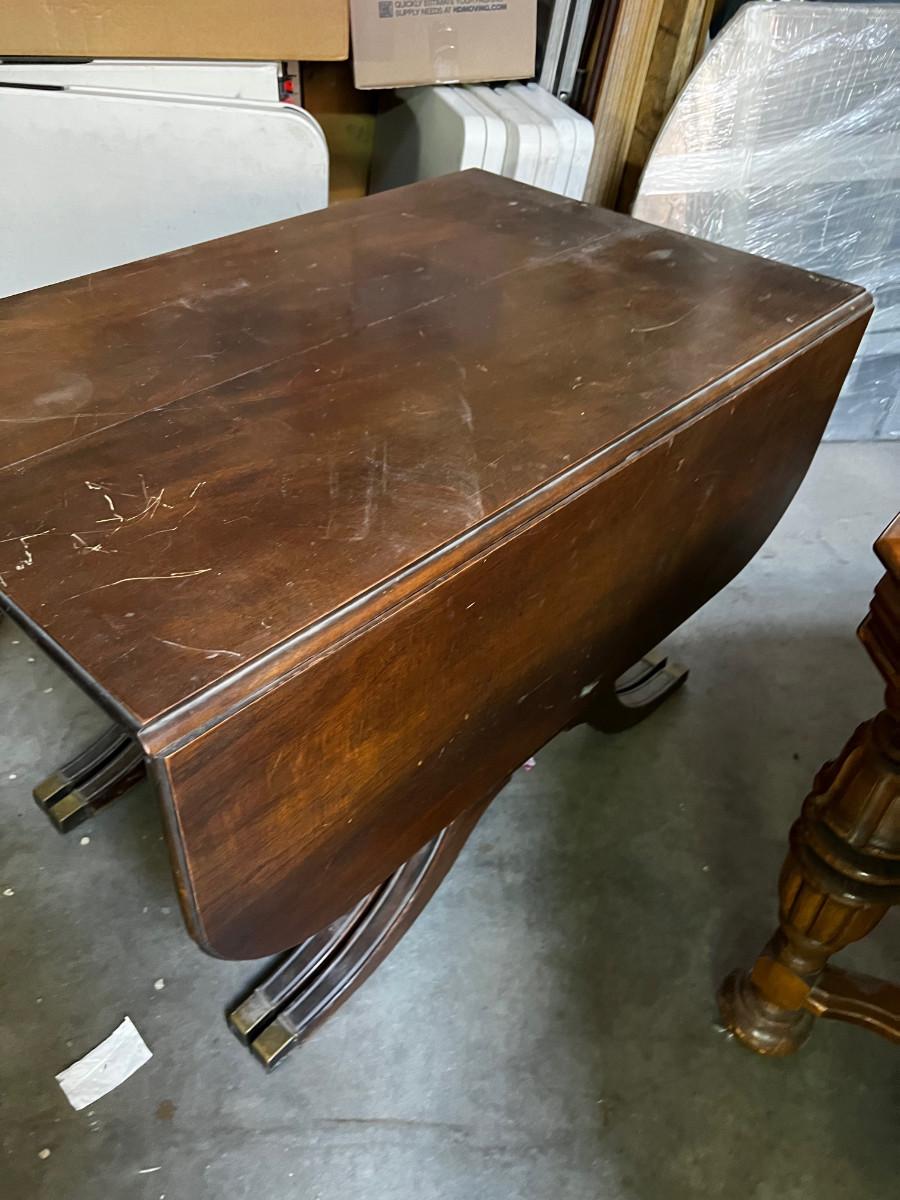 USED - Functional, Show Wear. Measures: 27 X 42" Plus Leaves of 15" Each Time 2 Leaves. No Shipping NOTE ** Must Bring 2 Strong Adults to move this item. It is ground Floor of warehouse.-No Stairs but you will need a truck and this is very heavy!!!! We do not have Loading help for these furniture items!