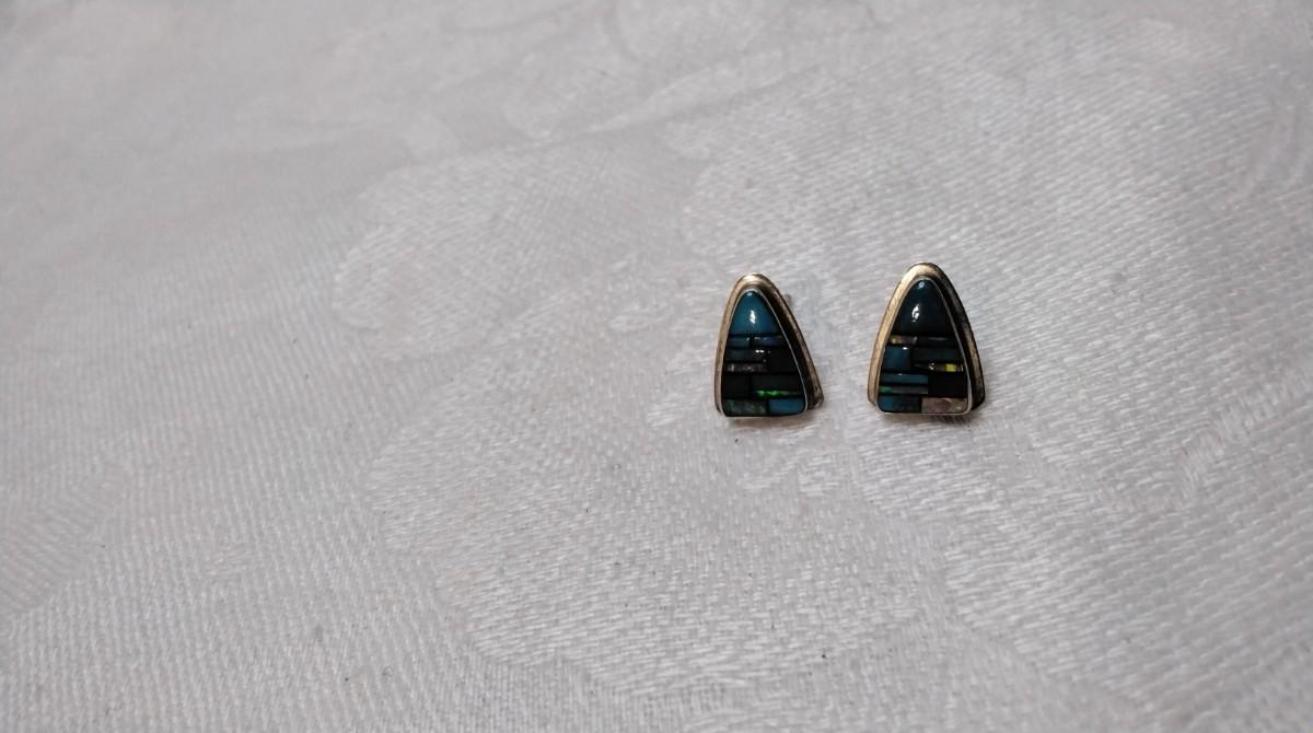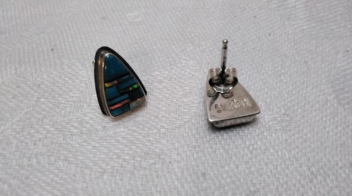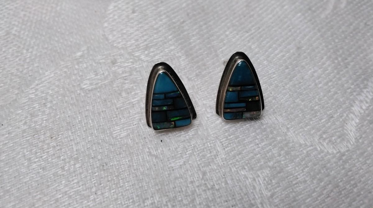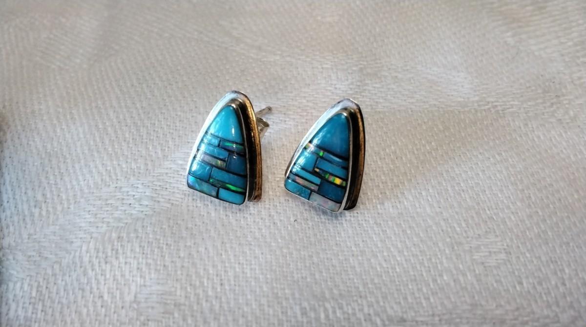 Zuni Indian Turquoise and Opal Hand Marked Signed Post Earrings