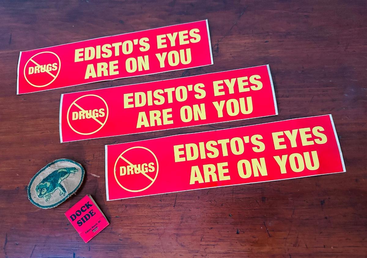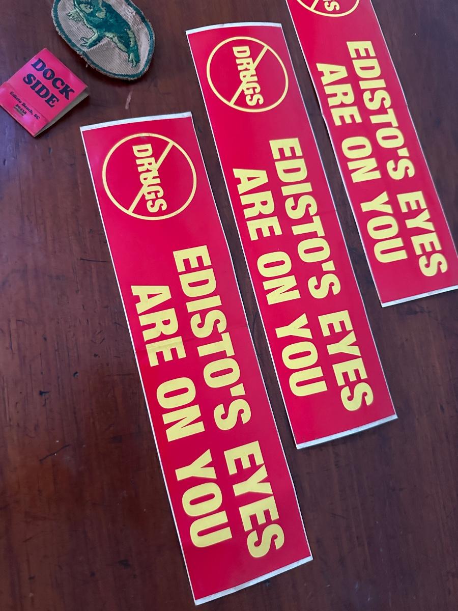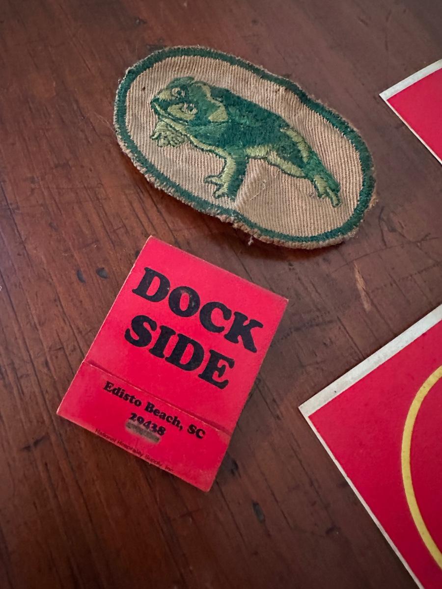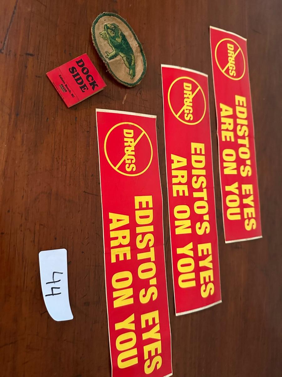 NO DRUGS EDISTO BUMPER STICKERS (3) DOCKSIDE RETAURANT MATCHBOOK, VINTAGE FROG PATCH