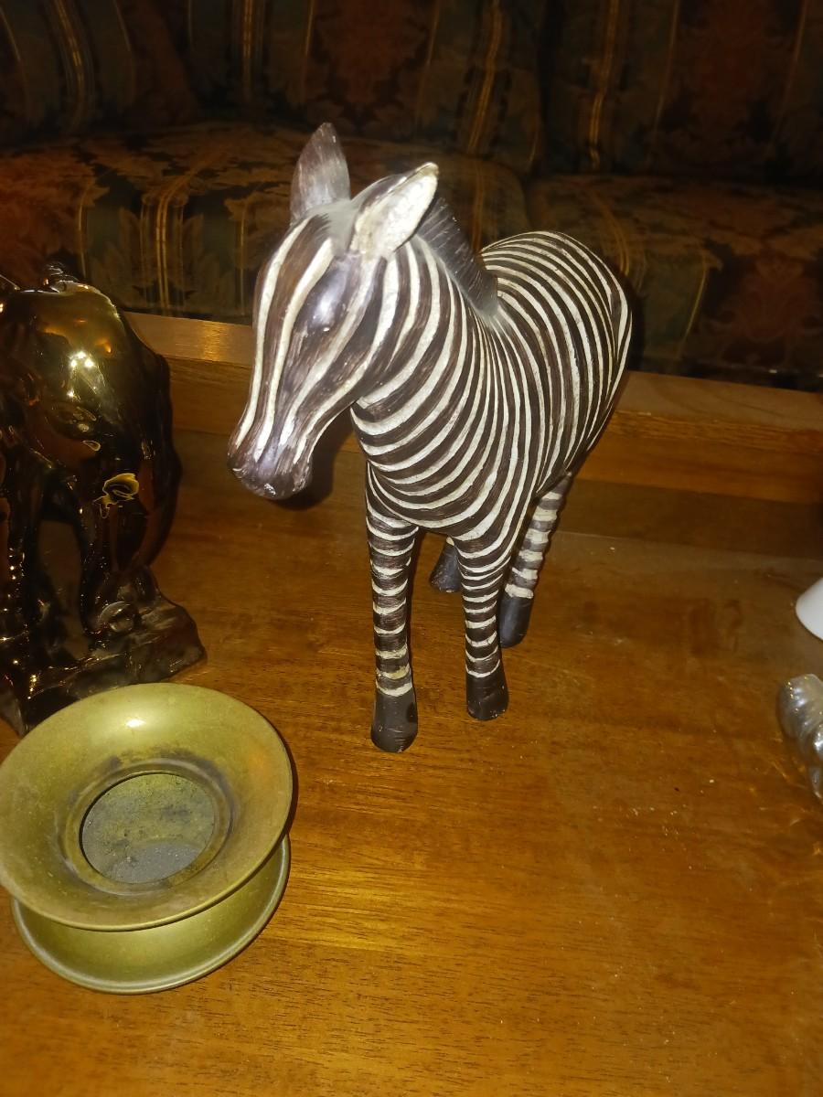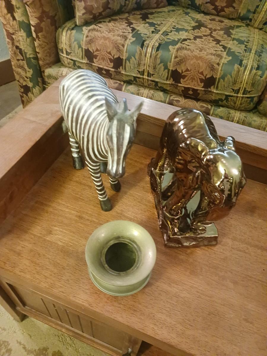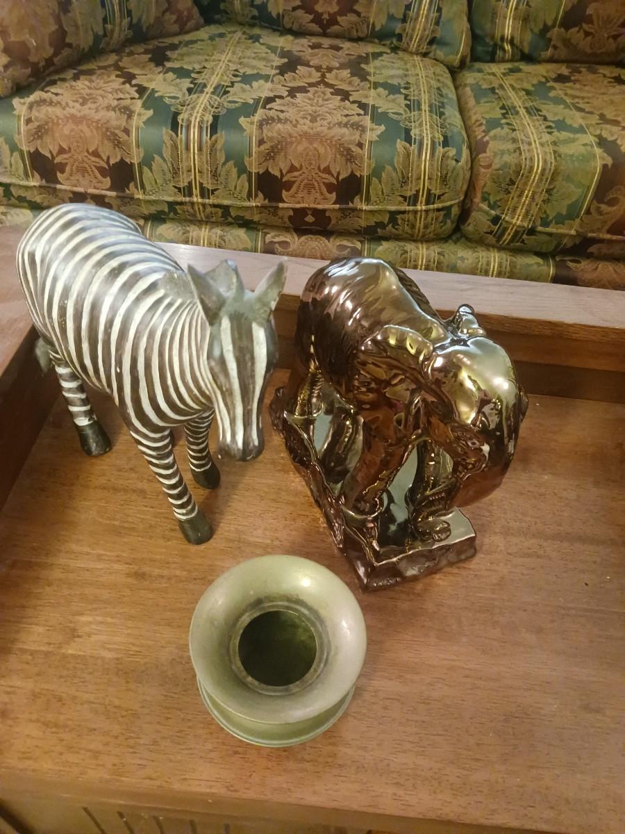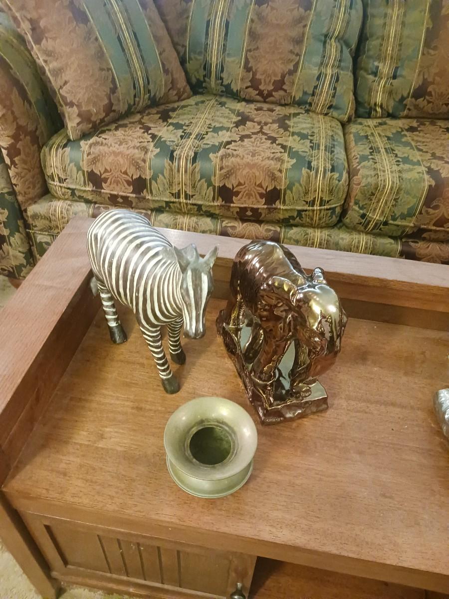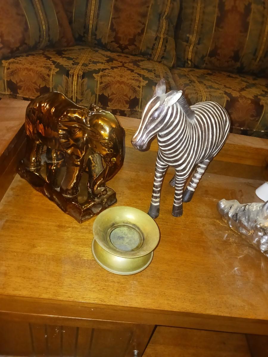 ELEPHANT AND ZEBRA FIGURES PLUS A SMALL BRASS SPITTOON