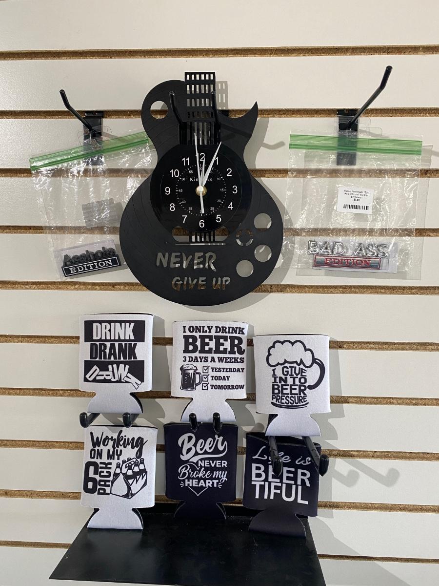 EMBLEMS, VINYL GUITAR WALL CLOCK, CAN COOLERS