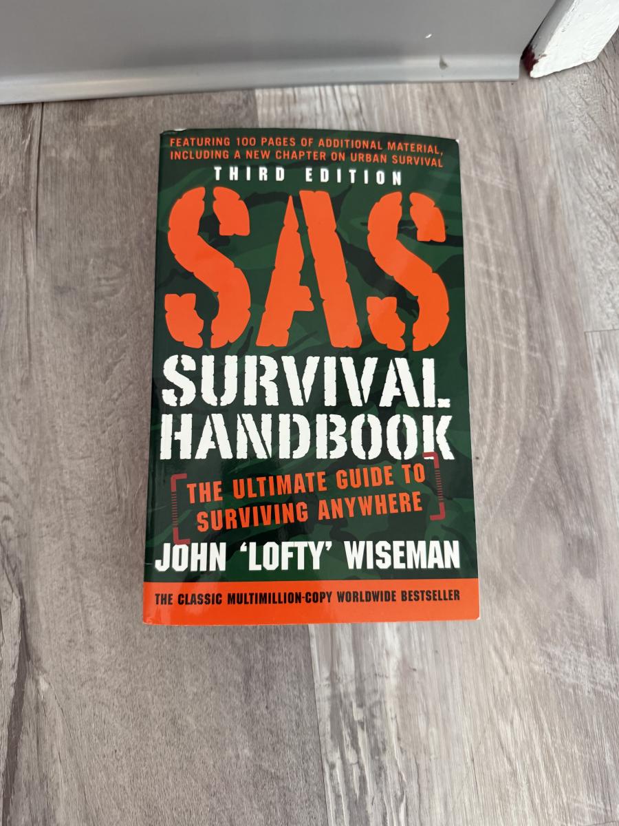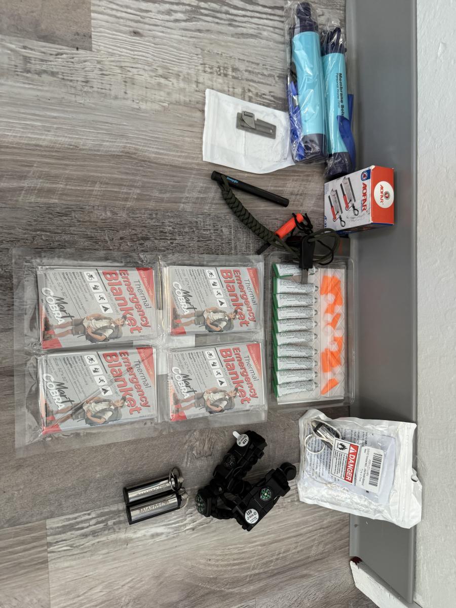 Assortment of survival gear including thermal blankets, fire starter, water filters, paracord tools, book, and first aid items.