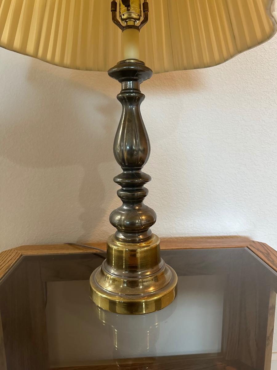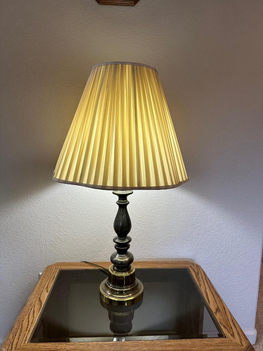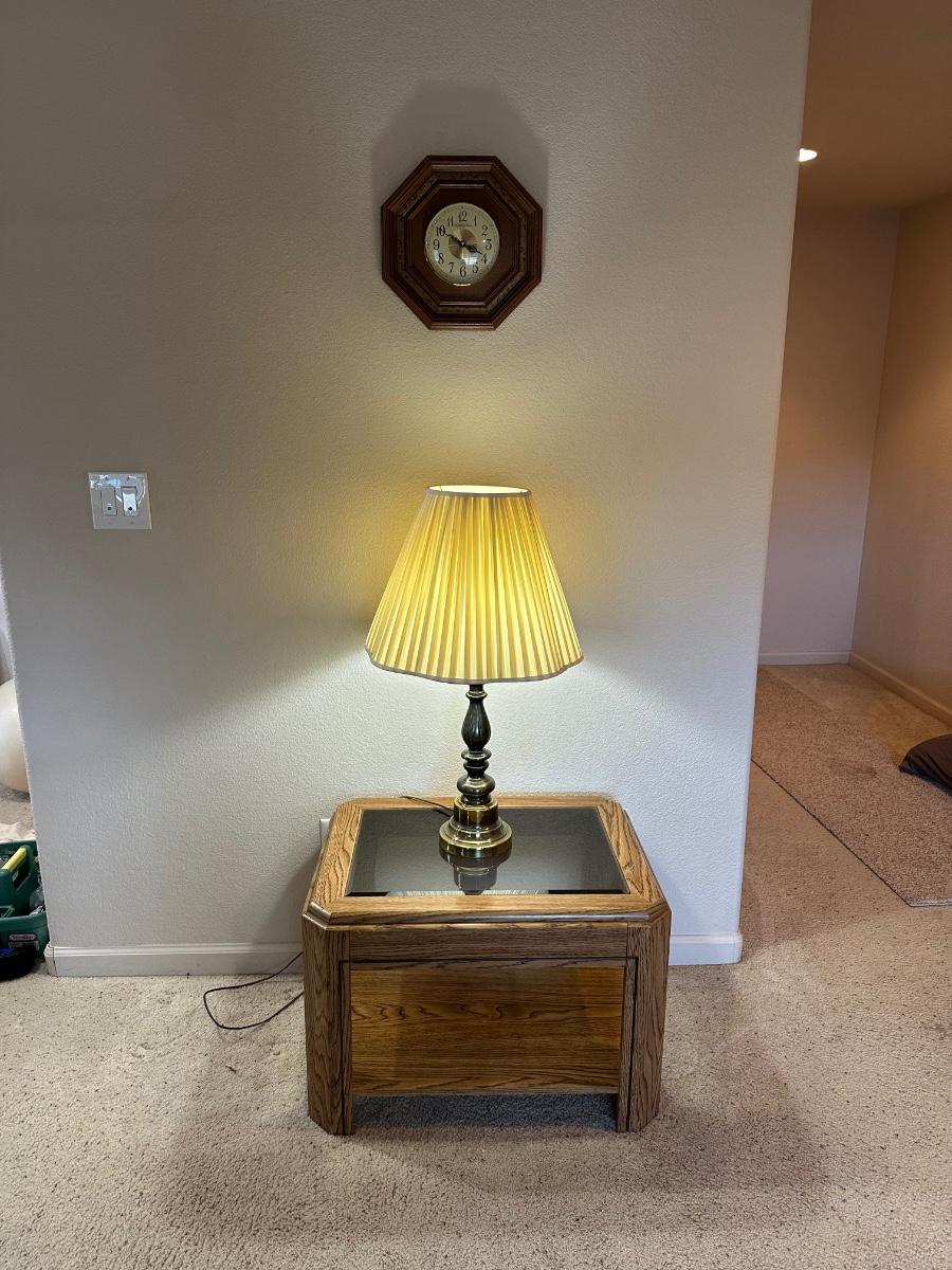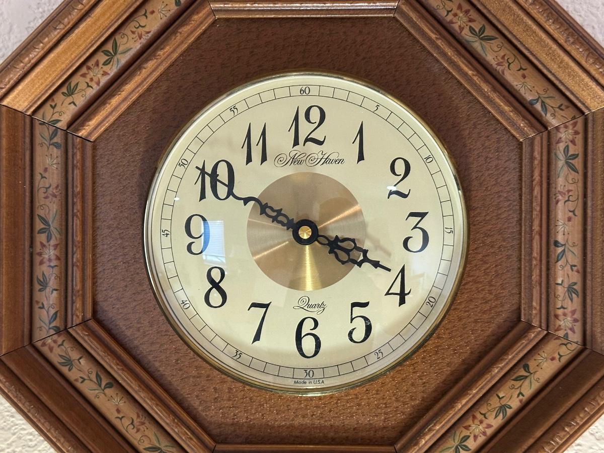 END TABLE, NEW HAVEN WALL CLOCK AND BRASS TABLE LAMP