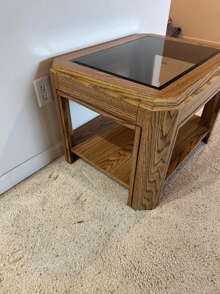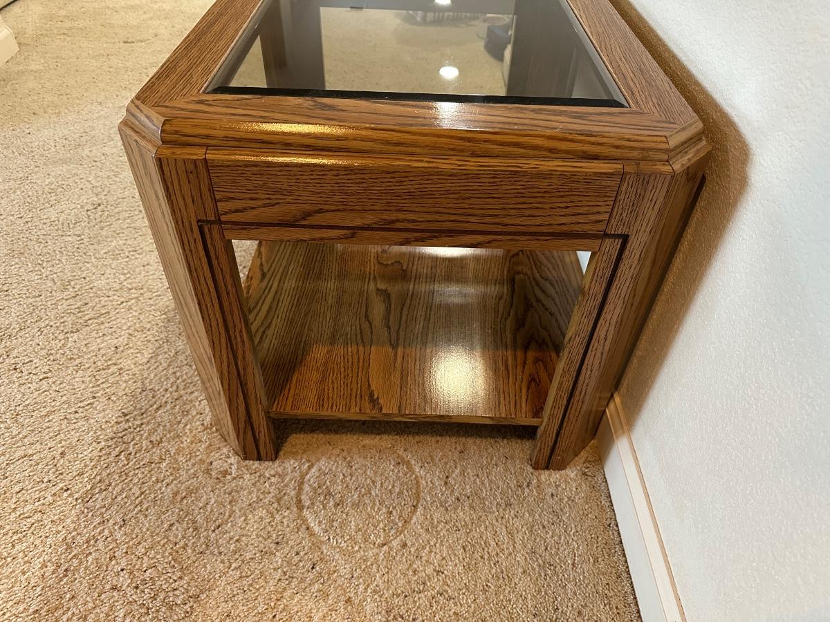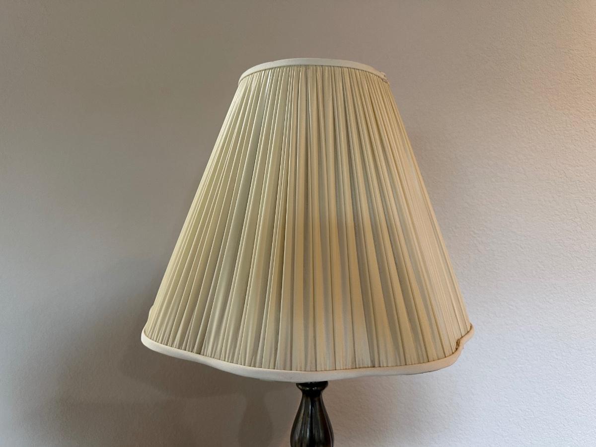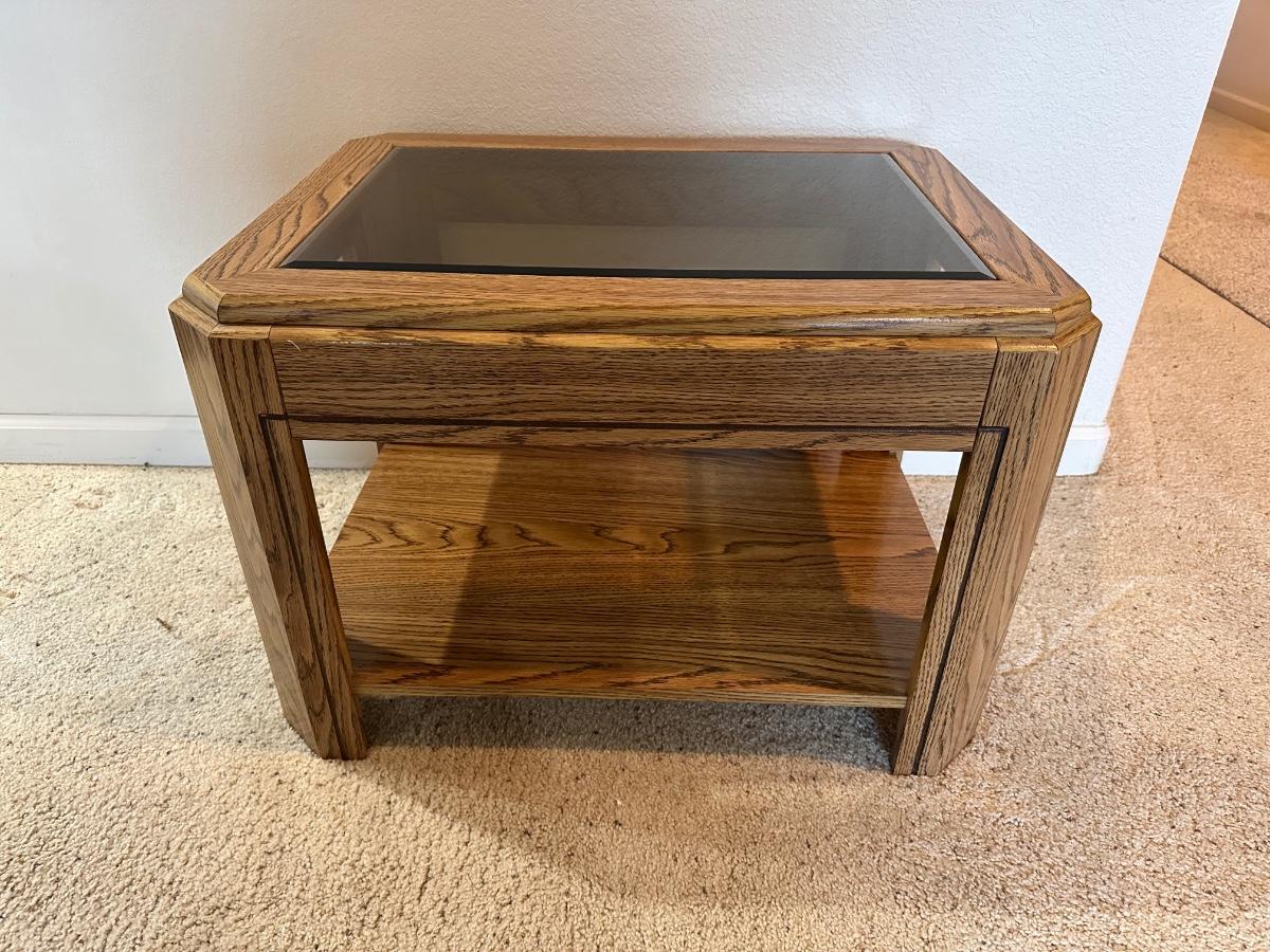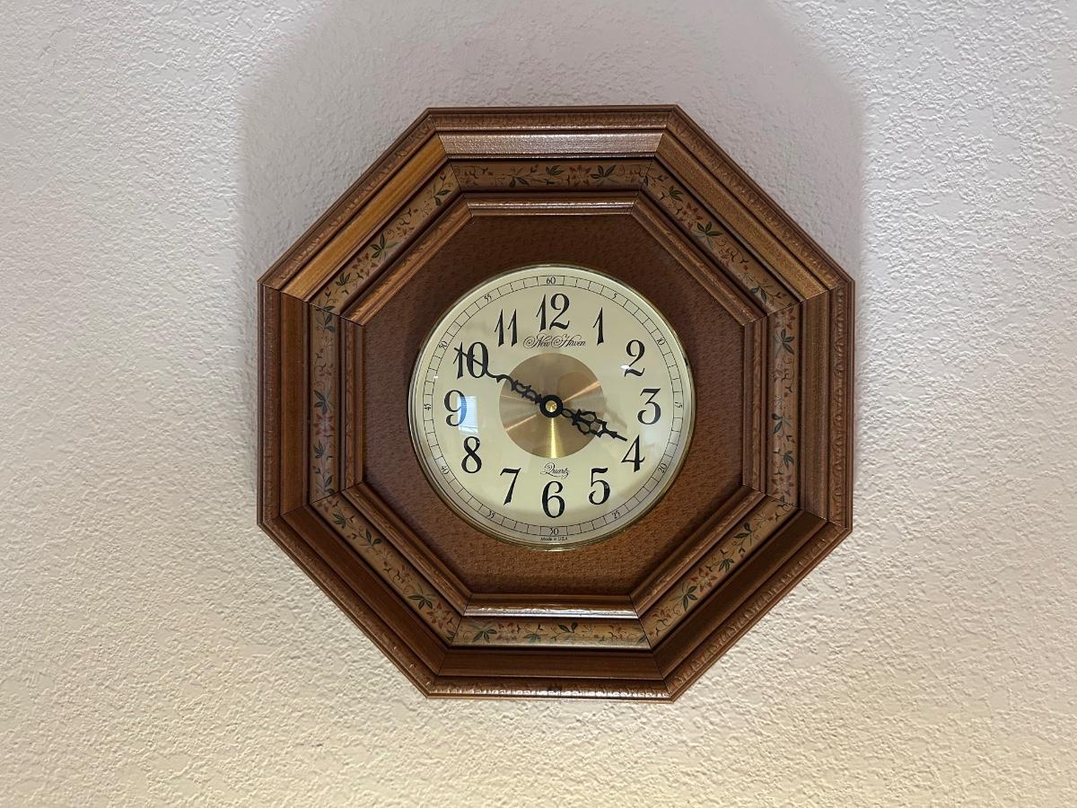END TABLE, NEW HAVEN WALL CLOCK AND BRASS TABLE LAMP