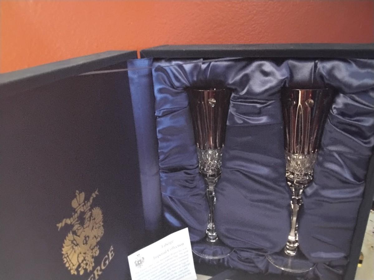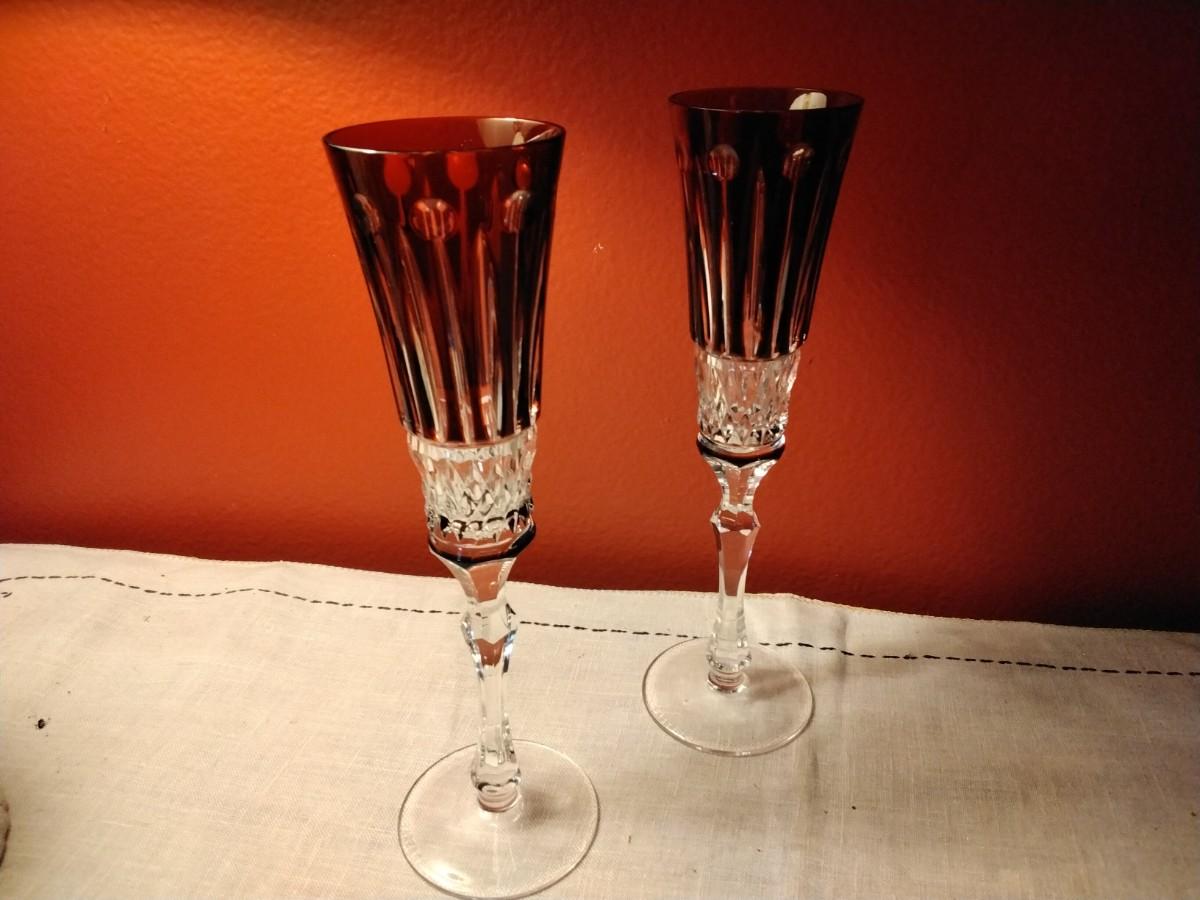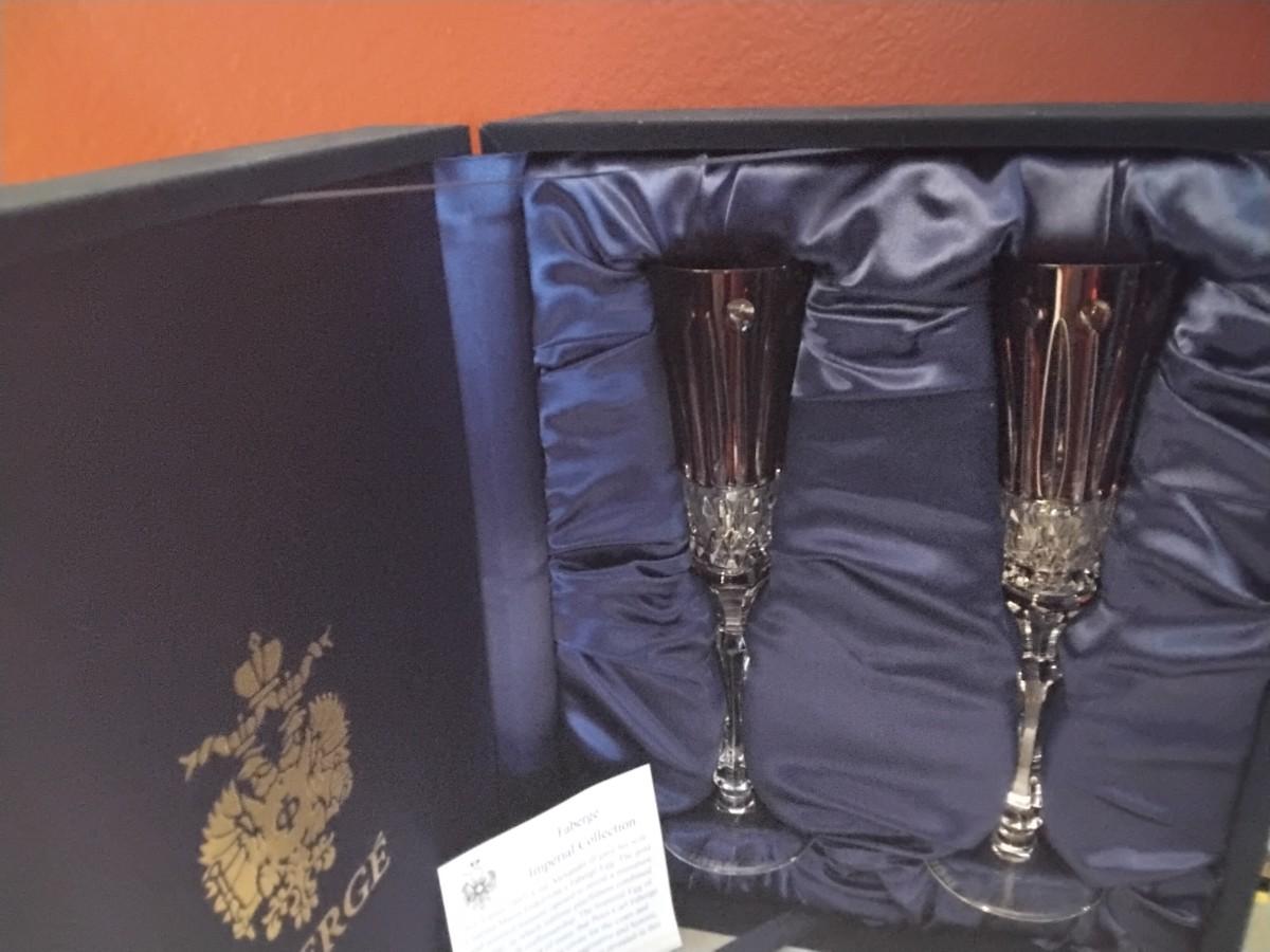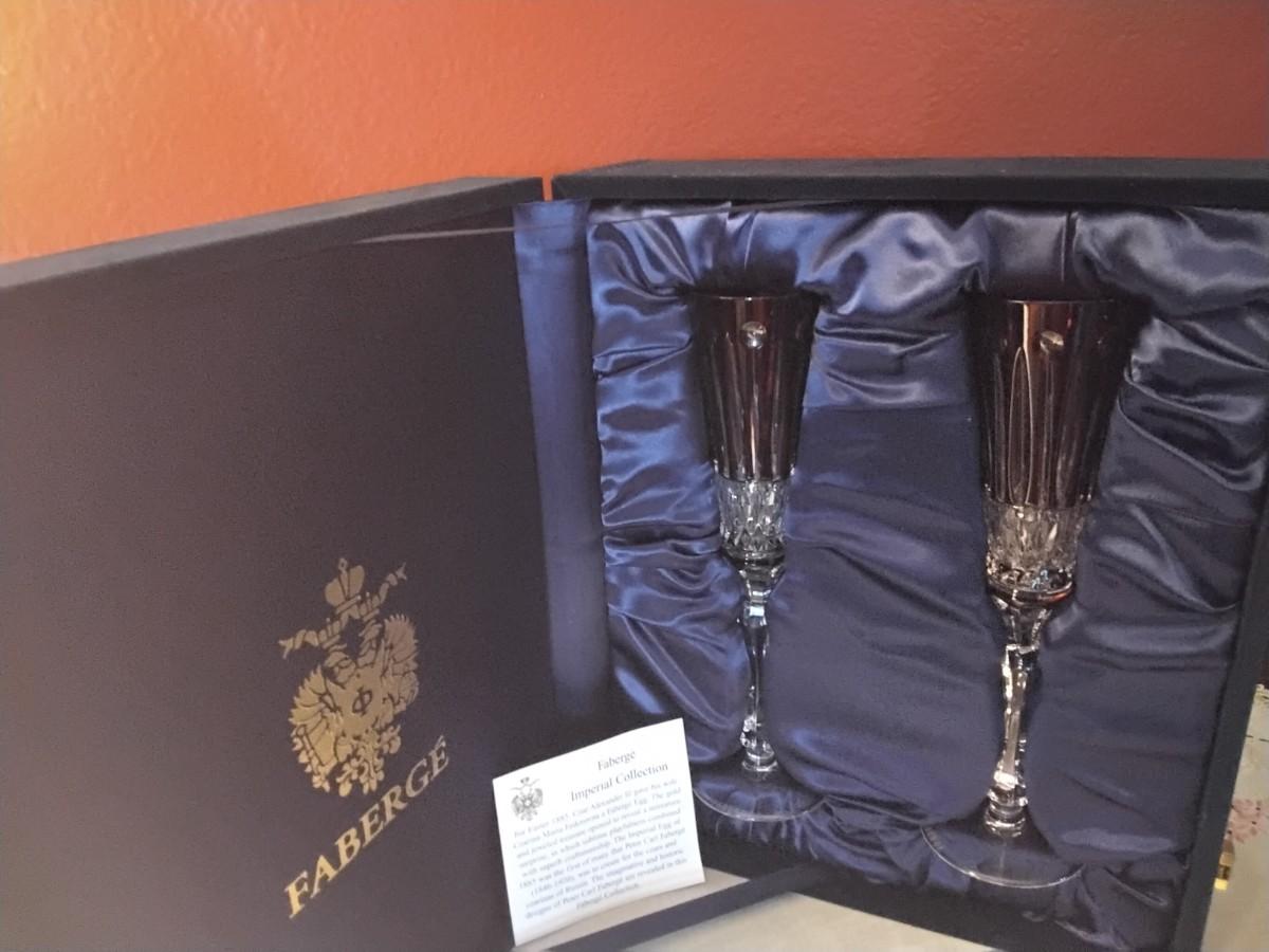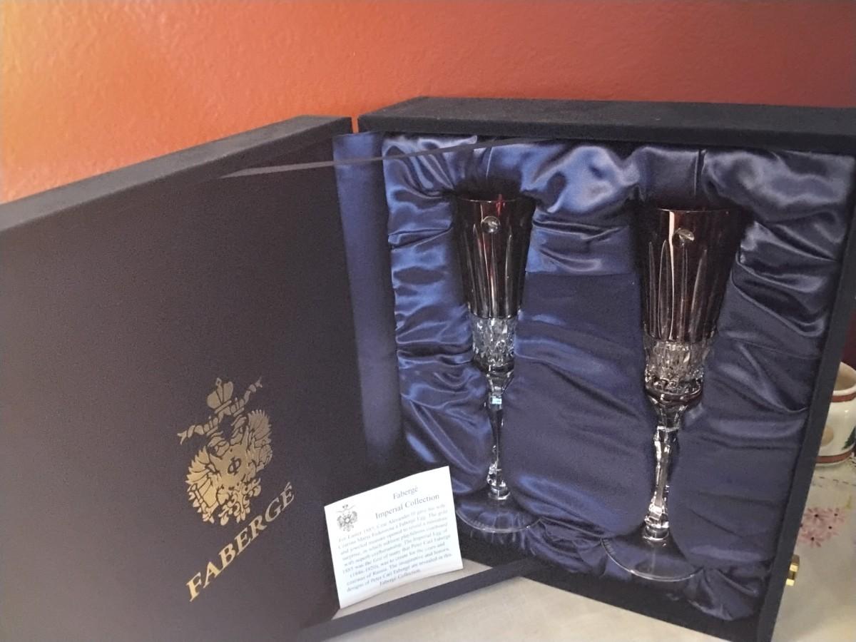 Great for Christmas Eve toasting, New Years, Valentines etc! Never used they are still in presentation box and stunning! 2 FABERGE XENIA Cased Cut to Clear Crystal CHAMPAGNE FLUTE GLASSES Genuine 24% Lead Crystal SIGNED/Etched "Faberge" on the rim of each glass. Pre-owned, Unused, kept in storage. With Blue Silk Velvet Faberge Presentation Case Brand: Faberge Faberge Pattern: XENIA Color: Ruby Red Height is approx: 8-7/8" Width across the mouth is approx: 2-1/4" When filled to the rim, holds approx. 4 oz