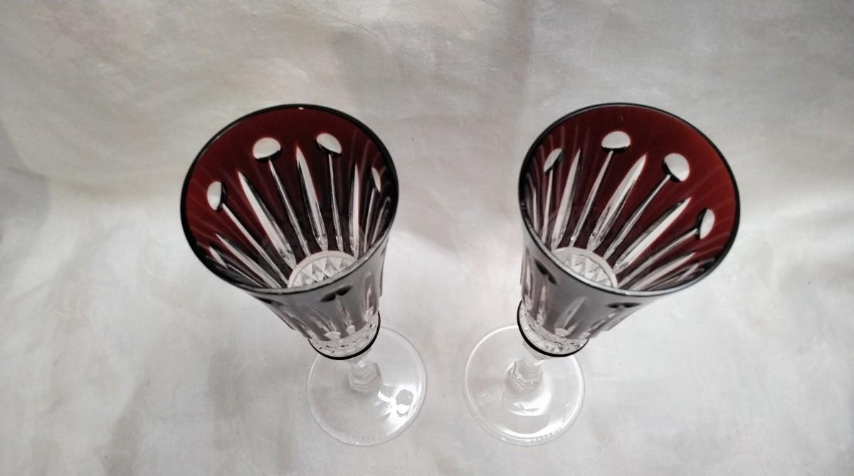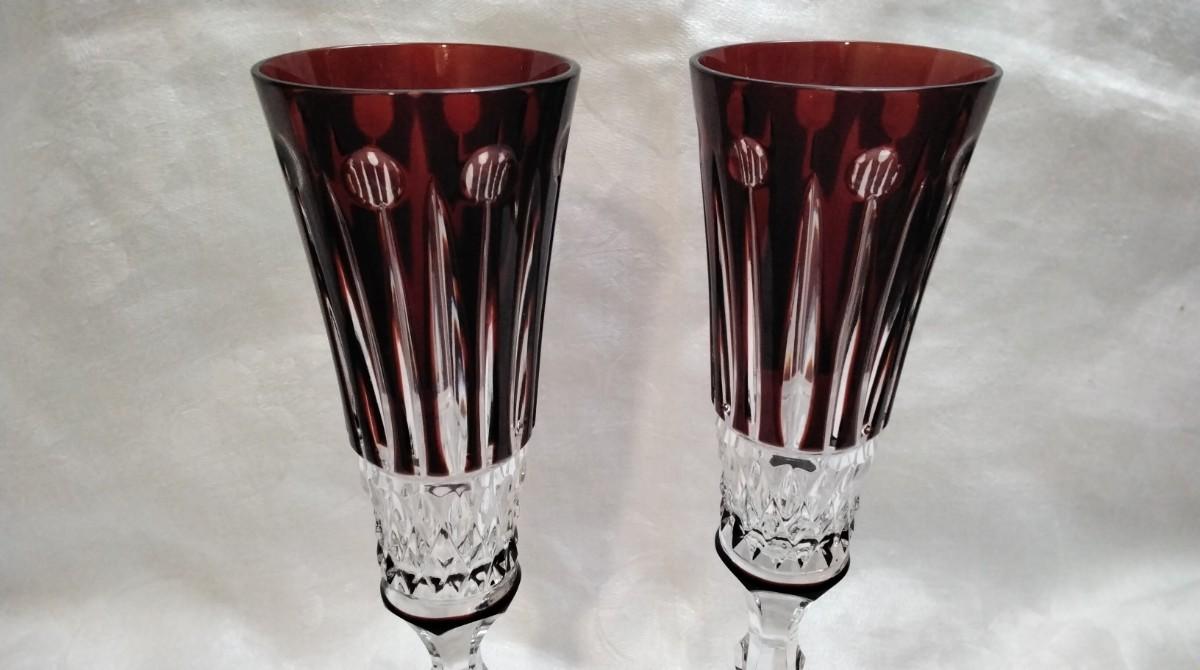 2 FABERGE XENIA Cased Ruby Red Cut to Clear Crystal CHAMPAGNE FLUTE GLASSES Genuine 24% Lead Crystal SIGNED/Etched "Faberge" on the base of each glass. With Blue Silk Velvet Faberge Presentation Case . When filled to the rim, holds approx. 4 oz. Measures 9" tall and 2 -1/4" top diameter
