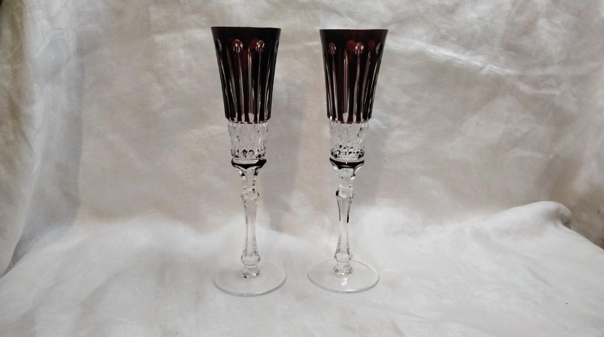 FABERGE Set of 2 XENIA Ruby Red Cut to Clear Crystal Champagne Flutes signed