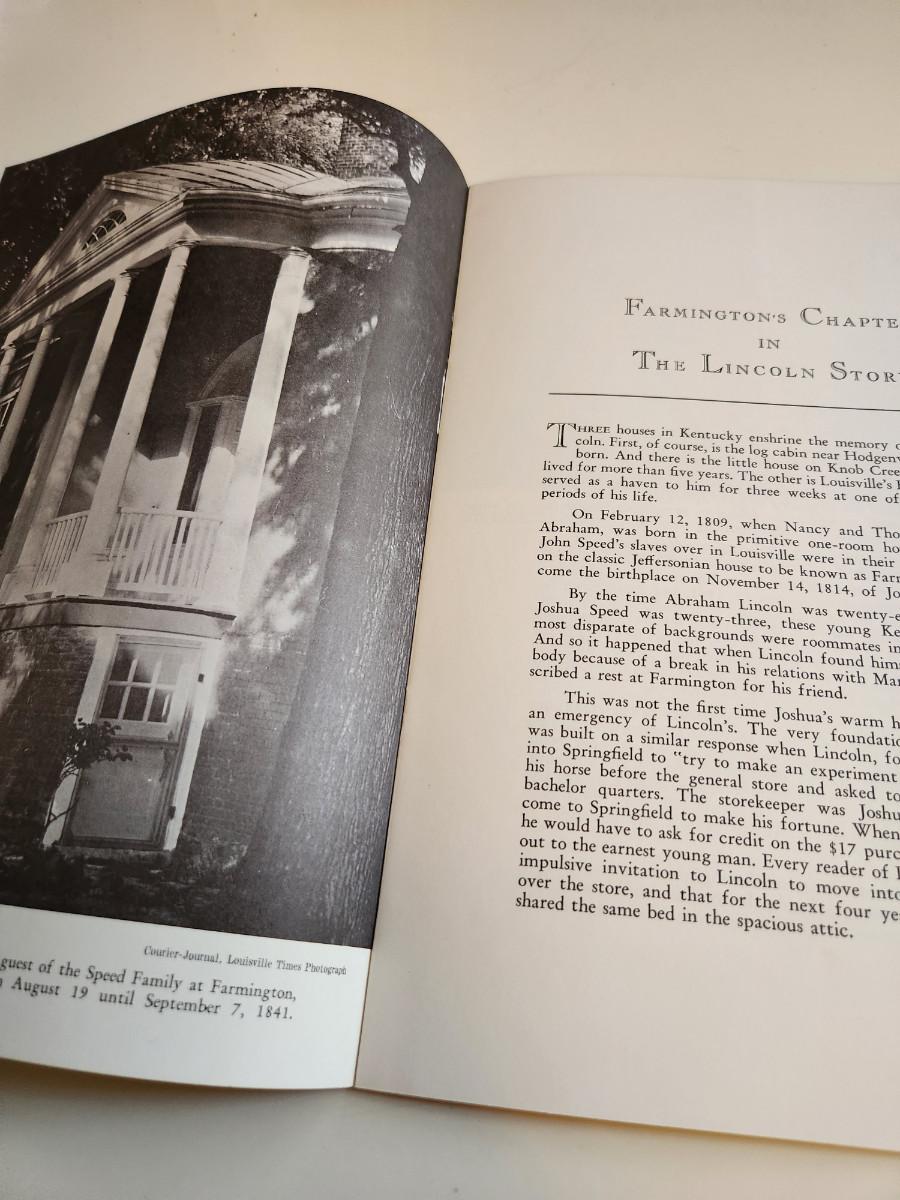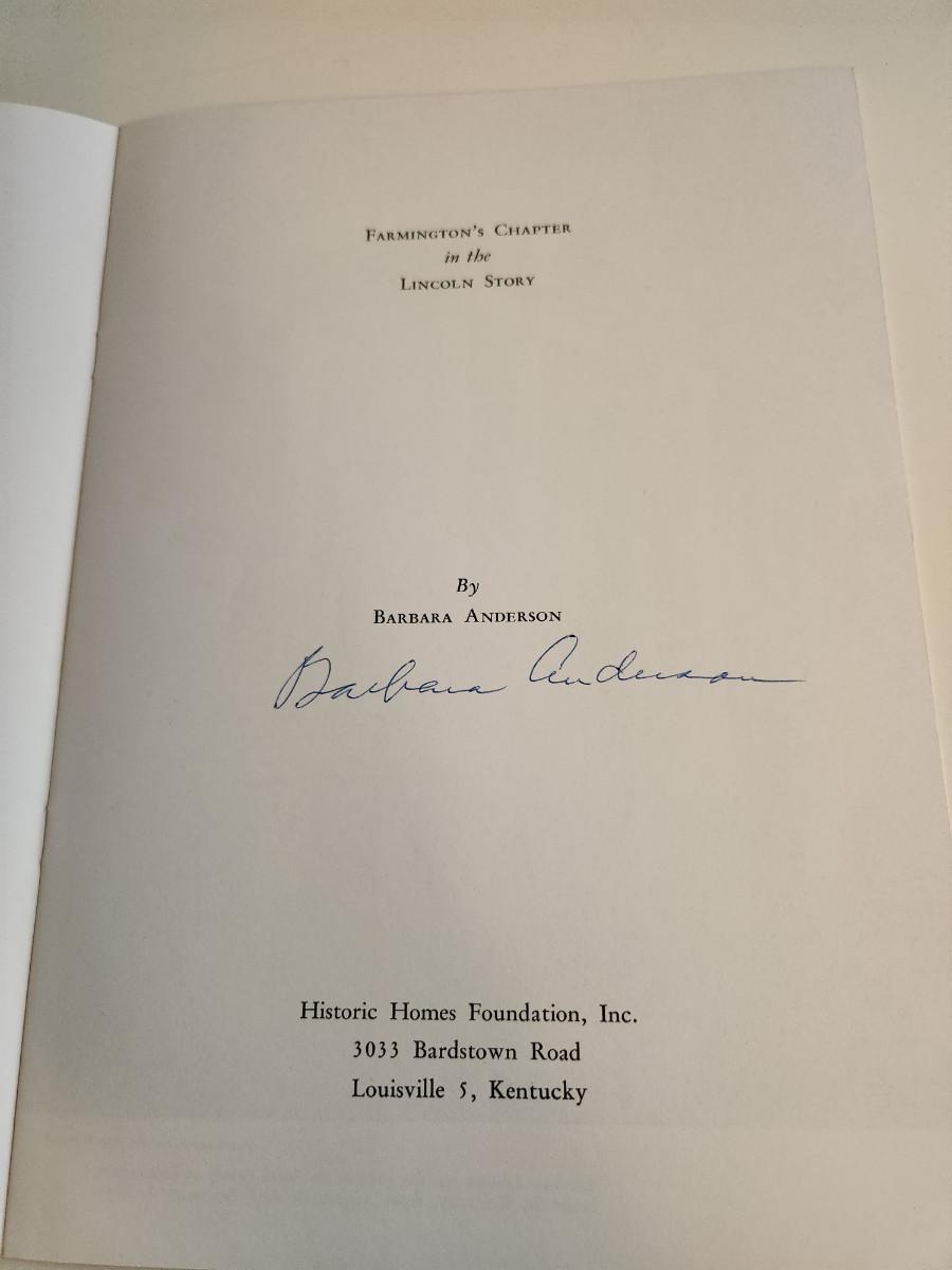 This auction lot is for an 8X10-sized Booklet entitled Farmington's Chapter in The Lincoln Story by Barbara Anderson - Autographed by the author. This privately produced small edition is in good condition for a vintage paper booklet, with some foxing on the back cover, of 16 pages. Published by Historic Homes Foundation, Louisville, KY. Not dated.