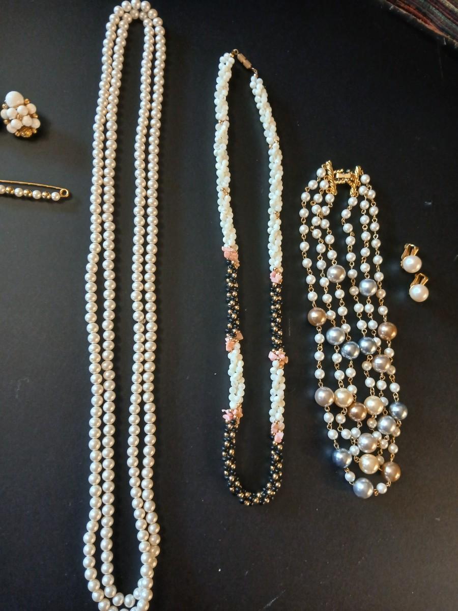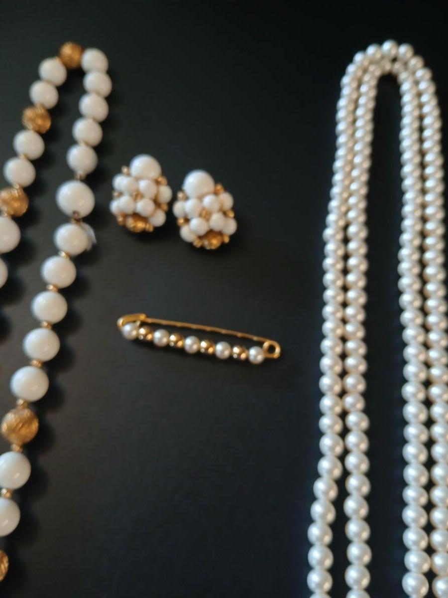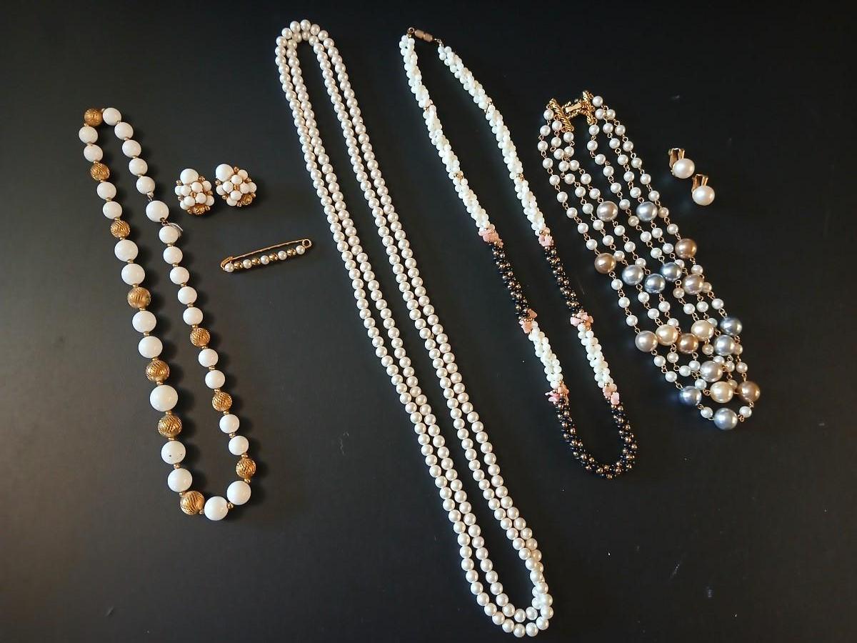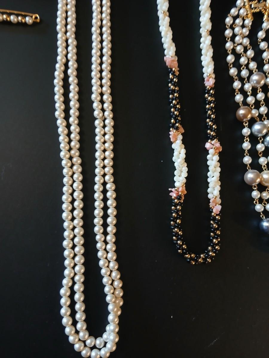 Faux pearl necklaces - brooch - earrings- and a beautiful, beaded necklace