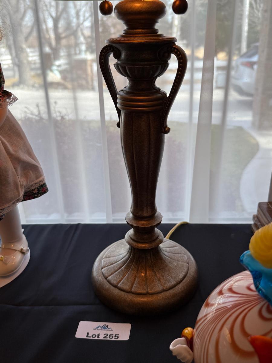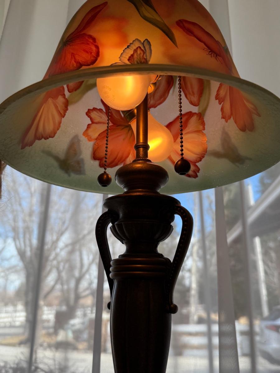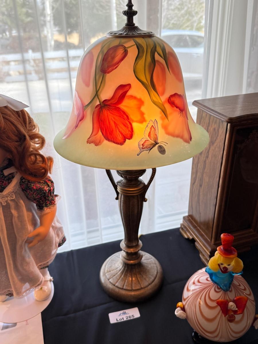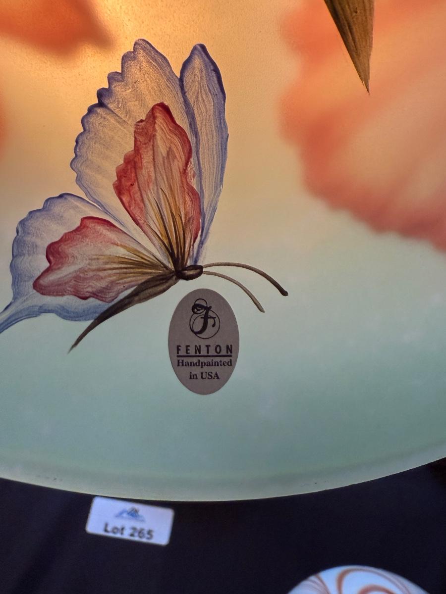 Fenton glass floral shade w/butterfly 2 bulb 25”t table lamp
