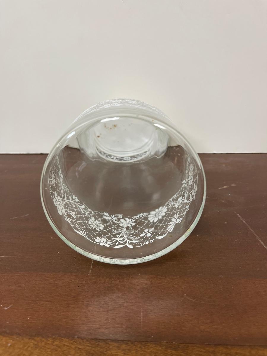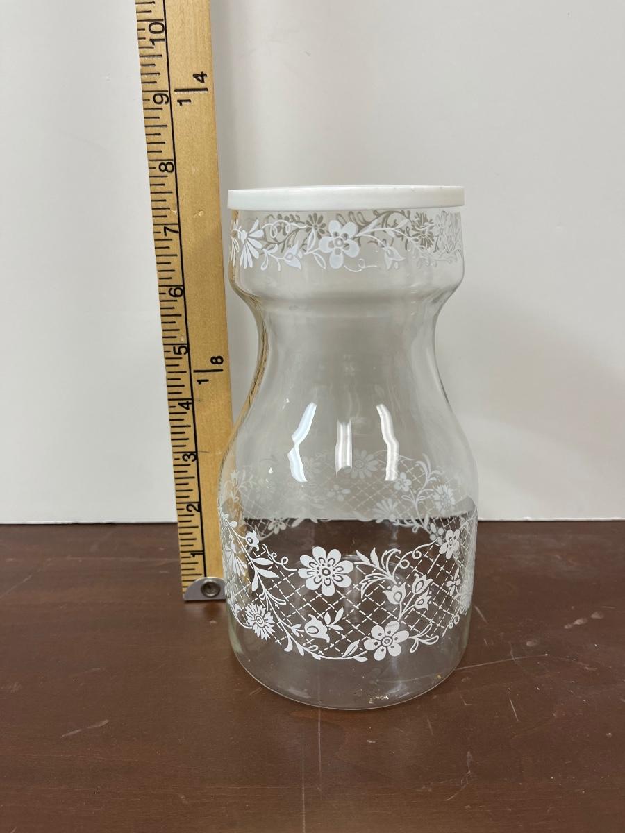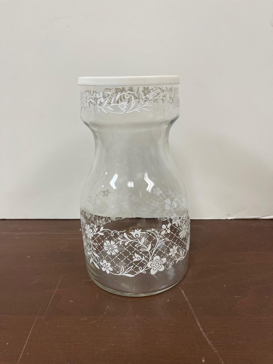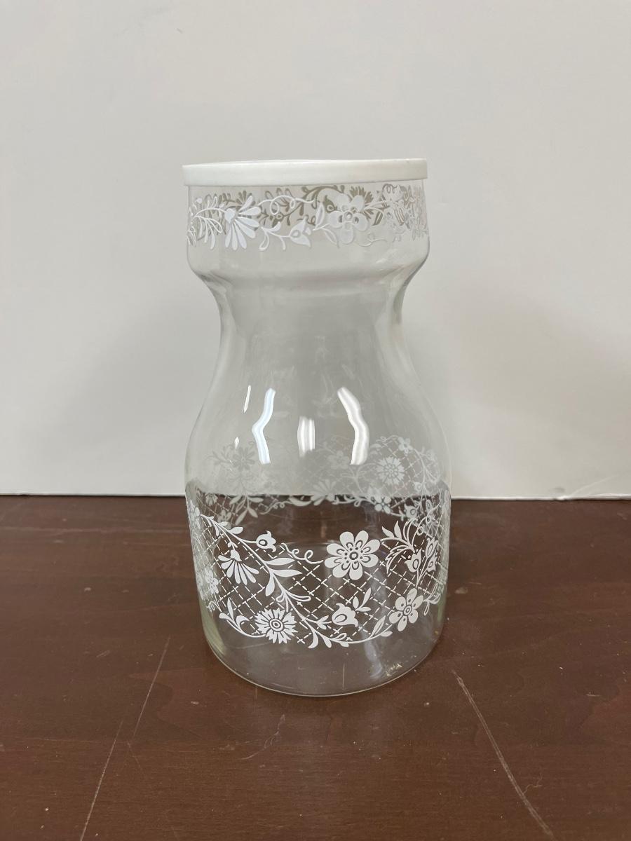 Vintage Retro Glass Juice Carafe with White Flower Lattice Print and Plastic Lid