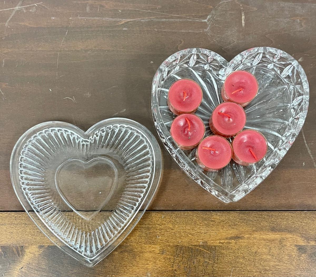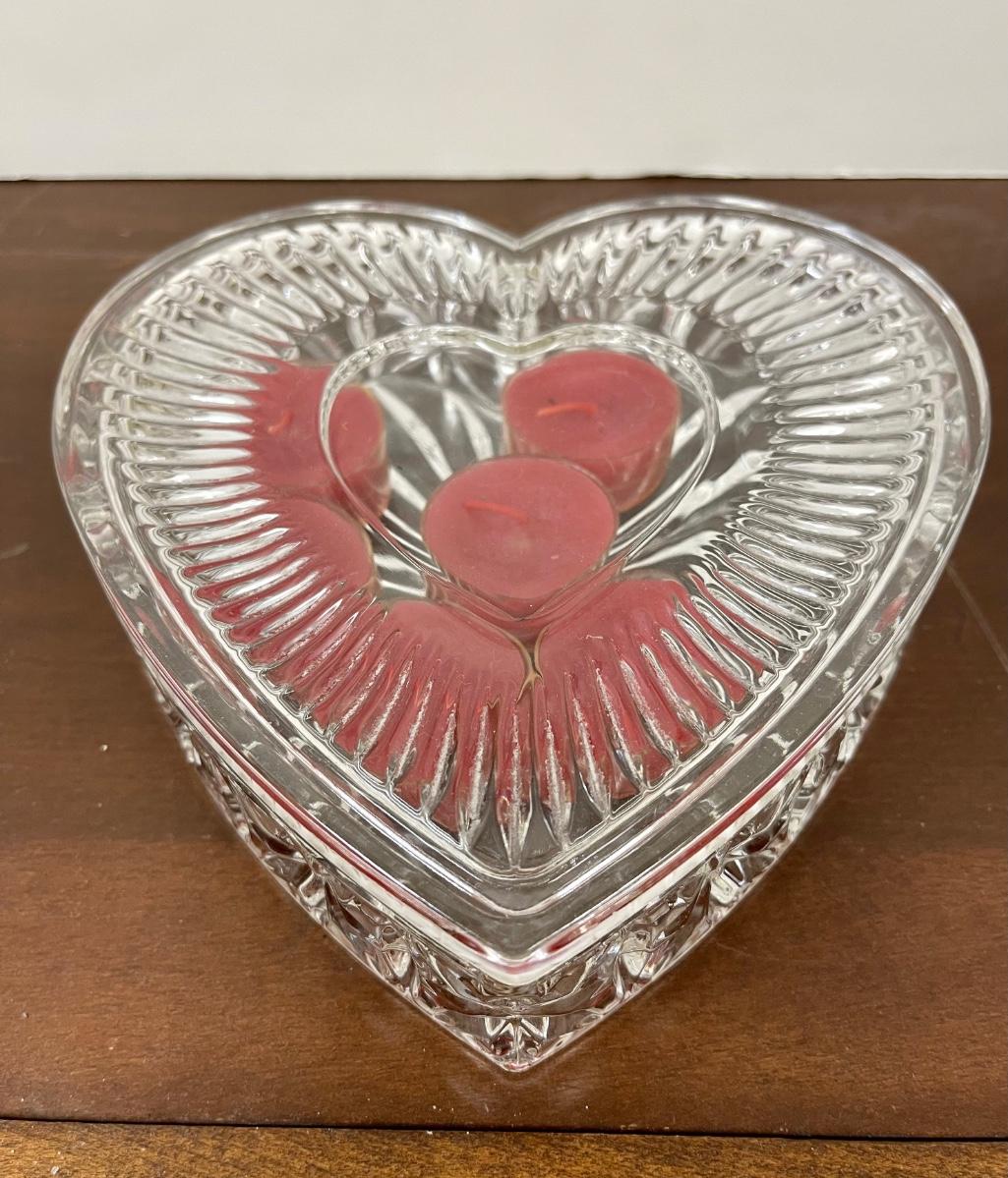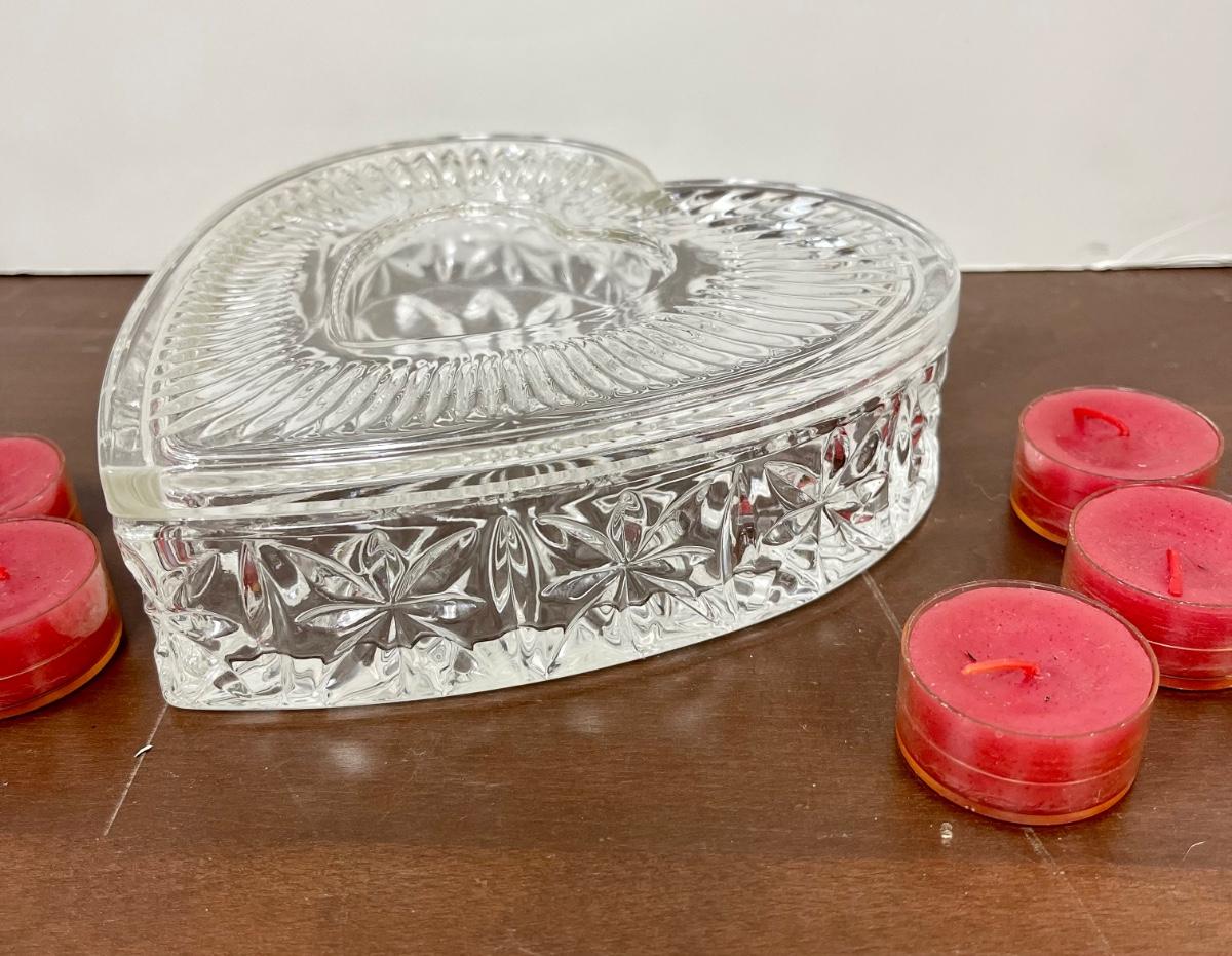 Retro Pressed Glass Crystal Heart Shaped Lidded Jewelry Trinket Dish with Tealight Candles