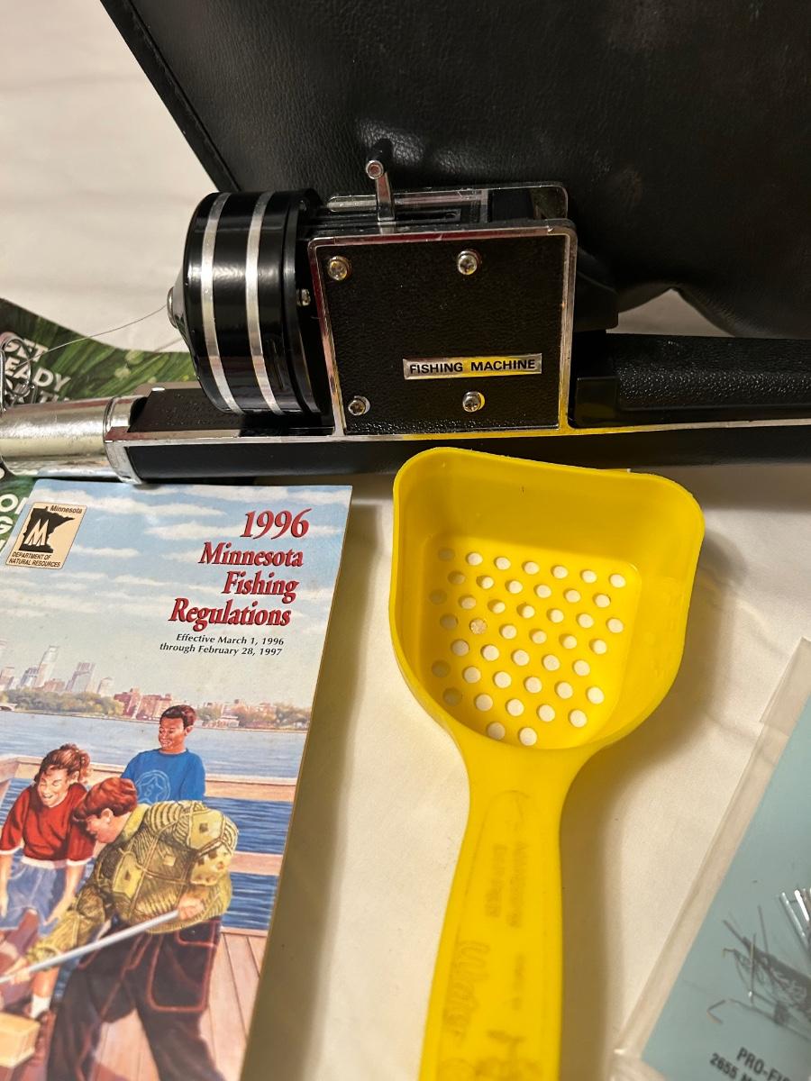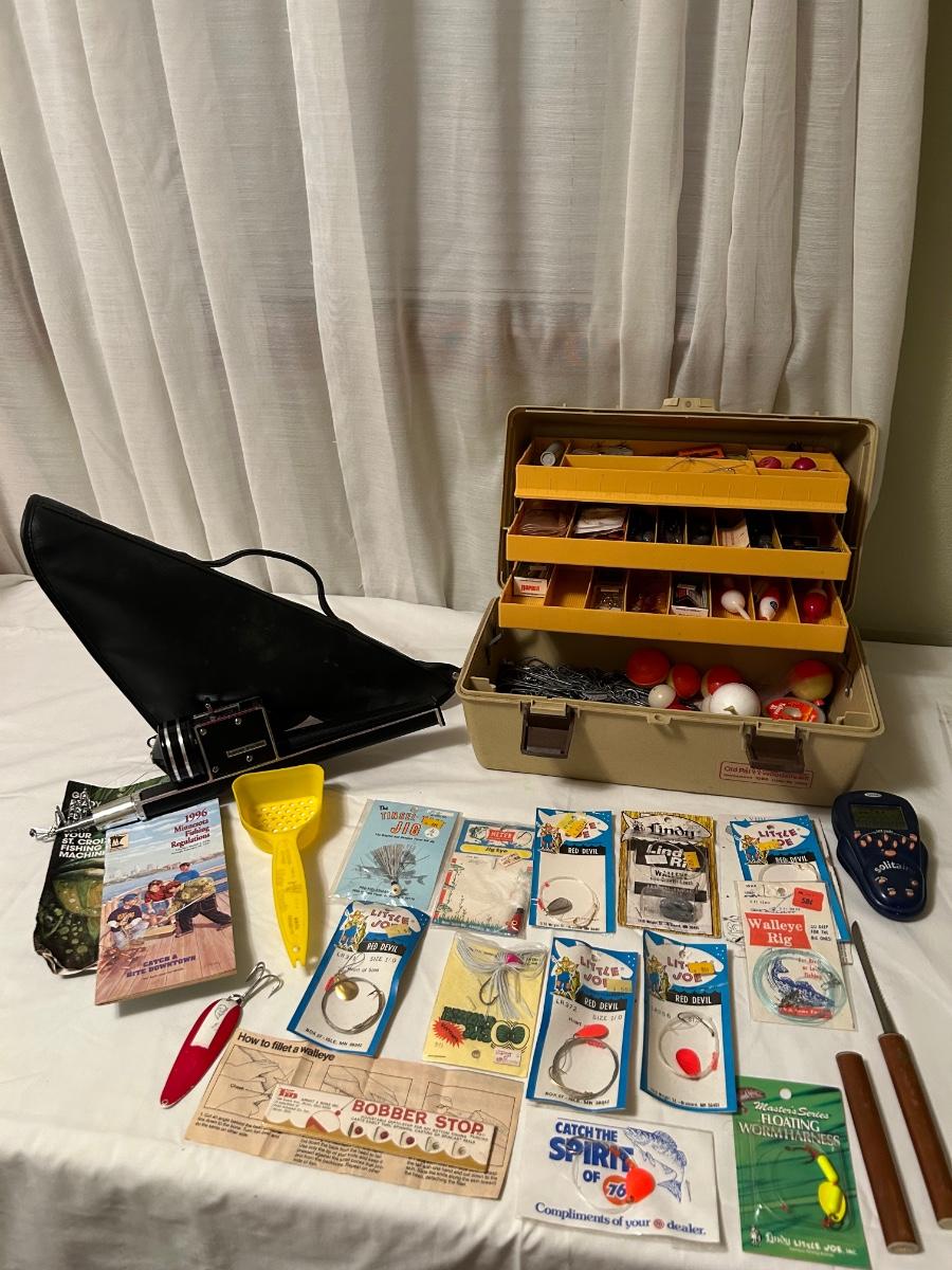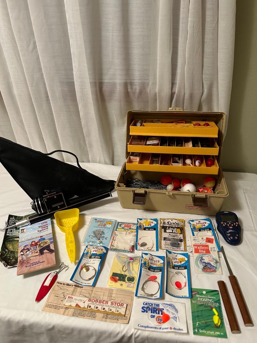 Tackle box all included. Hand held mini fishing rod with case. Assorted literature handouts and bobbers to boot.