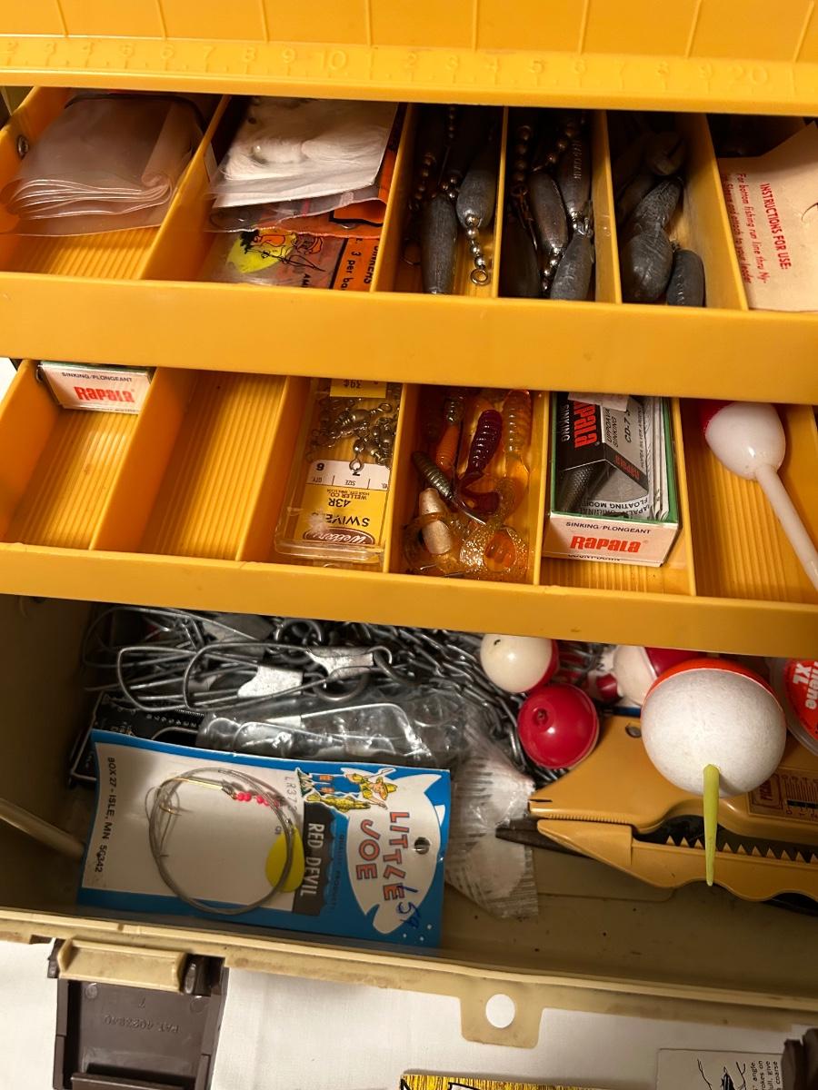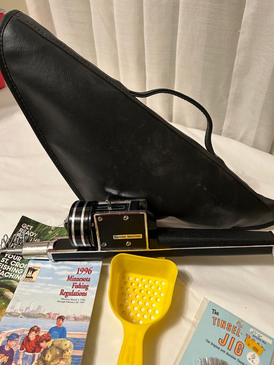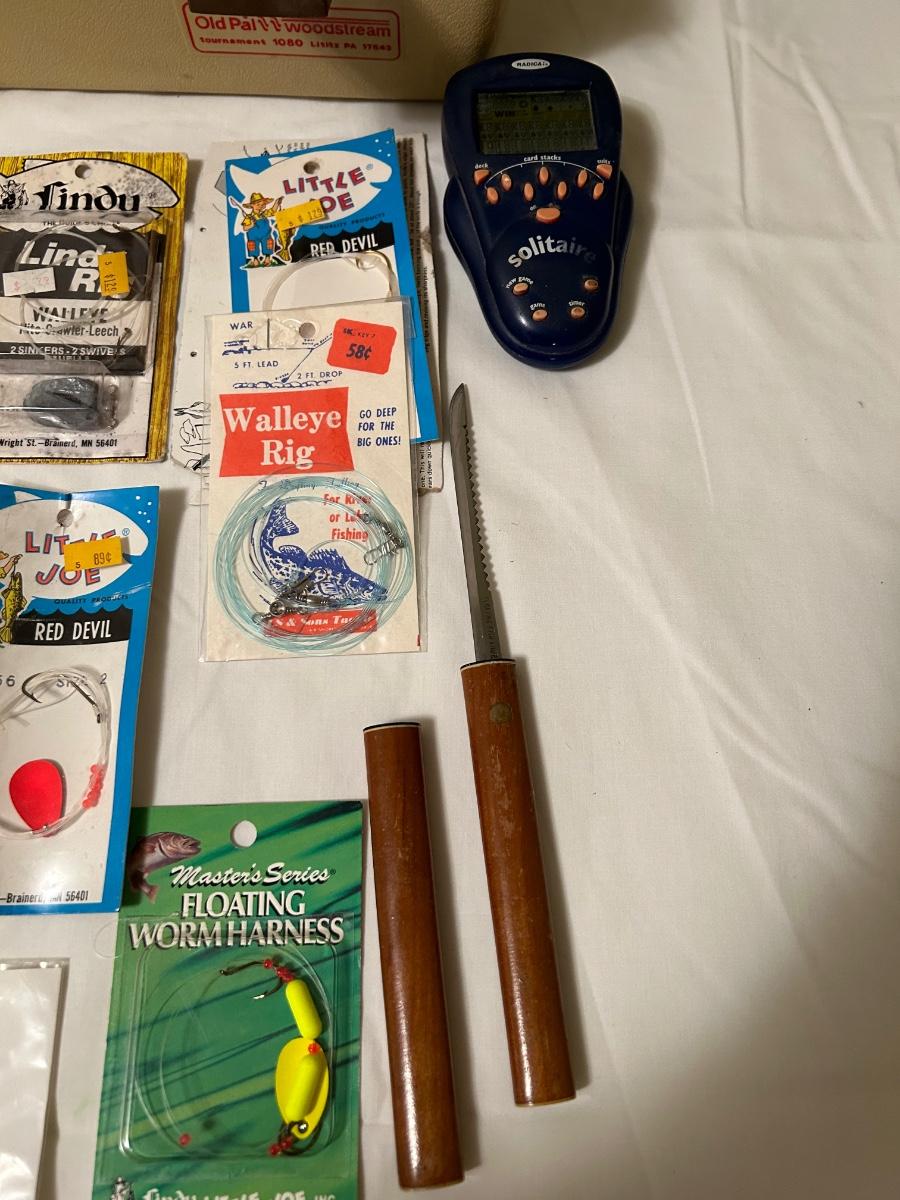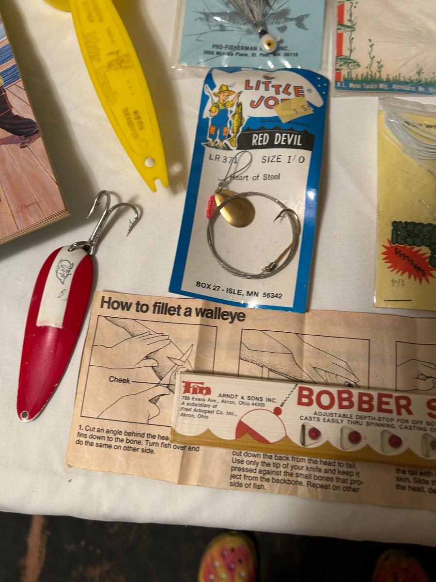 Tackle box all included. Hand held mini fishing rod with case. Assorted literature handouts and bobbers to boot.