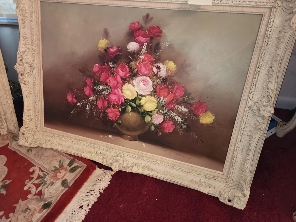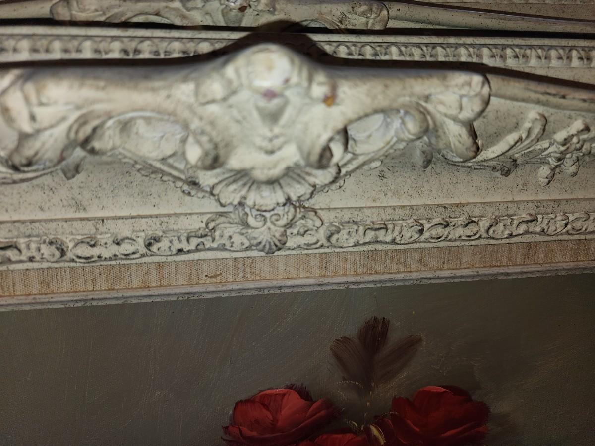 46 by 34 inches. Small crack in frame noted in pics is at upper right corner. Heavy resin type frame.