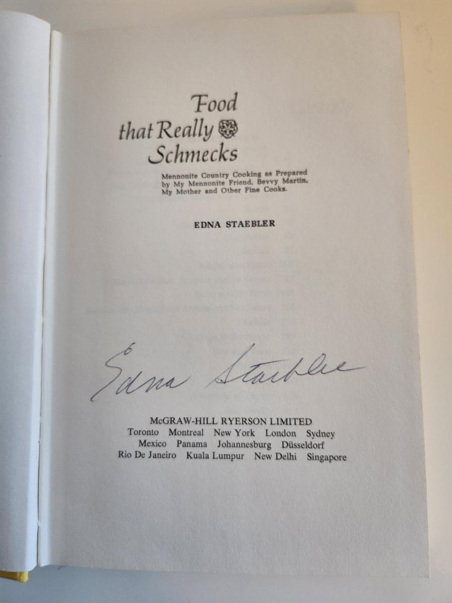 This auction lot is for a copy of the cook book Food That Really Schmecks by Edna Staebler - Autographed by the author. This book revels in Mennonite Country Cooking and how to accomplish it. This is a hard bound book with dust cover in good condition with light staining on the bind and concideration that it has some shelf aging. Published by McGraw in 1968. 298 Pages.