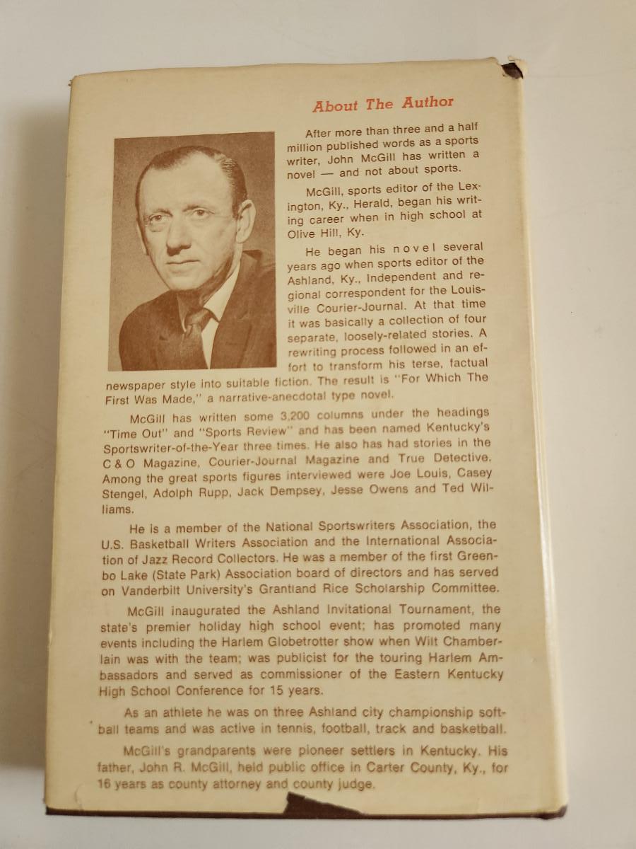 This auction lot is for a copy of the book For Which The First Was Made by John McGill - Autographed by the author. Published by Qualls, Hood & Co., 1974. First edition hardback. A lovely copy. NOT merely a 'Good' copy, since that denotes significant wear.. First edition. Signed. A novel written by a Kentuckian about romance and adventure in the setting of Kentucky's famous Carter Caves.