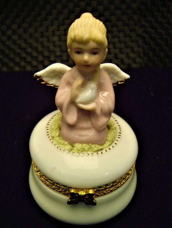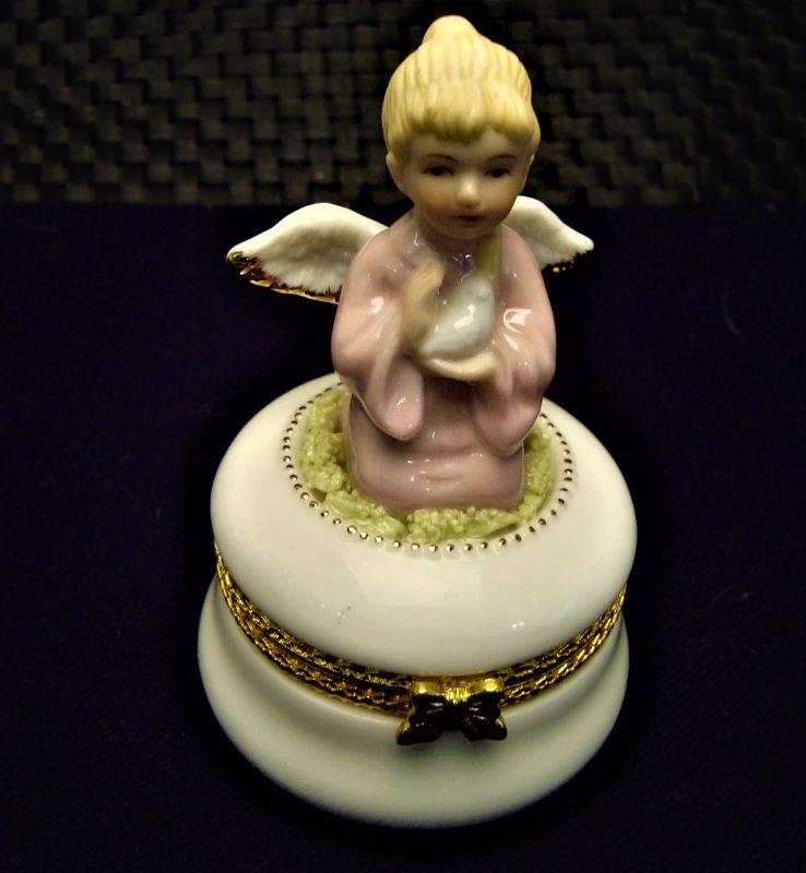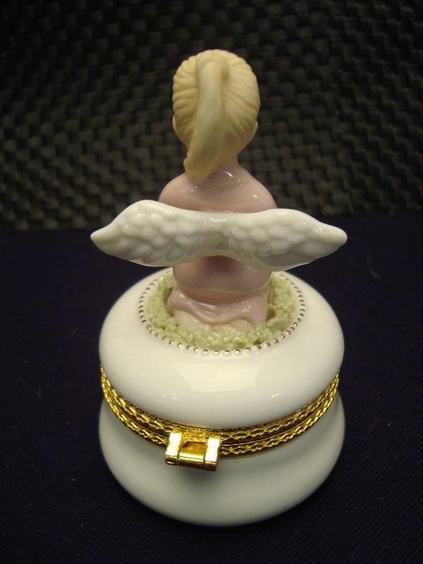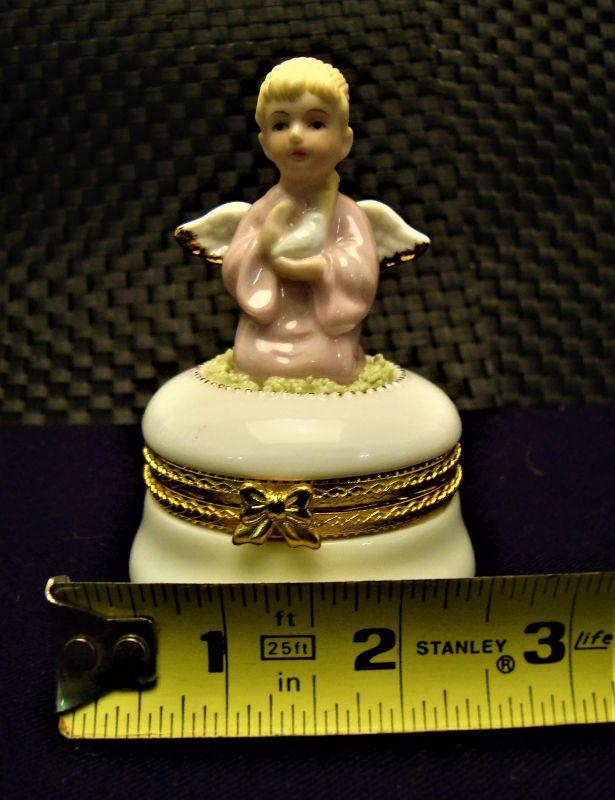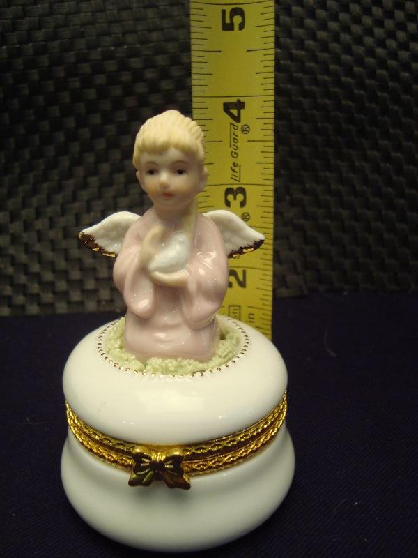 Beautiful, Vintage Hand Painted Porcelain Trinket Box, Young Girl with Angel Wings, Gold Trimming. In Good Condition, no chips or cracks noticed 2.5" x 2.5" x 4"