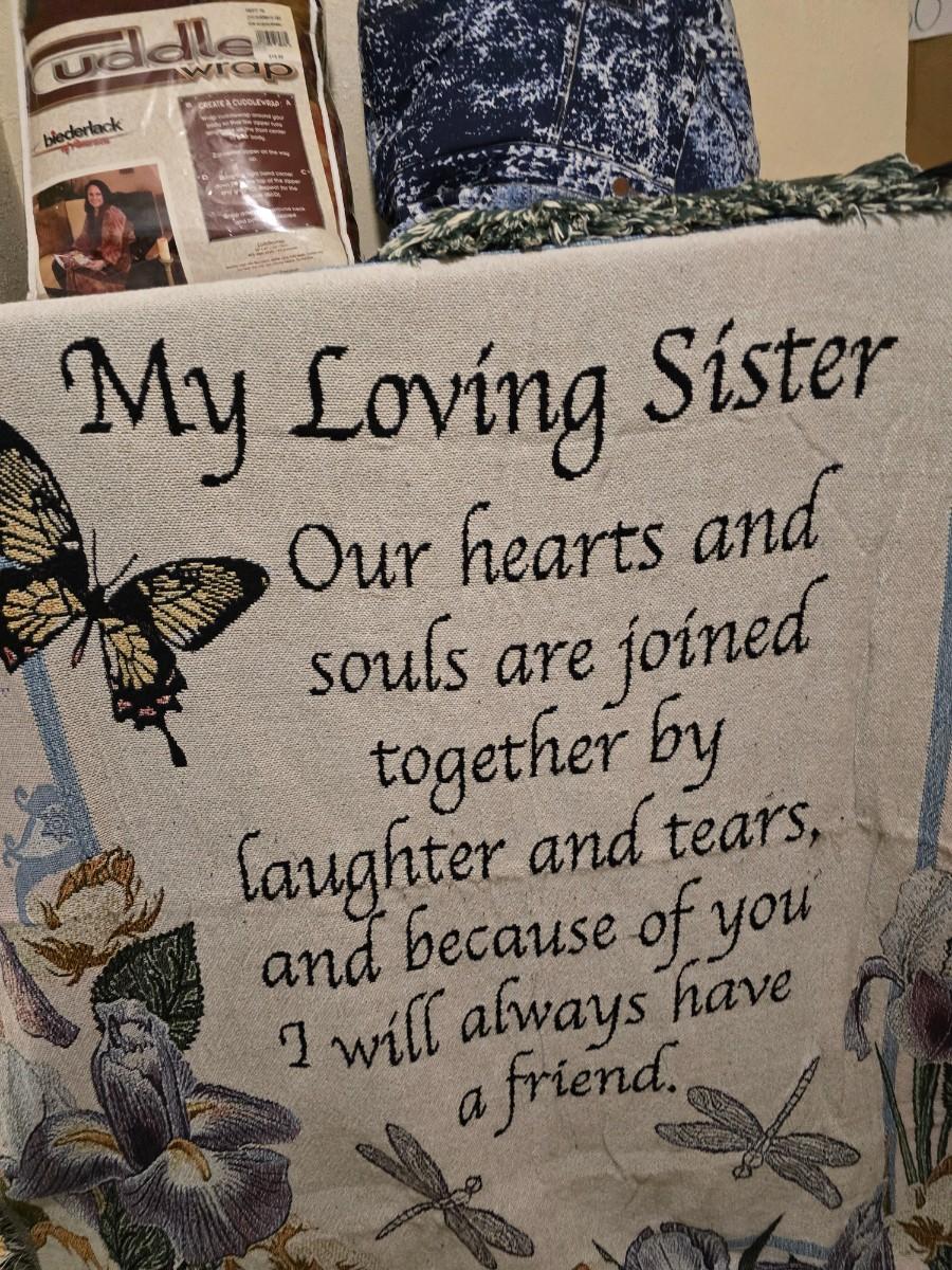 Four throw blankets - My loving sister - Blue jean print - Animal print - and a cuddle wrap