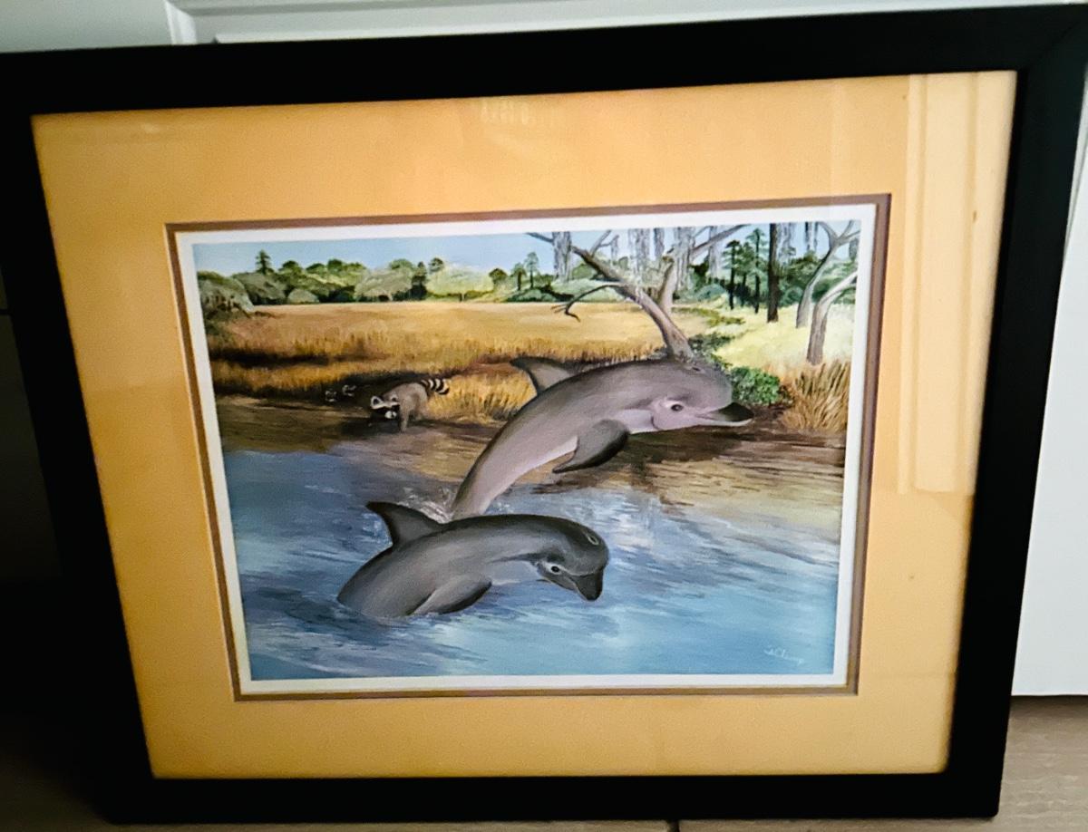 FRAMED ART S. CLAMP PAIR OF DOLPHINS 19"X22"