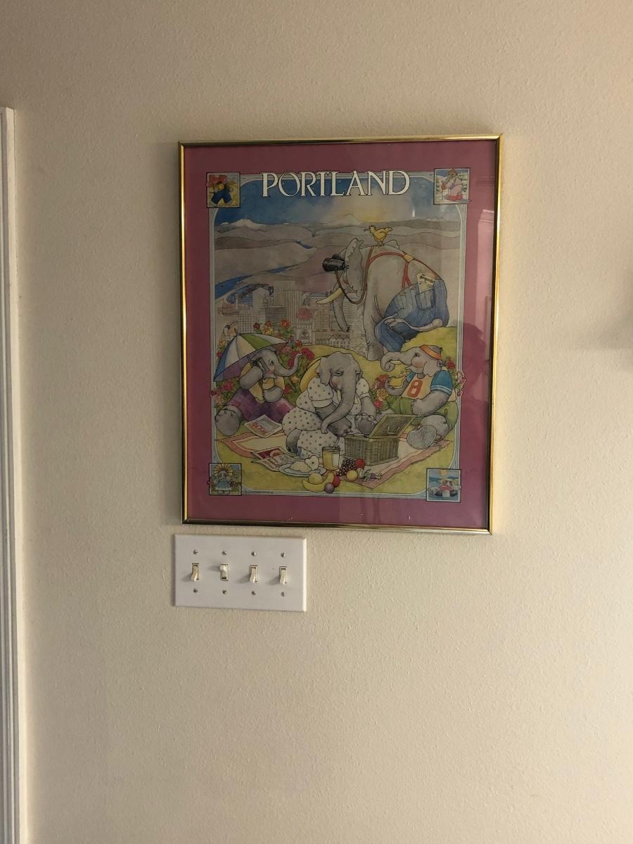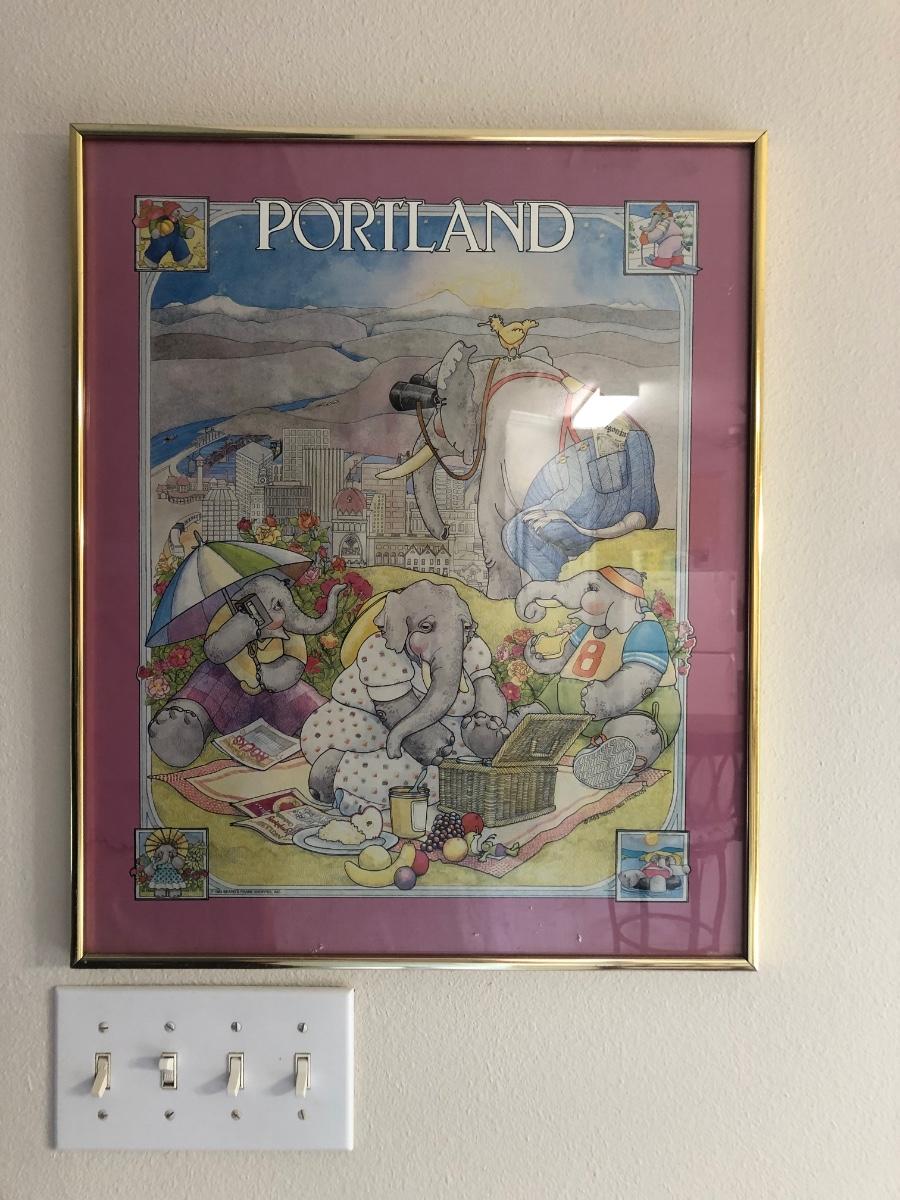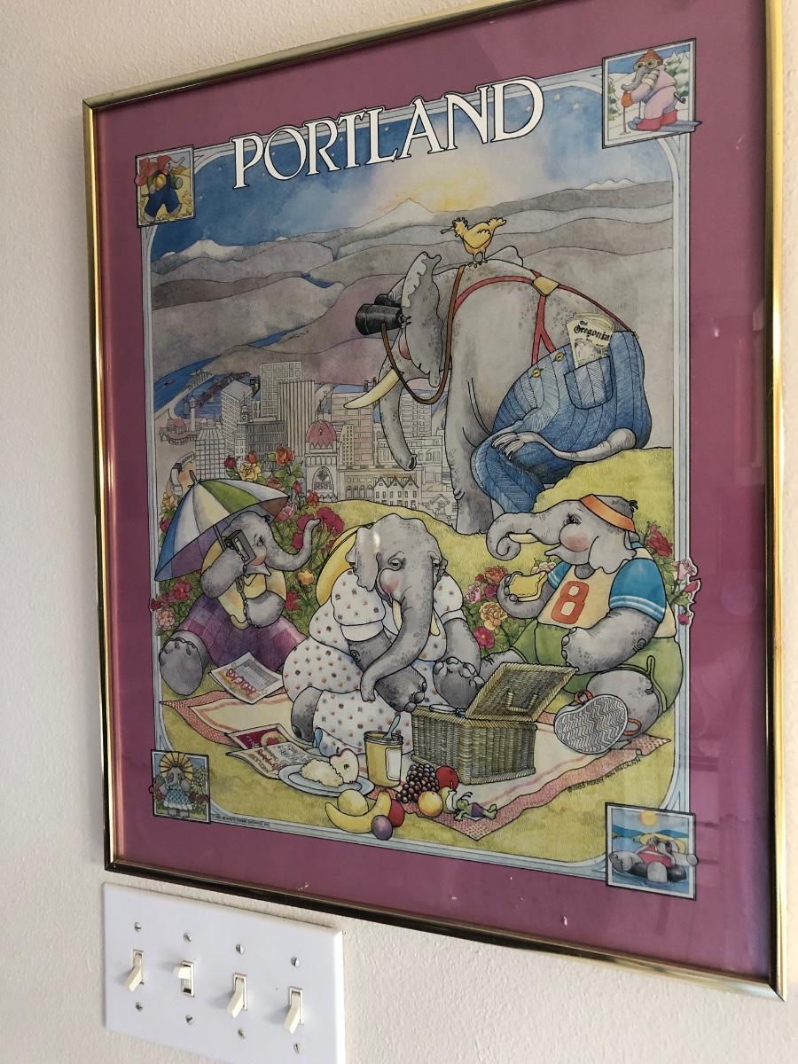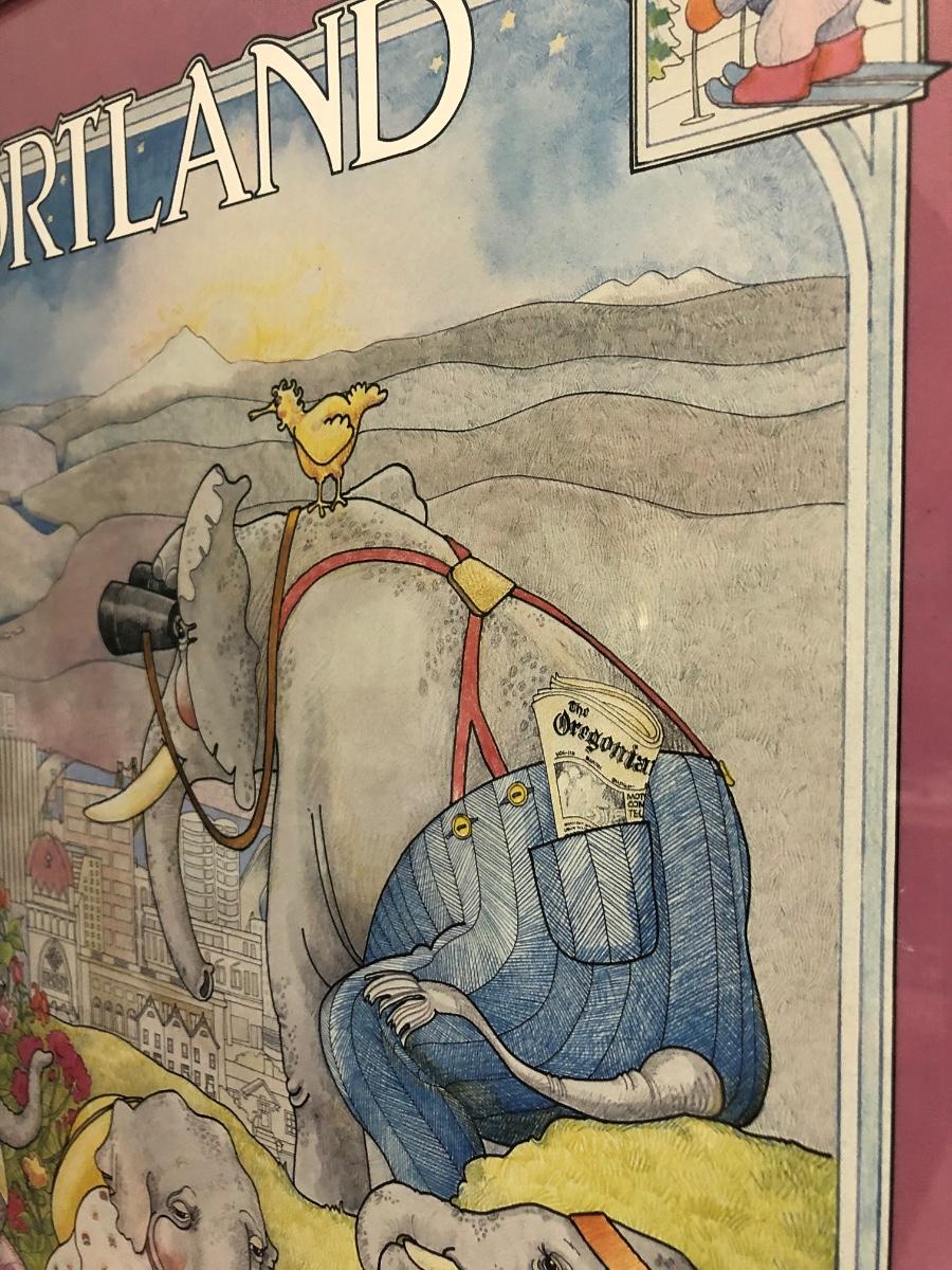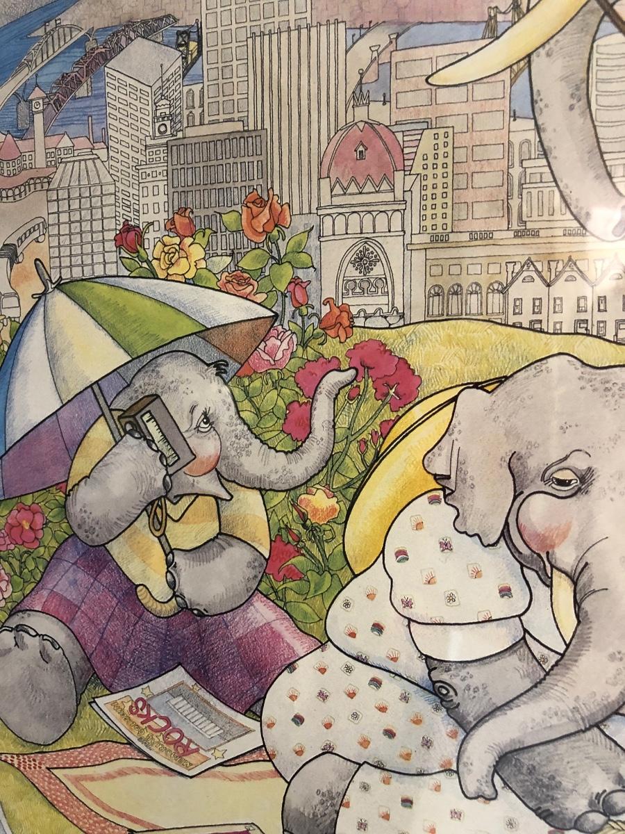 Washington park zoo in Portland by merry Ann mcglinn. Elephants picnicking in the rose garden with city skyline and bridges in backdrop. 18 wide, 22 long.faint water damage to very bottom see pictures.