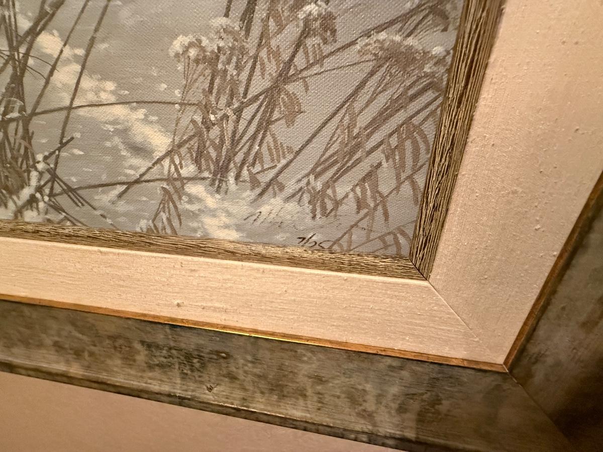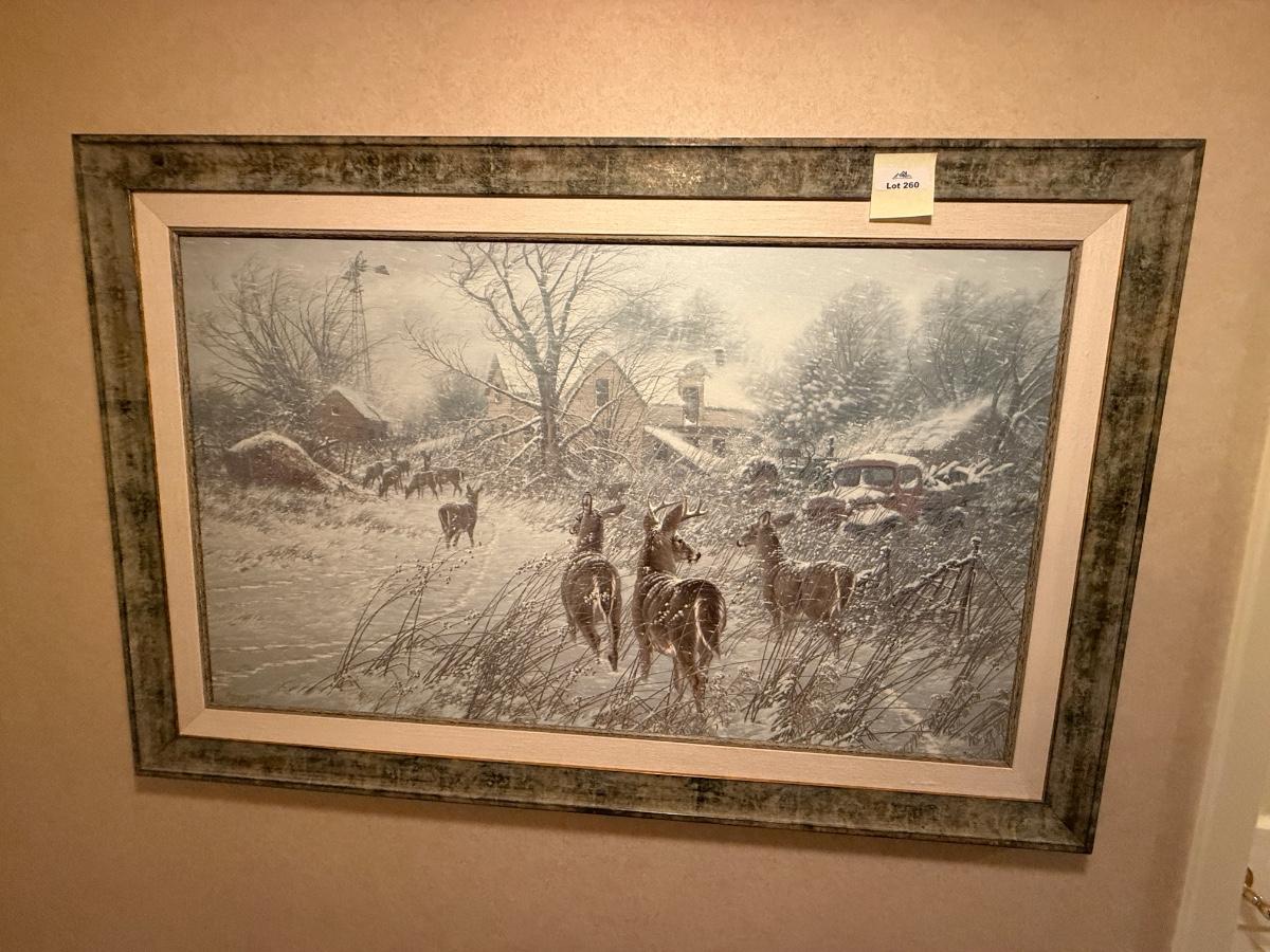 Snowy Deer scene 38” t x 58”w large framed art piece from 2002