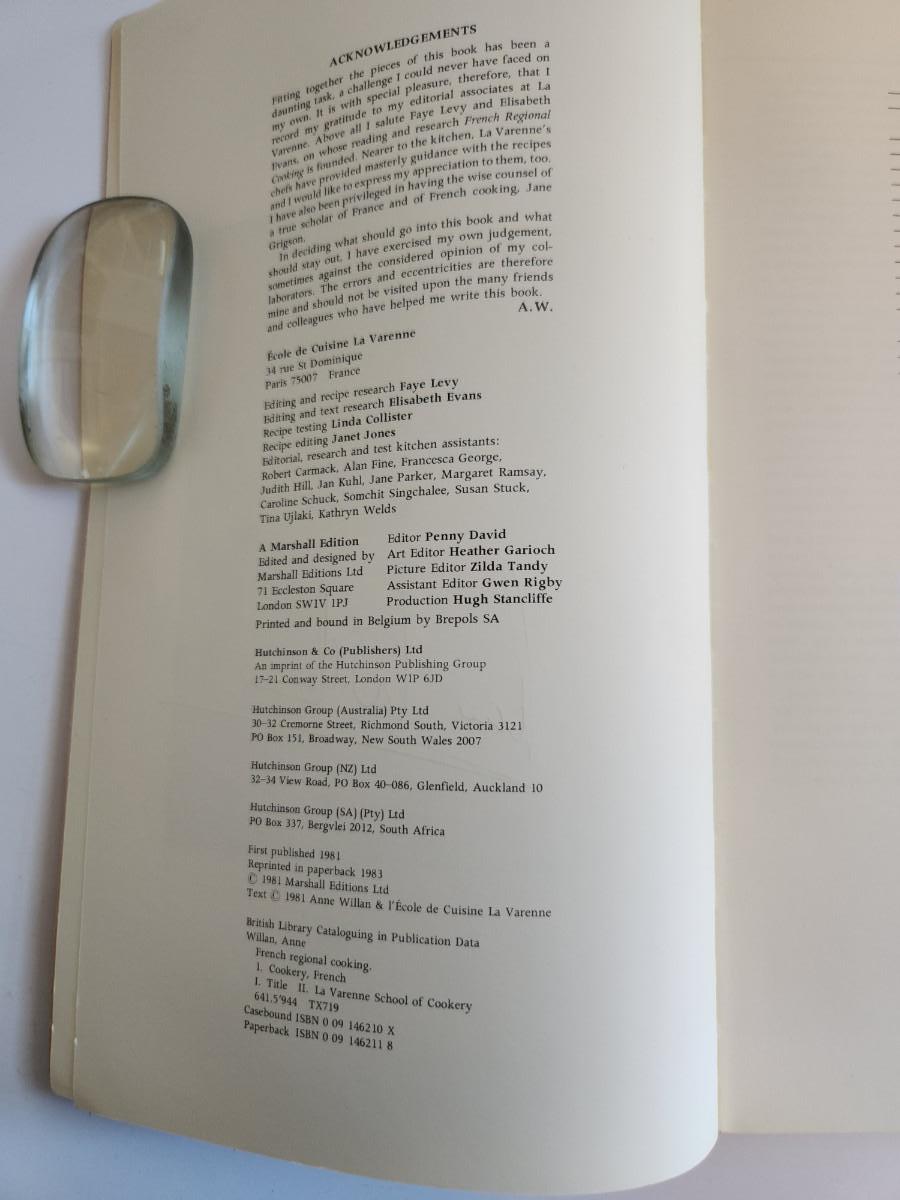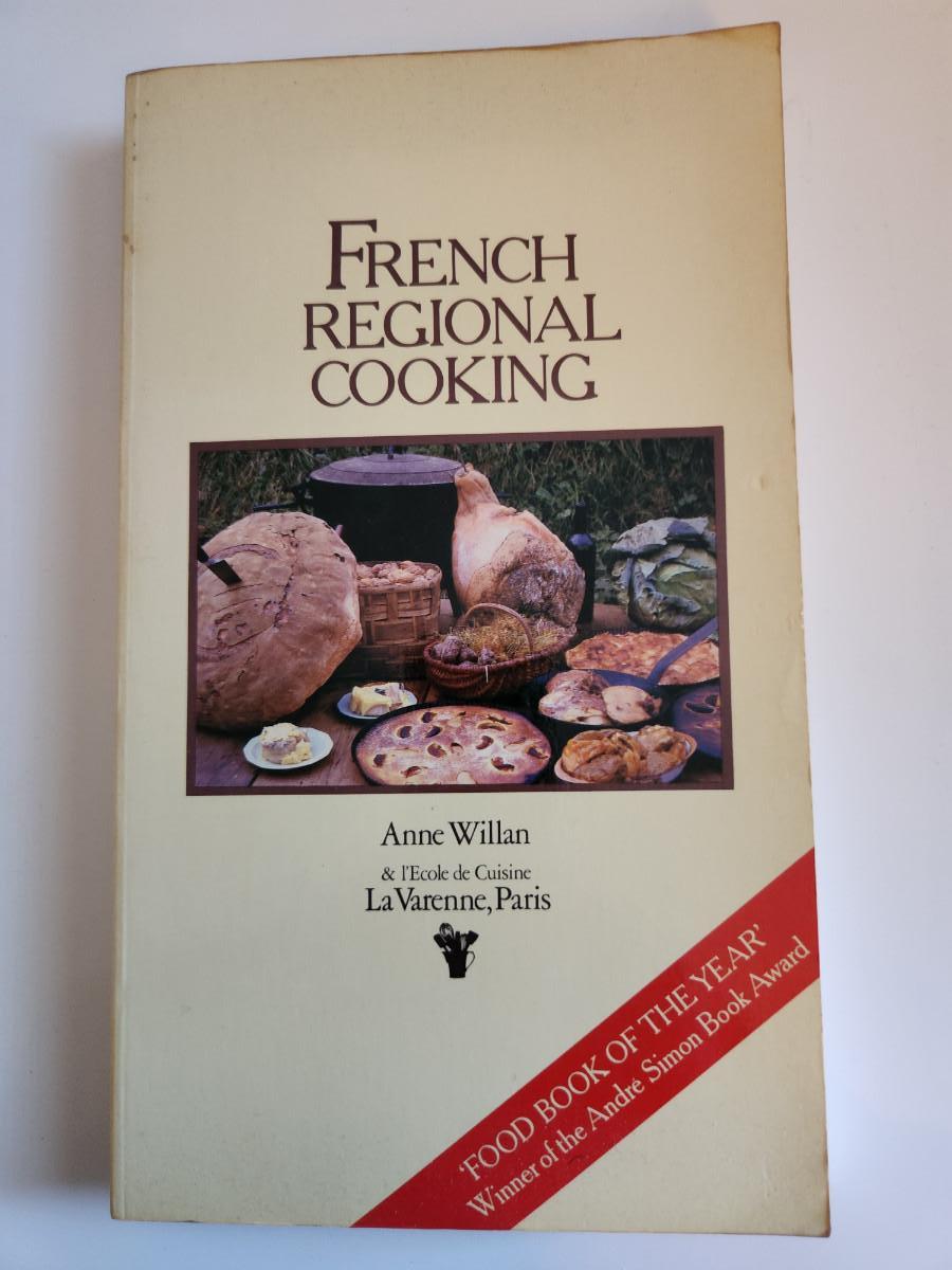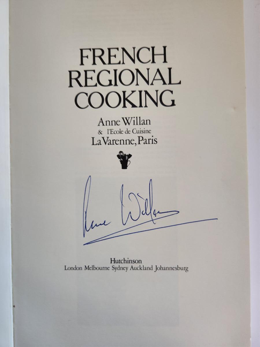 This auction lot is for a copy of the book French Regional Cooking by Anne Willian - Autographed by the author. Ms. Willan, now retired, was the founder of the very famous Chateau du Fey Cooking School outside of Paris, France. Published by Hutchinson in 1981. This book is a tall paper bound book in OK condition. The book has shelf aging and kitchen wear but is quite useable and collectible.. 320 Pages.