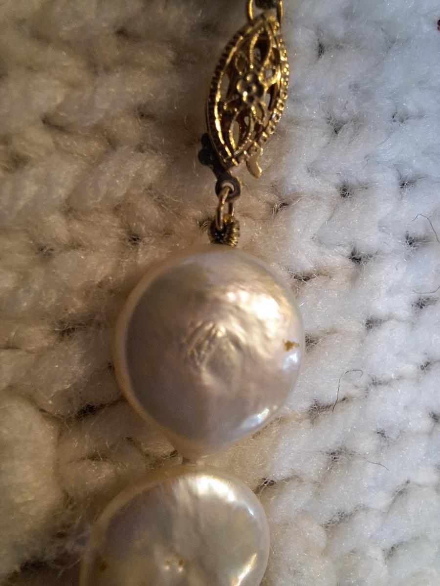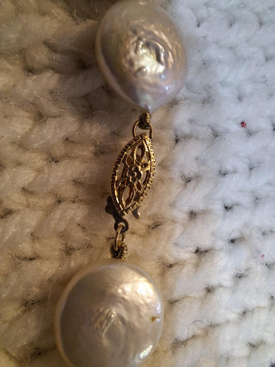 These are real pearls and the clasp is marked 14k, they are the flat type pearls often referred to as "coin" pearls please see all photos.