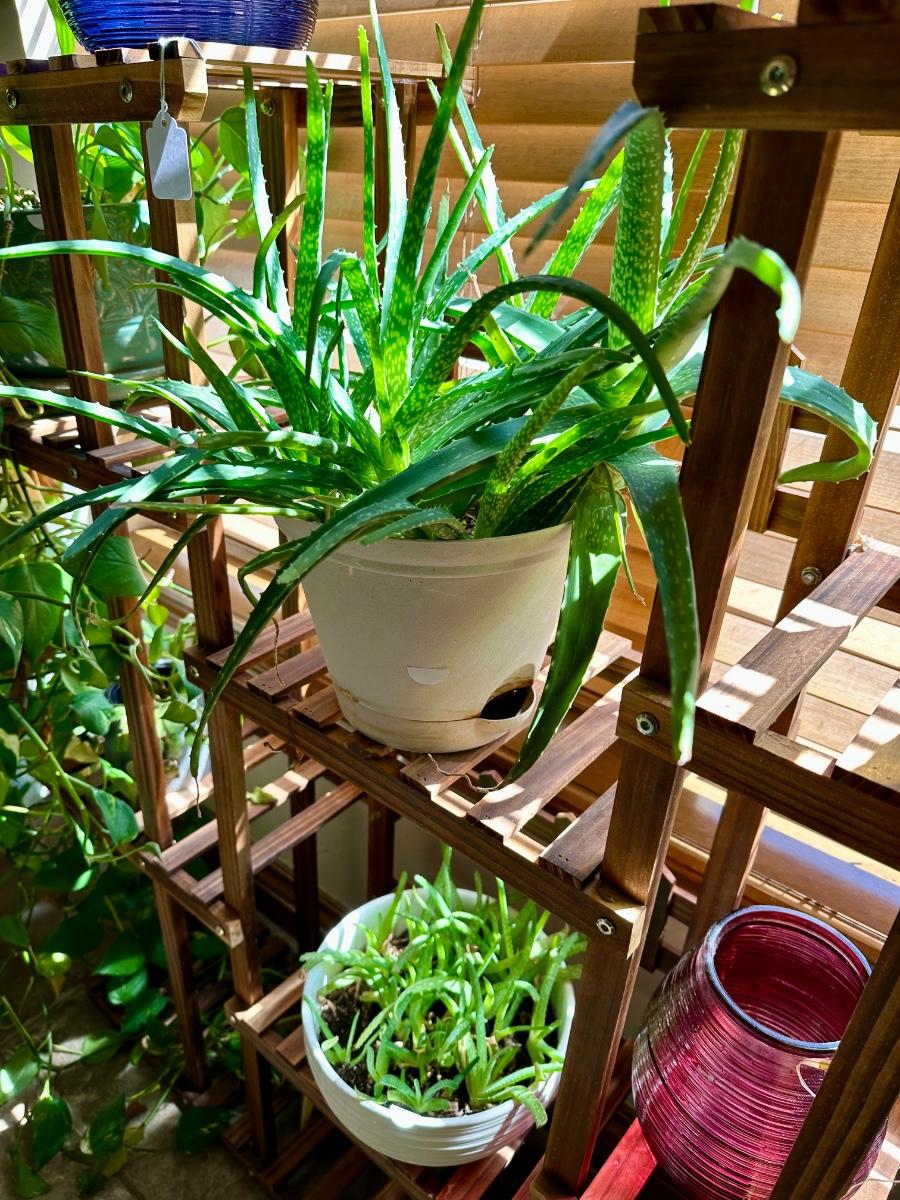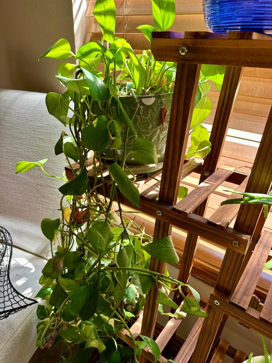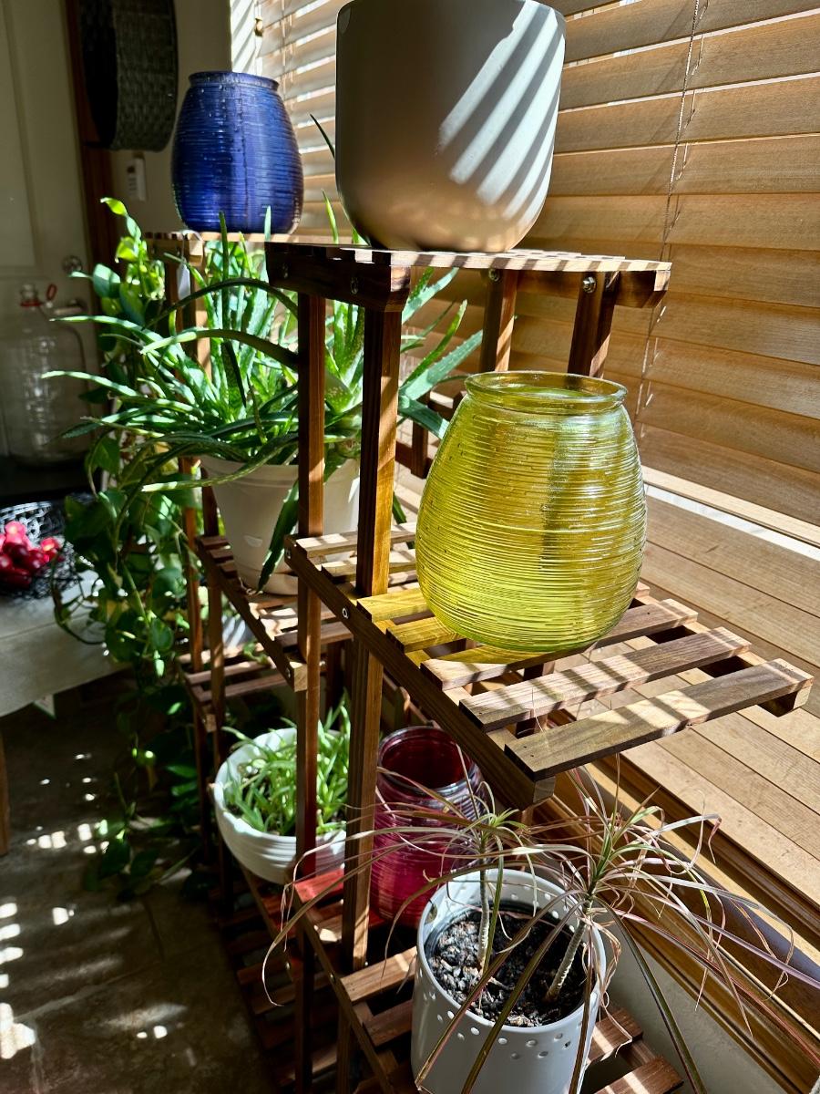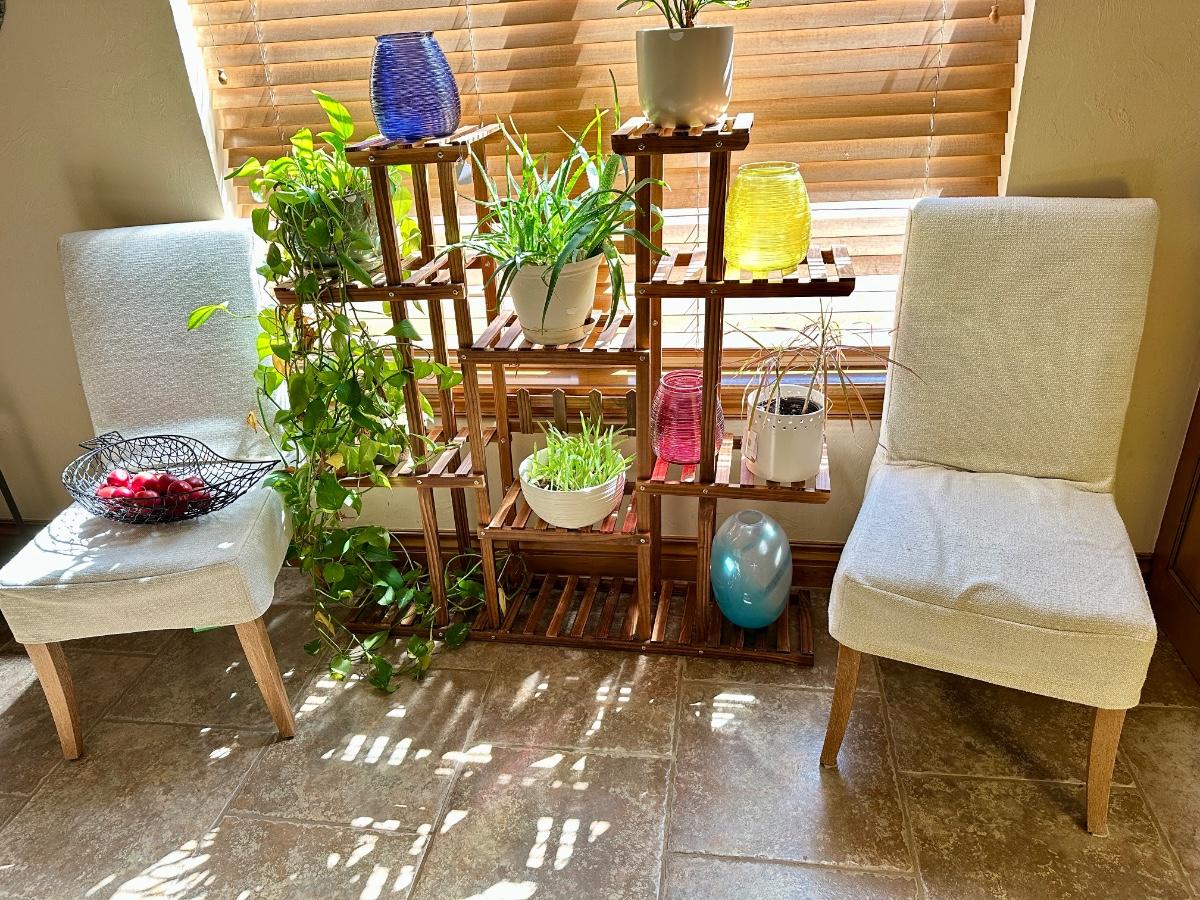 Furniture - Wooden Plant Stand w/ live plants, decor and Black Parsons Chairs w/white covers