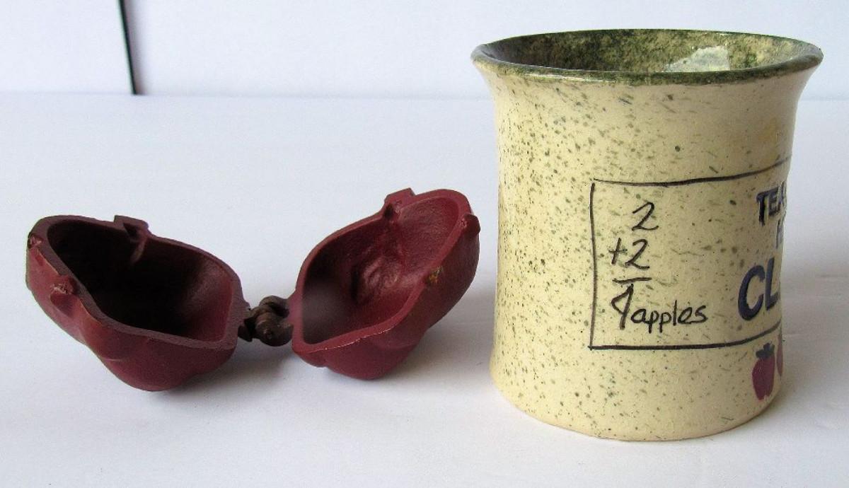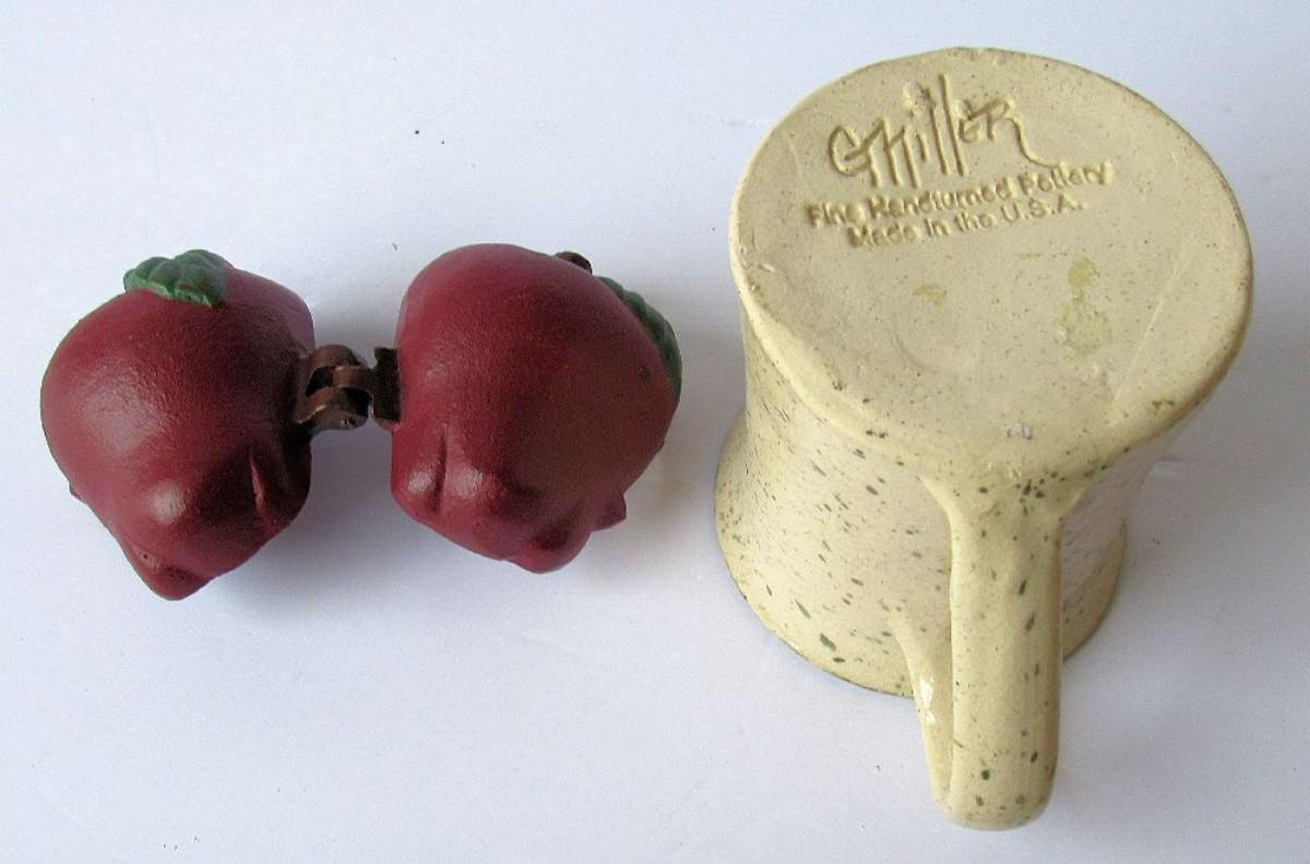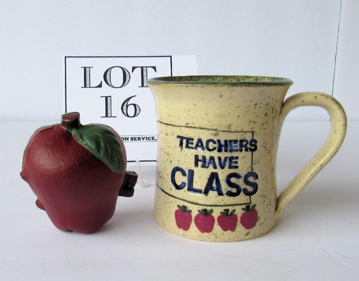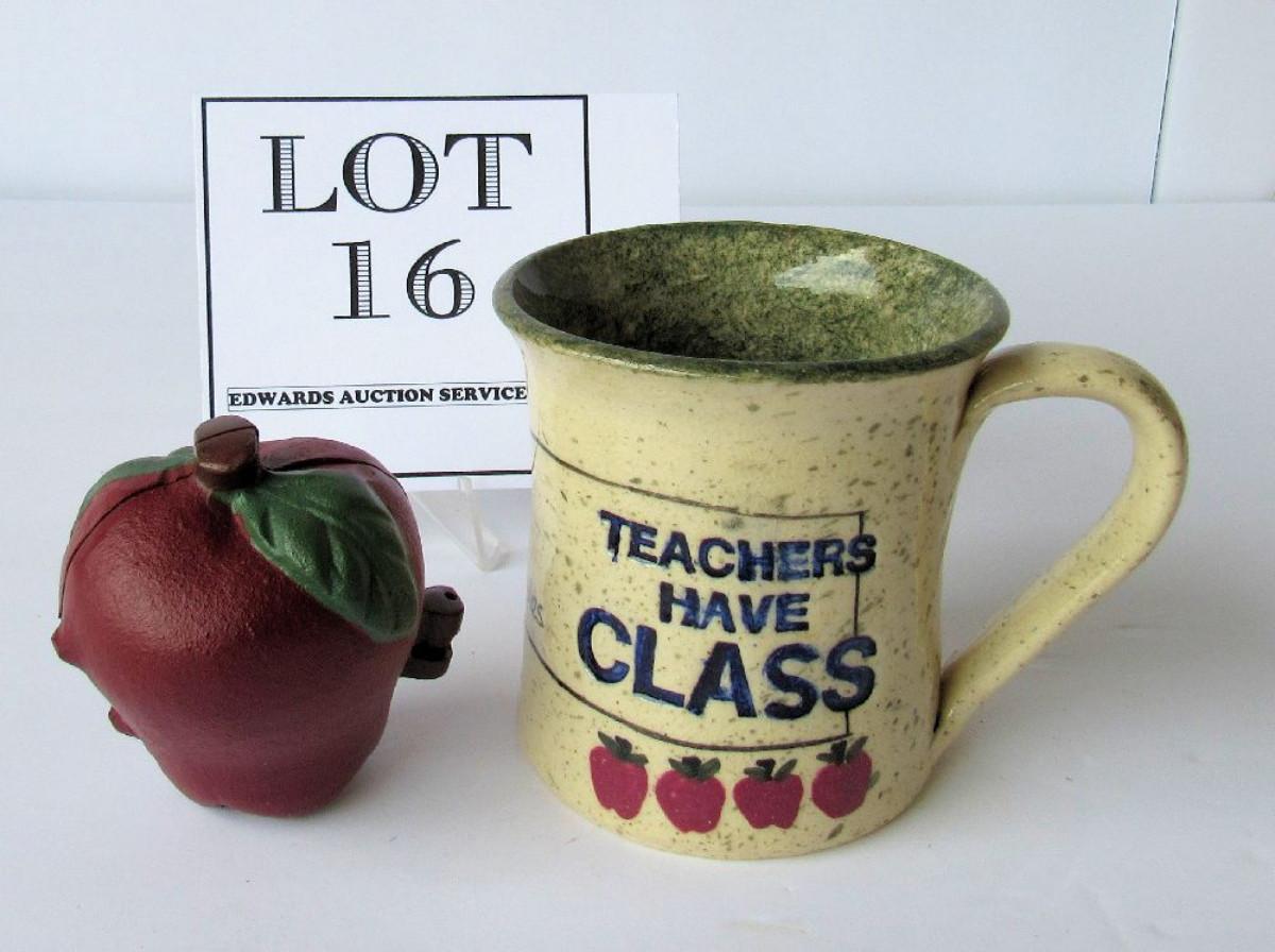 G Miller Hand Painted Pottery Teacher's Mug and Heavy Metal Apple Box